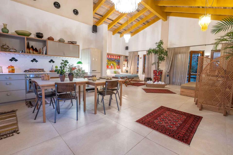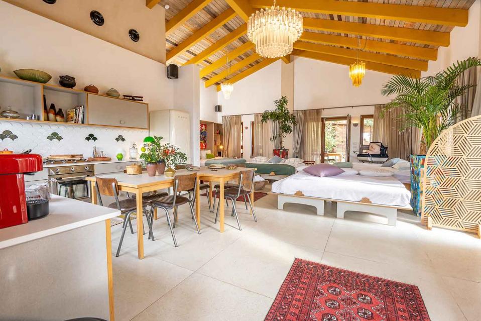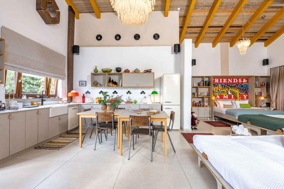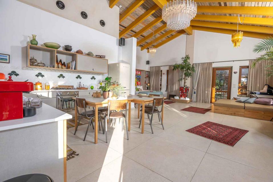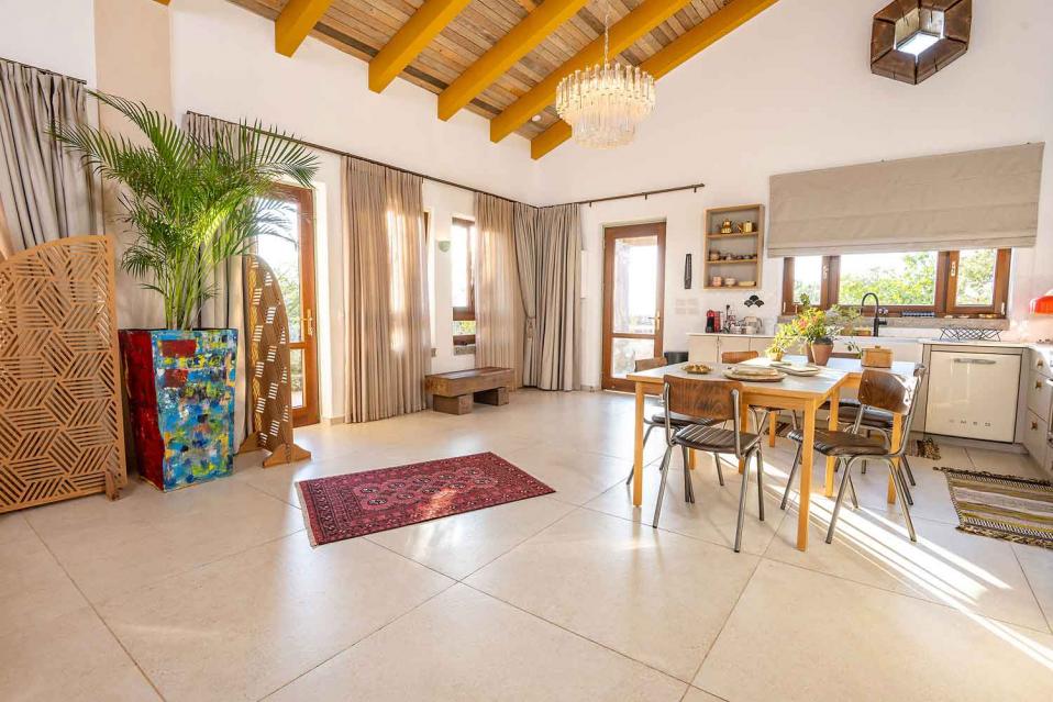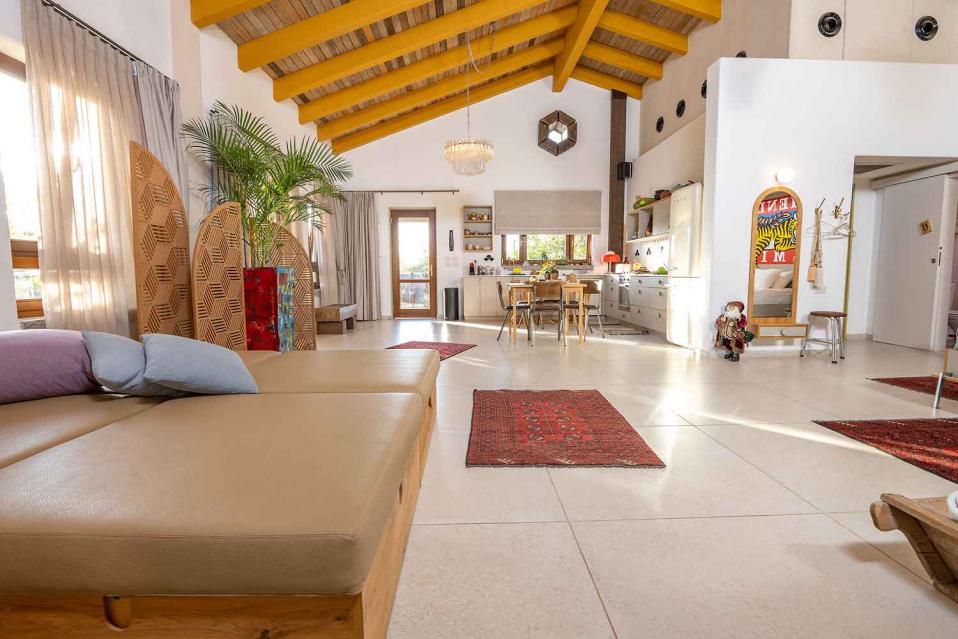 החלל הפנימי בנוי כיחידה אחת פתוחה, אבל התחושה היא של מקום שיש בו “שכבות”: אזורי ישיבה, אזור אוכל, מטבח מפנק, והכול זורם יחד — בלי לחלק את החוויה לחדרים נפרדים. התקרה הגבוהה מעץ והחלונות הגדולים מכניסים המון אור טבעי, והטבע מורגש גם כשנמצאים בתוך החלל בזכות פתיחות חכמה, פתרונות הצללה לפרטיות, ונוף ירוק שמלווה מכל כיוון.