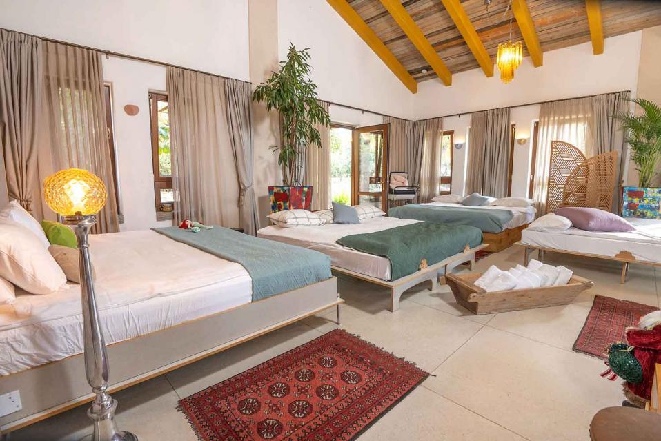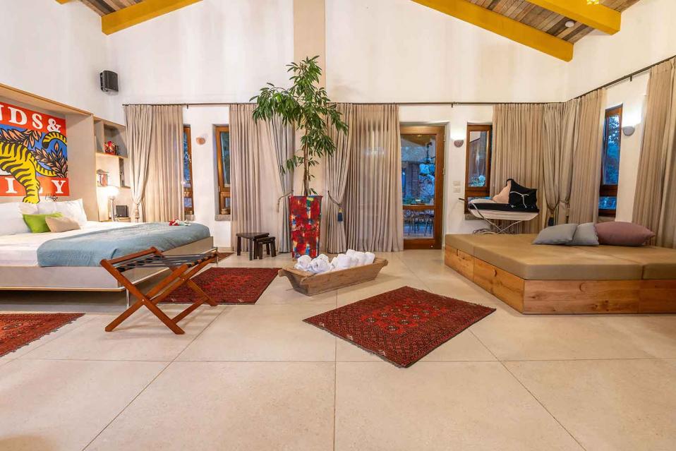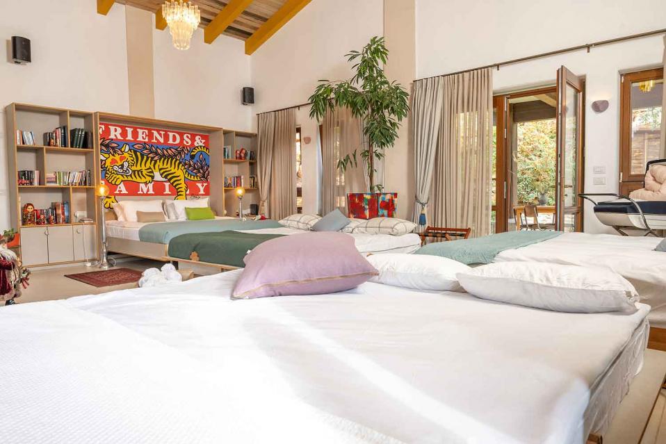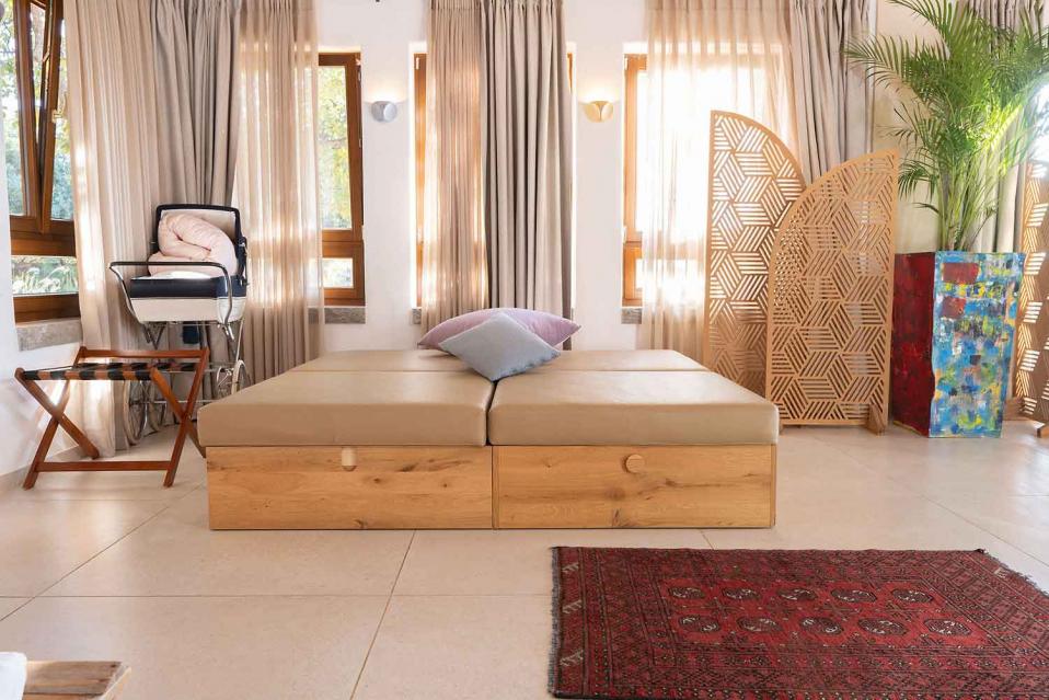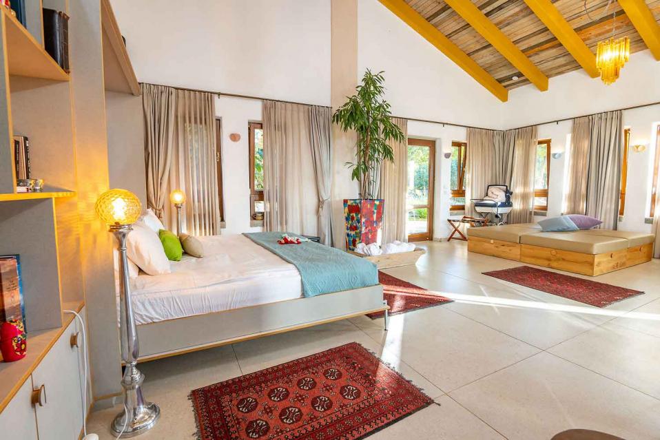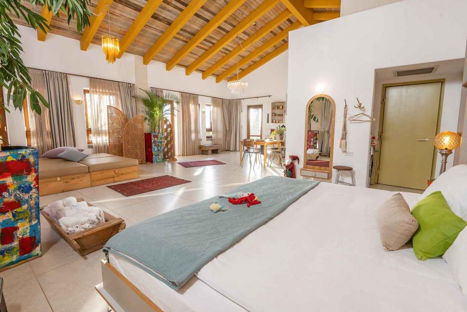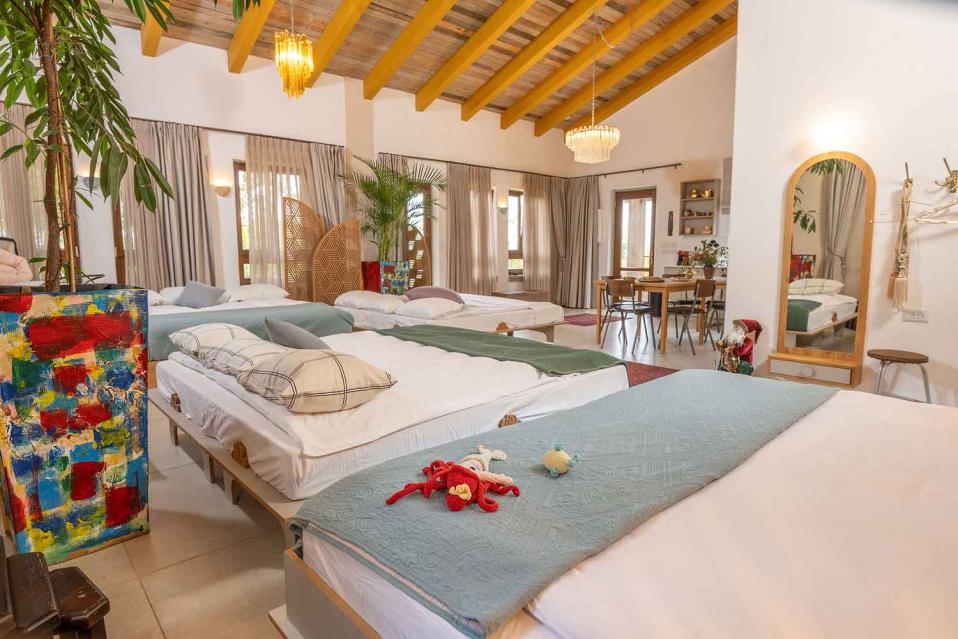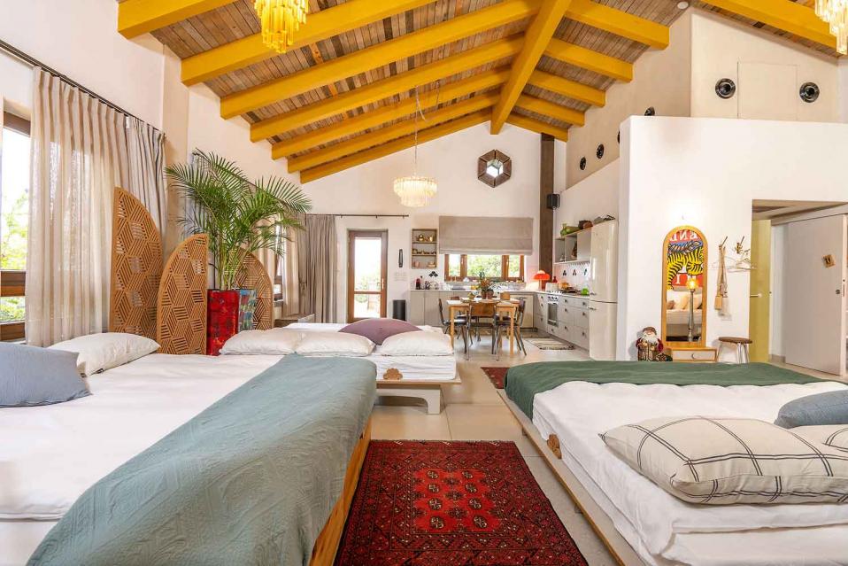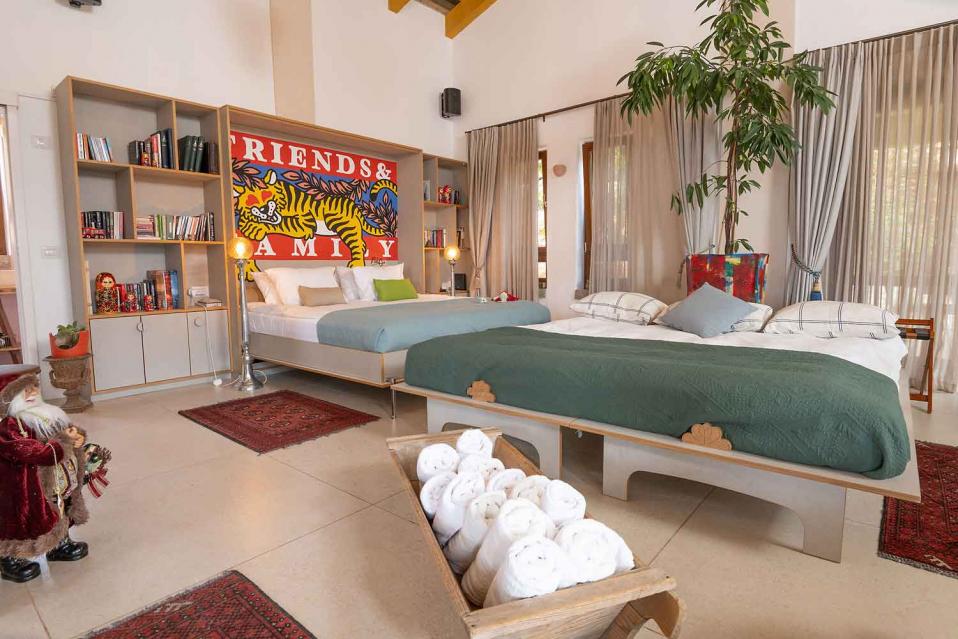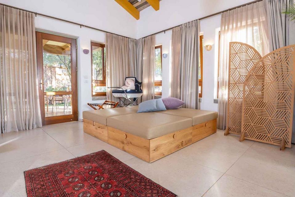סידור הלינה מתבצע לפי ההזמנה, עם מיטות ומזרנים איכותיים מאוד. המיטה הזוגית בגודל 2 מטר, והאירוח מתאים לזוג, למשפחה או לקבוצת חברים וחברות – עד 15 נפשות.