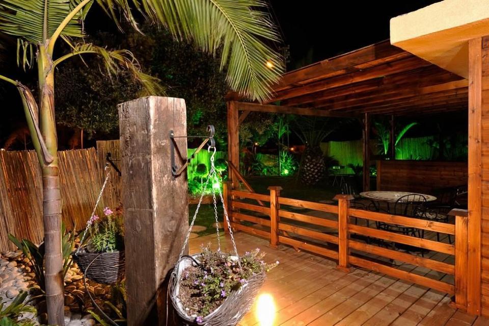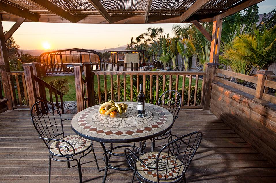 מתחם החוץ של האחוזה צופה לנוף הרי הגליל ומעוצב כגן מטופח רחב ידיים ובו מדשאות רכות, עצי נוי ופרי, ערוגות פרחים ותבלינים. במרכז המתחם ממוקם חדר אוכל מרווח עם מטבח מאובזר, לרשות כל האורחים.