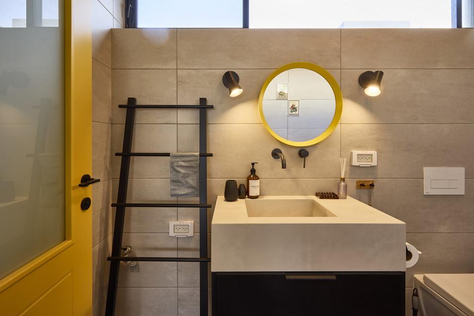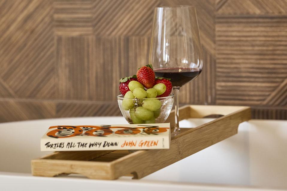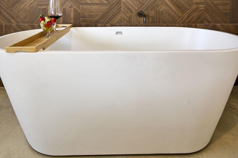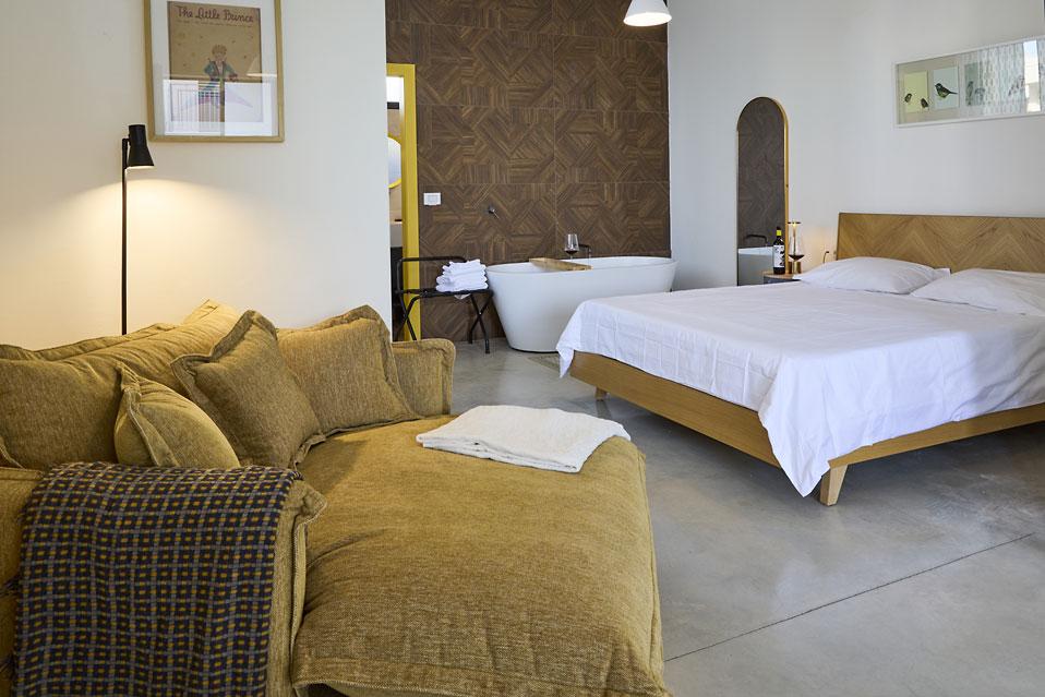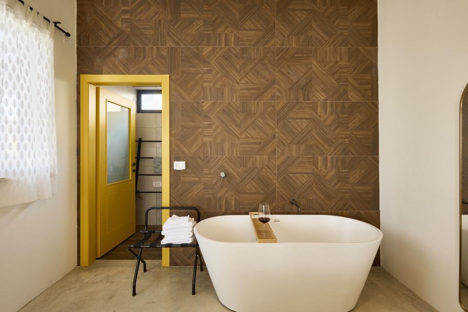 אחד האלמנטים הכי מיוחדים בסוויטה הוא אזור הרחצה, שמוסיף אווירה רומנטית ומפנקת במיוחד: חדר הרחצה עצמו סגור, אך האמבטיה ממוקמת בסמוך למיטה – בתוך חלל החדר. מדובר באמבטיית Freestyle מרשימה עם נוכחות, שמקבלת עומק ועיצוב בזכות קיר מחופה בקרמיקה בסגנון כפרי. השילוב בין המודרני לחמים יוצר תחושה של ספא פרטי: תאורה נעימה, שקט מסביב ורגעים קטנים שמרגישים כמו חופשה אמיתית.