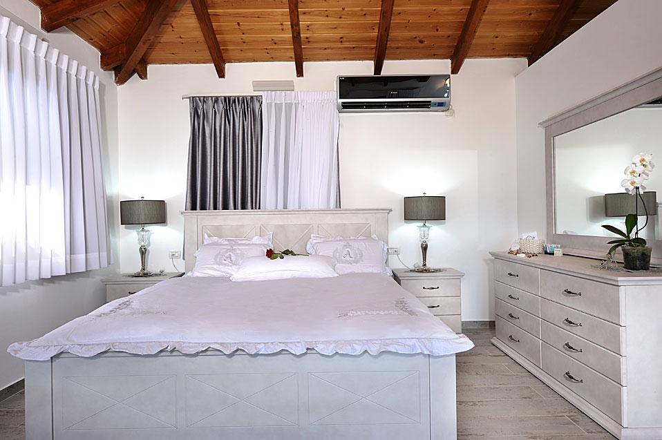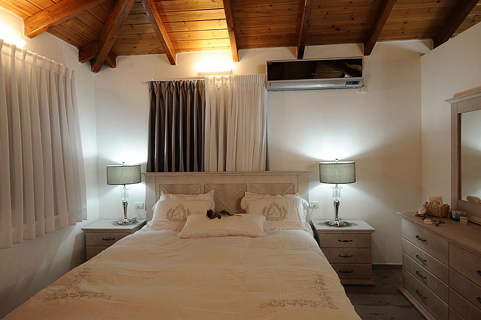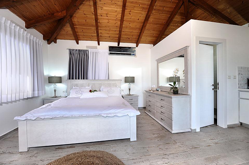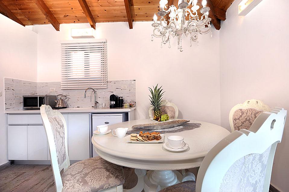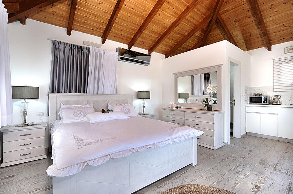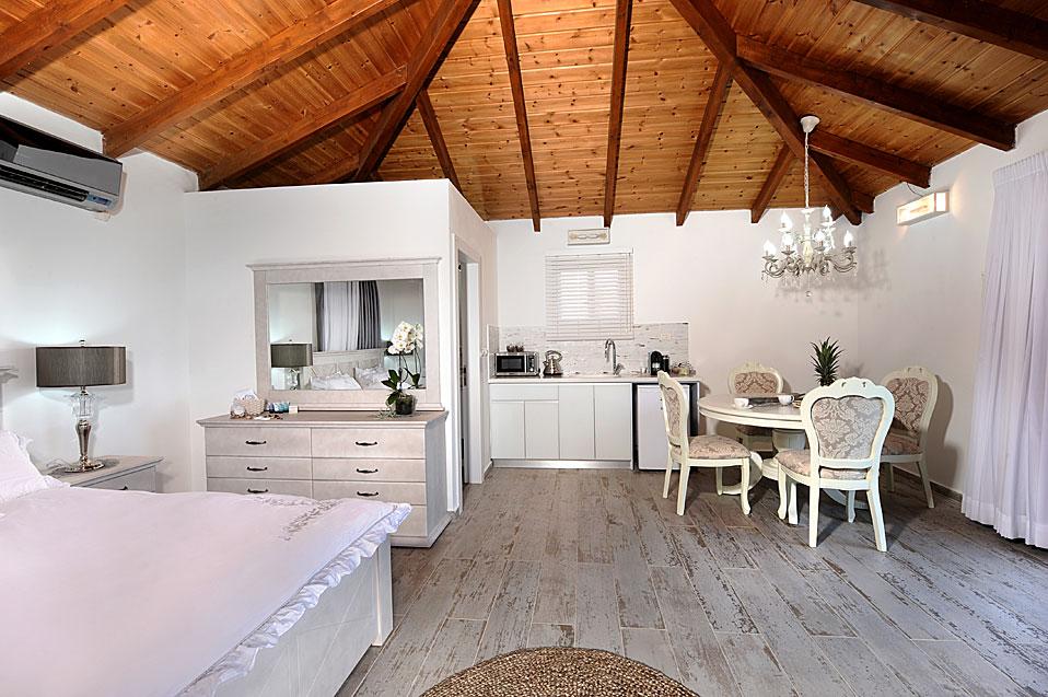 בפנים – ג'קוזי מלבני ענק מול החלון, שולחן אוכל מפואר, מסך תלוי מתכוונן עם חיבור לUSB וערוצי YES, מיטת שינה מפנקת עם מזרן אורתופדי, ומטבחון כפרי עם מכונת אספרסו, מקרר, מיקרוגל וקומקום חשמלי. בחדר רחצה היפיפייה מותקן מקלחון ראש גשם.