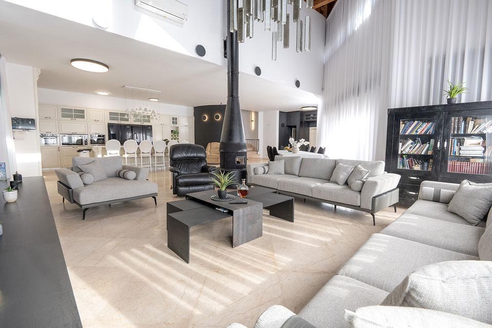 חלל מרכזי מרשים עם תקרה גבוהה, חלונות ענק לנוף, אח עצים, ספות מפנקות וטלוויזיה חכמה