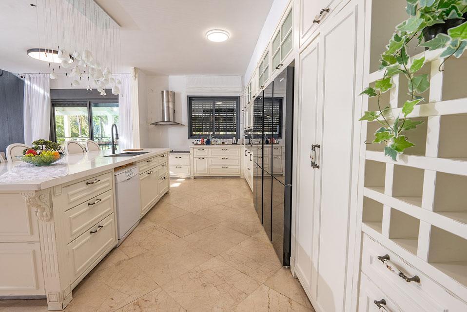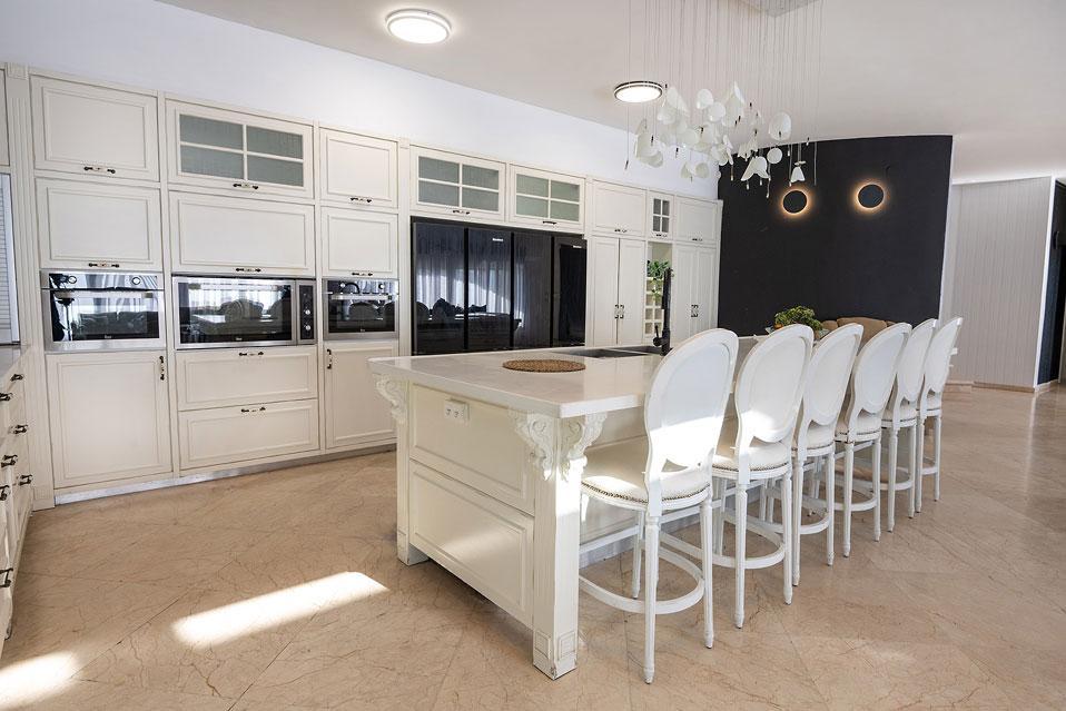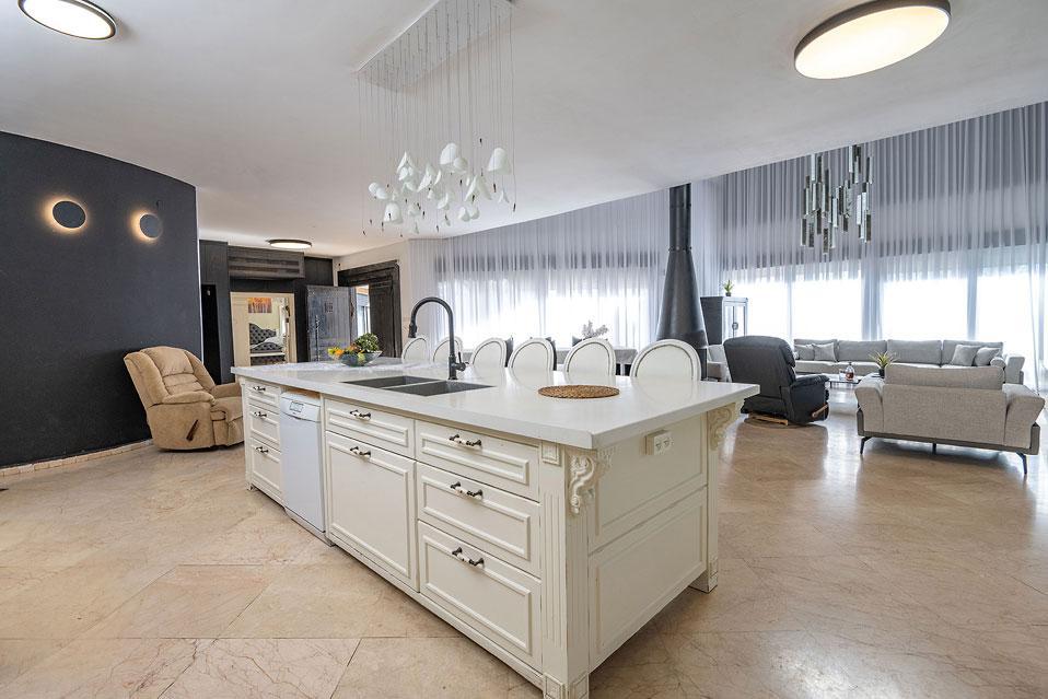 מטבח גדול ומאובזר ברמה גבוהה – כולל אי ישיבה, כיריים, תנור, מקרר כפול, מכונת קפה, כלי הגשה ובישול