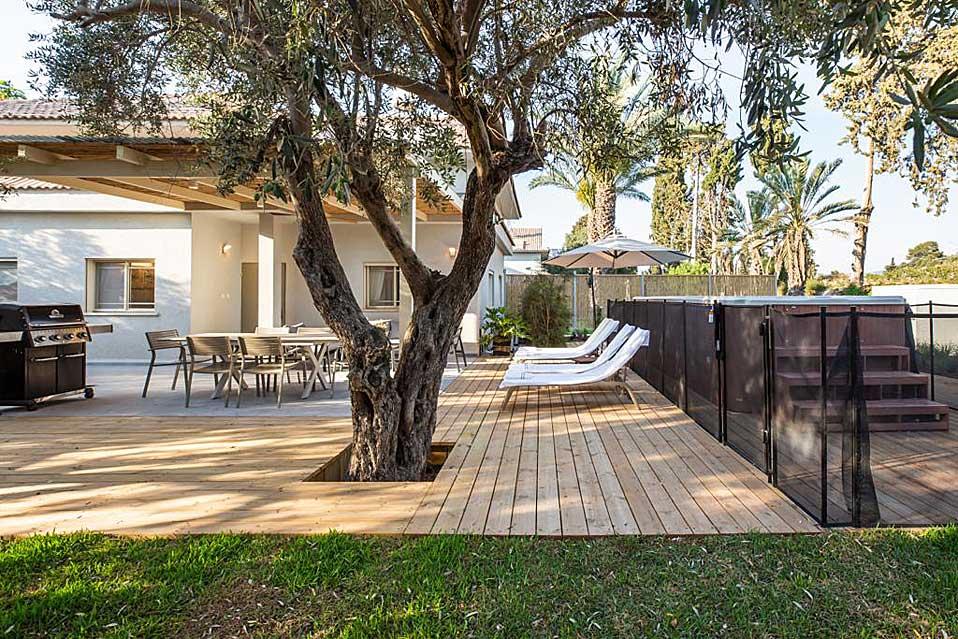 בחצר הבית בריכה מחוממת, מדשאות רחבות, פינות ישיבה ושיזוף, עמדת ברביקיו ומטבחון חיצוני.