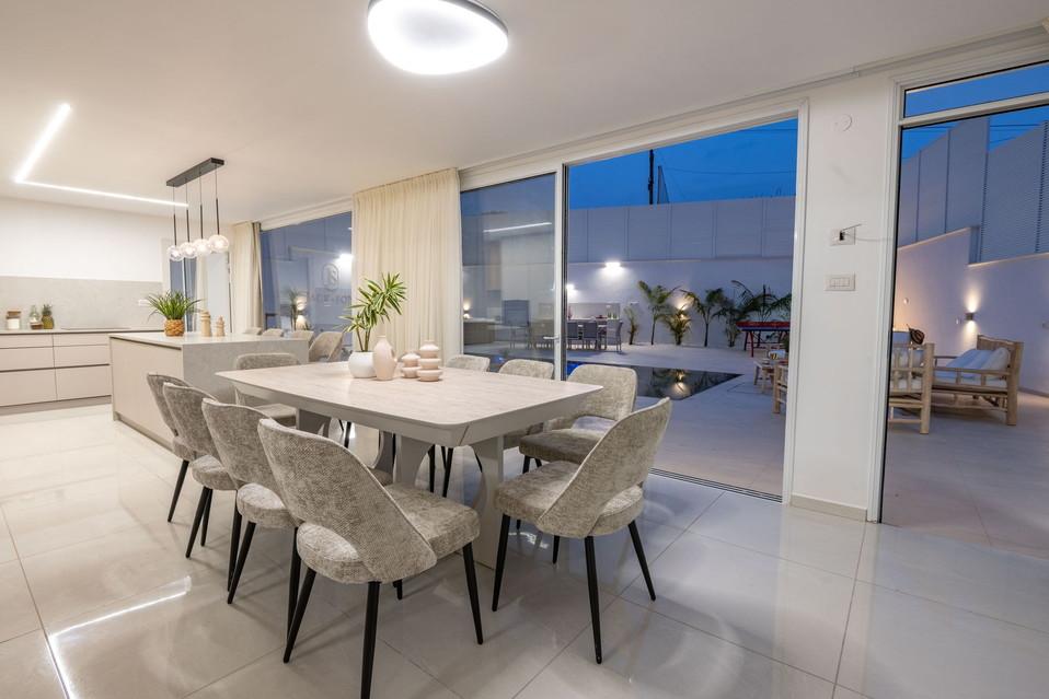 החללים הפנימיים של וילה גקסון חדישים ומעוצבים בקו חם ויוקרתי. במרכז הבית מחכים סלון נעים, שולחן אוכל פנימי, ומטבח עם אי עבודה — שילוב שנותן תחושה של בית איכותי שמיועד לאירוח ברמה גבוהה.