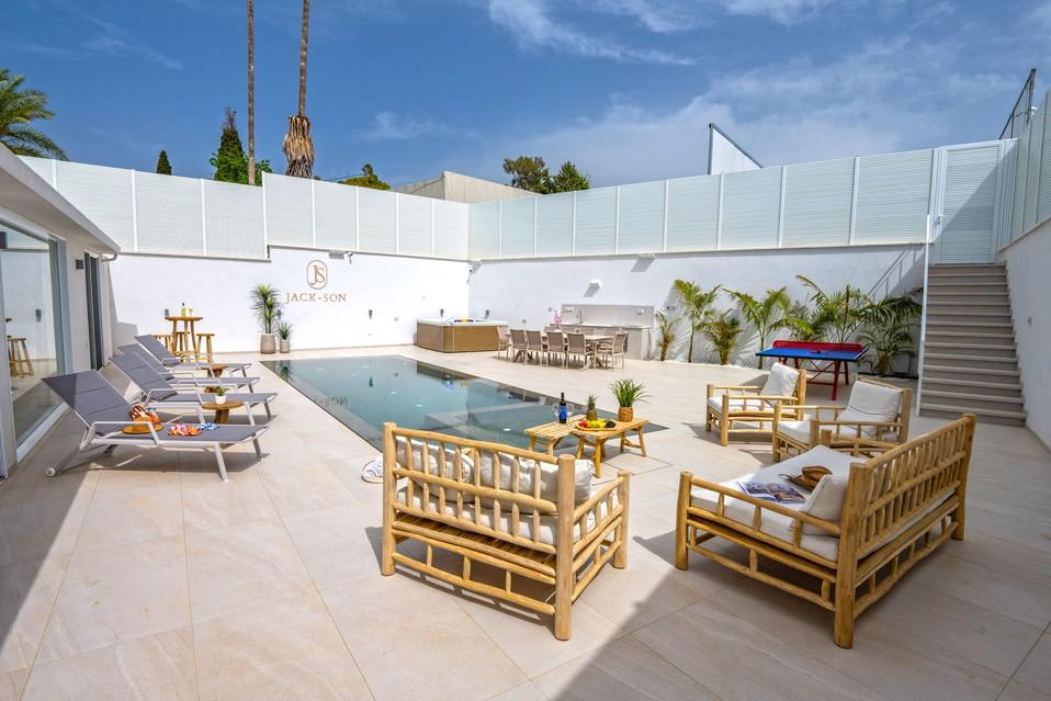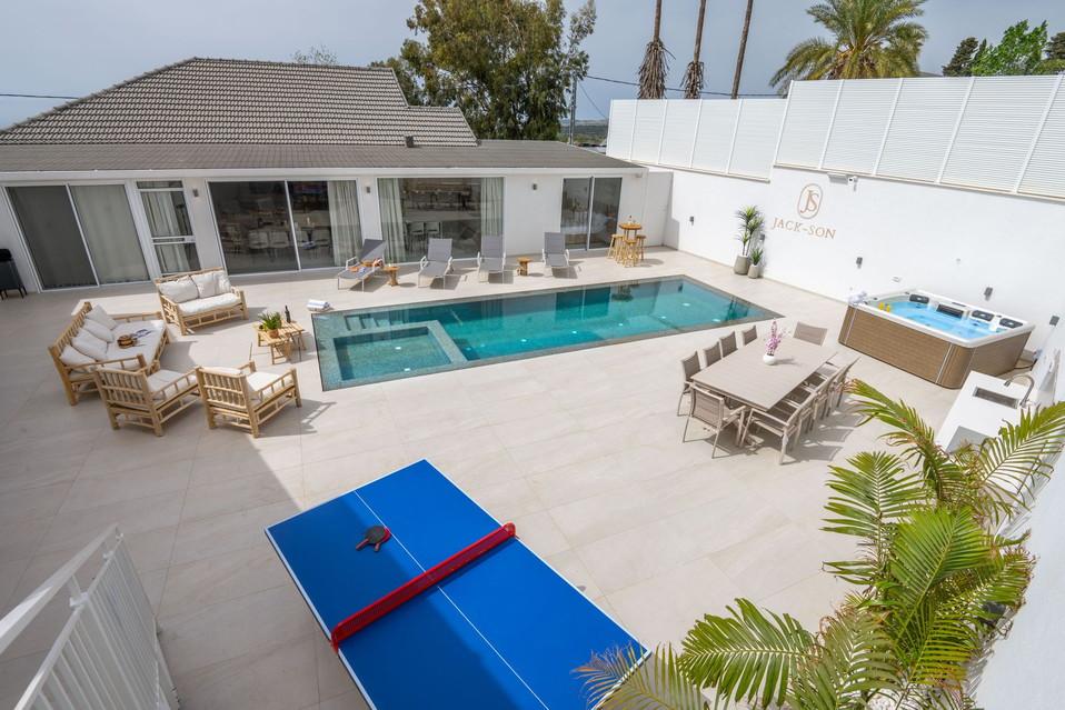 חצר מאובזרת לאירוח – סלון חוץ, כיסאות שיזוף, שולחן גדול ופינג פונג