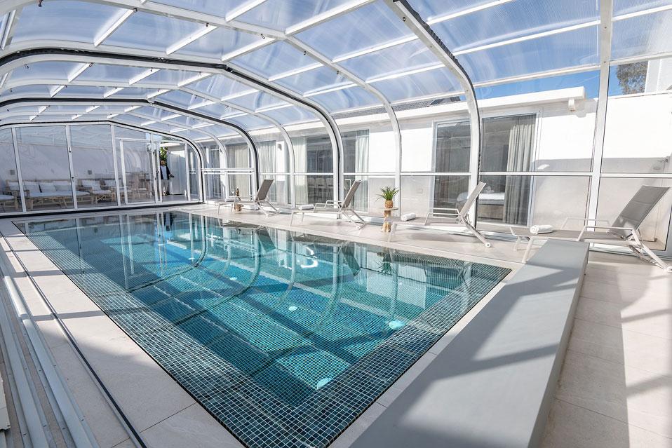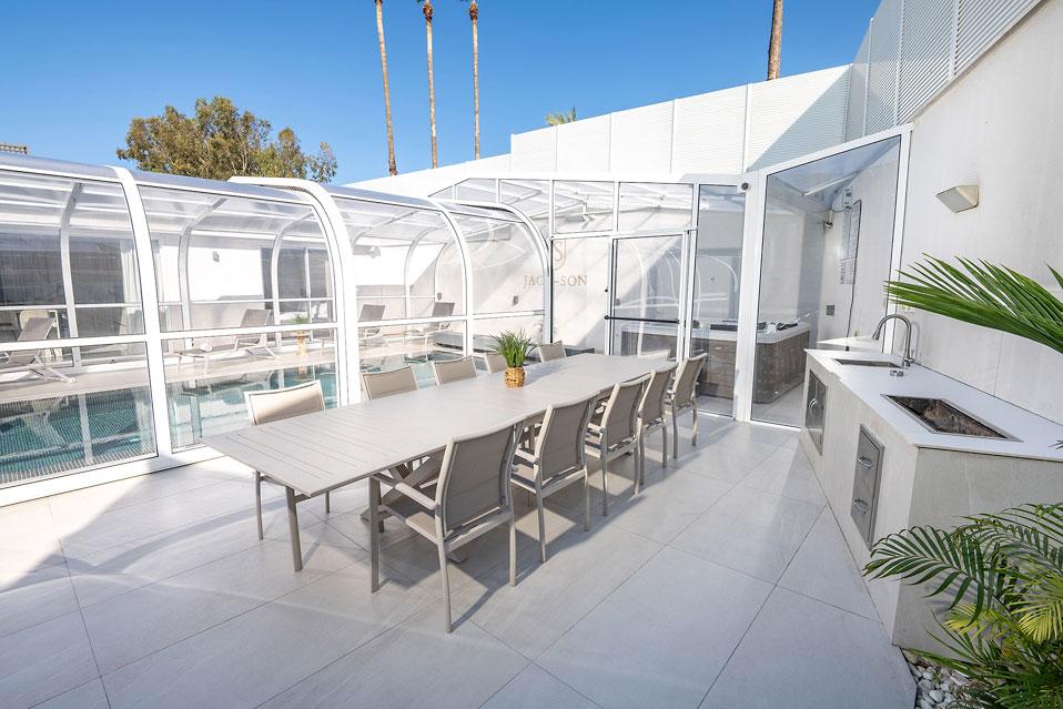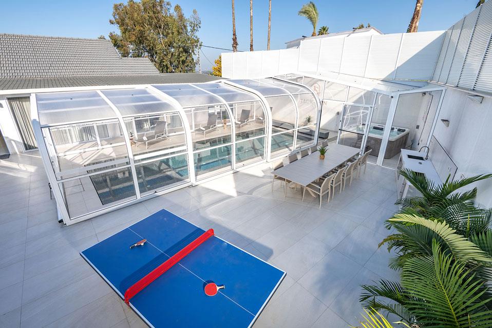 במרכז החצר נמצאת בריכה מחוממת בגודל 9.5×3.5 מטר, מתוחזקת בצורה מושלמת. אחד היתרונות הייחודיים כאן הוא קירוי על גלגלים, שמאפשר להפוך את הבריכה למקורה או פתוחה ברגע אחד — פתרון נוח במיוחד לשילוב בין שמש לצל