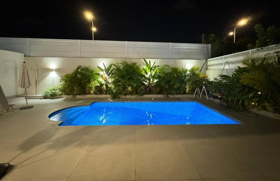 אחד היתרונות הבולטים בווילה מאיה הוא שטח החוץ הגדול במיוחד: חצר רחבת ידיים עם בריכה מרשימה, עטופה בצמחייה טרופית שמוסיפה אווירה של ריזורט. סביב הבריכה תמצאו אזורי ישיבה וריהוט גן, שמשיות לנוחות בשעות החמות, וגם מקלחון חוץ שמקפיץ את החוויה ביום-יום של החופשה.
