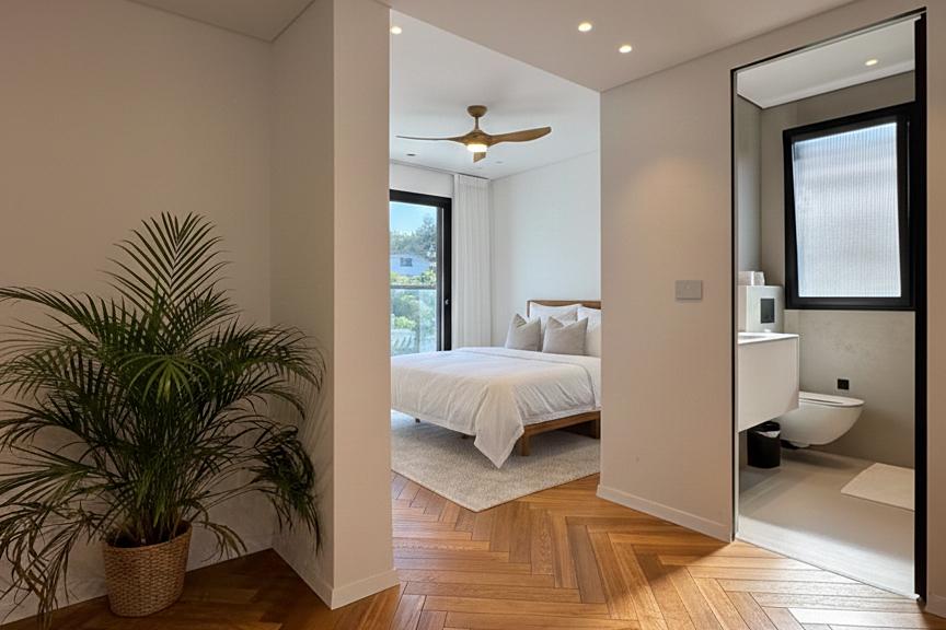 קומה ראשונה – סוויטת מאסטר: חדר מאסטר גדול במיוחד עם חדר רחצה פרטי, מיטה זוגית רחבה ומסך טלוויזיה גדול.