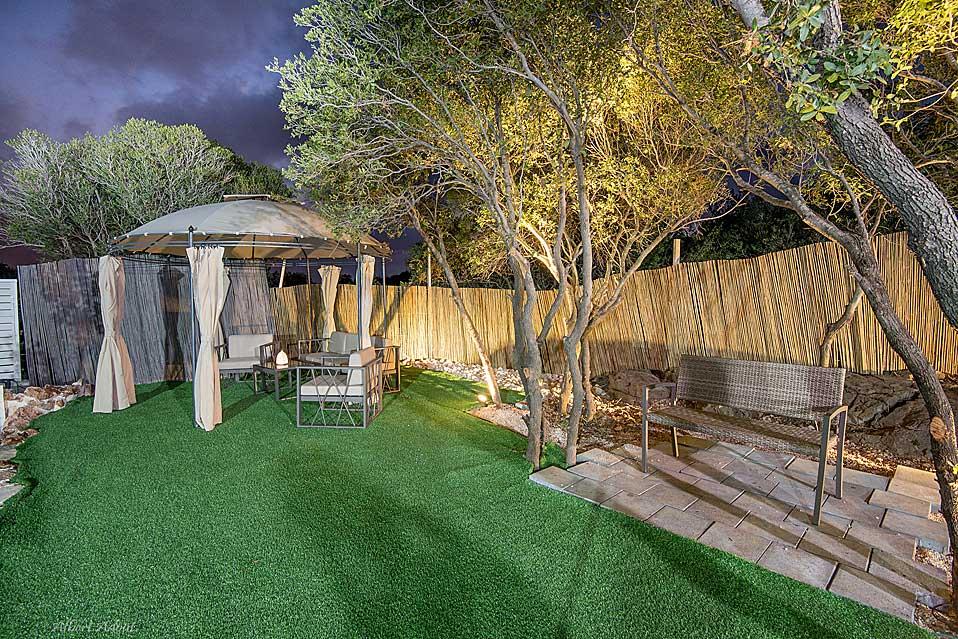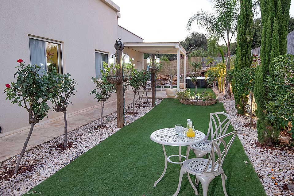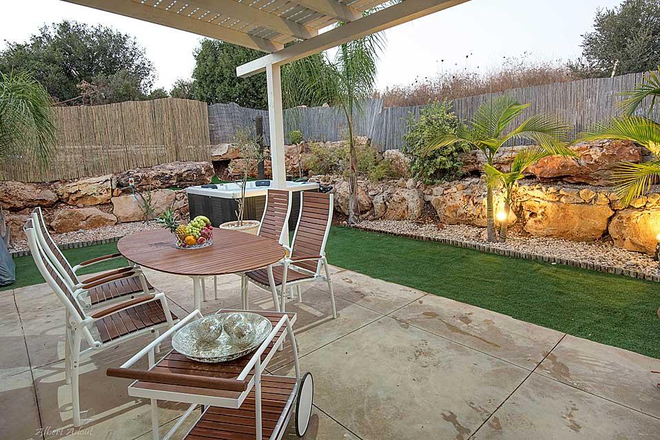 חצר המתחם גדולה במיוחד ומתכתבת בסגנונה עם הטבע הגלילי הפראי סביב. בחצר בריכה שחיה בנויה באבן לבנה עם מדרגות ירידה למים (מחוממת בחורף), מיטות שיזוף, שמשיות, ג'קוזי ספא, כורסת קונכייה, מדשאות ירוקות, שולחנות אוכל, פינת ברביקיו מאובזרת, עצים, פרחי נוי, שולחנות קפה והרבה פינות חמד נעימות.