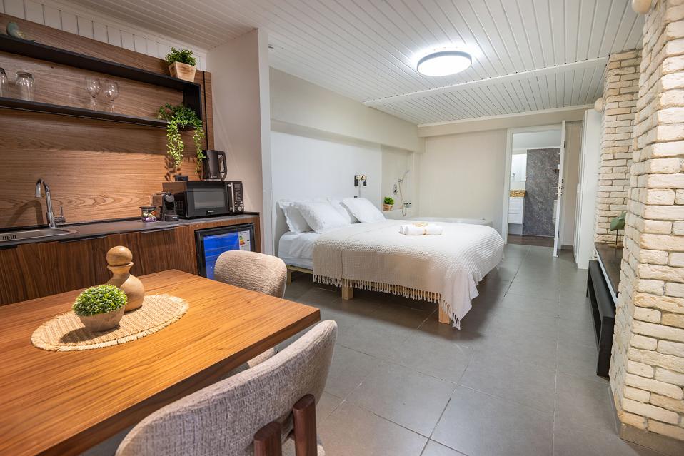 מיטה זוגית איכותית וגדולה, מטבחון, טלוויזיה, תאורה חמימה ומרפסת פרטית עם פרגולה