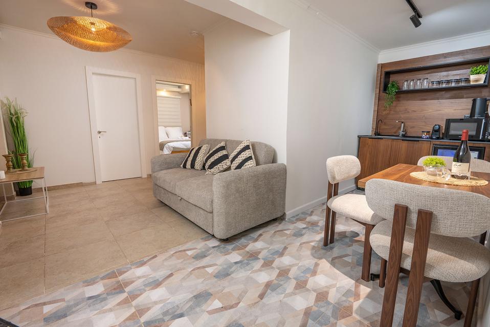 מטבחון מאובזר, טלוויזיה חכמה, חלל אירוח נעים, ומרפסת פרטית עם פינת ישיבה.