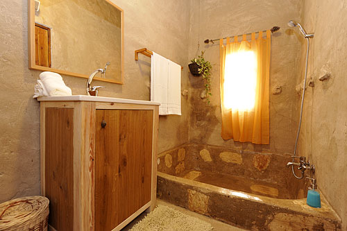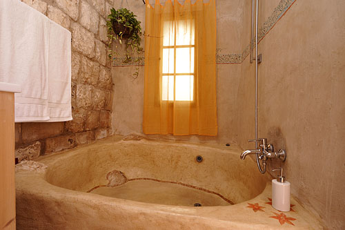 ערוגות ירקות העונה, צמחי התבלין הריחניים, צמחייה ירוקה ופרחונית, ובריכת דגים יקבלו את פניכם בכניסה לחדר המעוצב והמרווח שבקרקעית חדר האמבטיה שלו בנויה אמבטיית אבן ענקית.