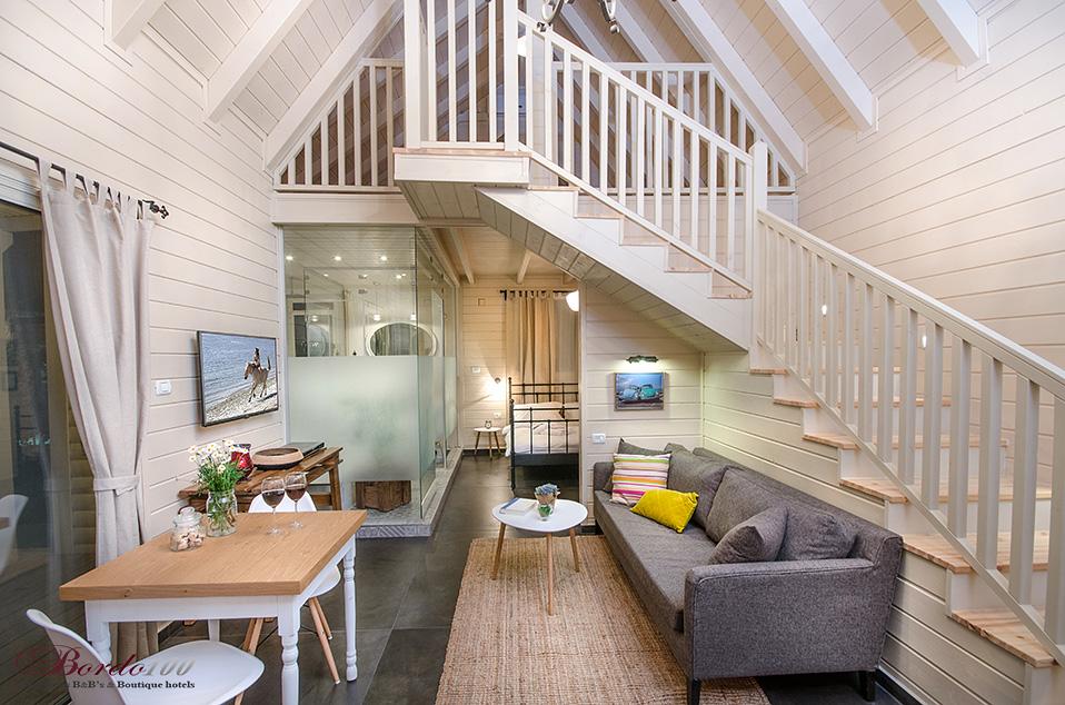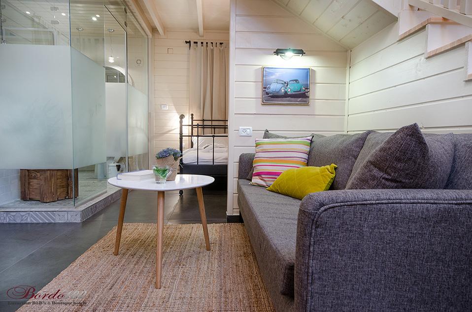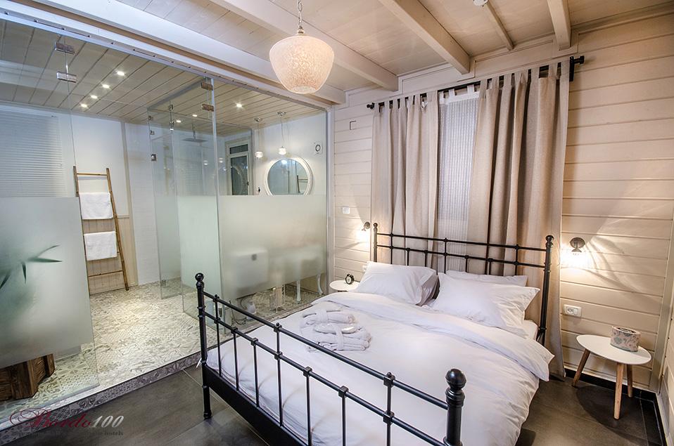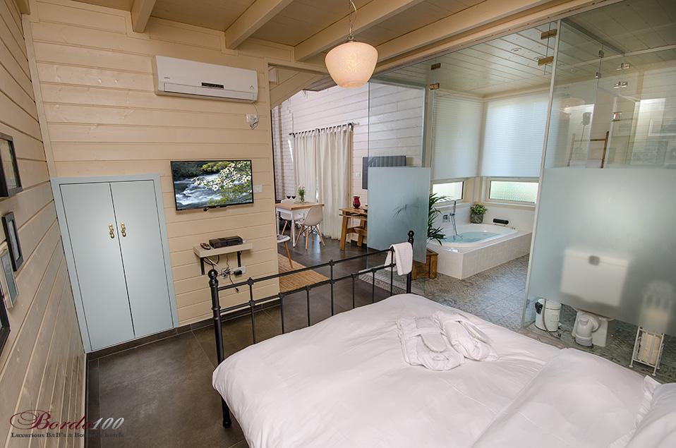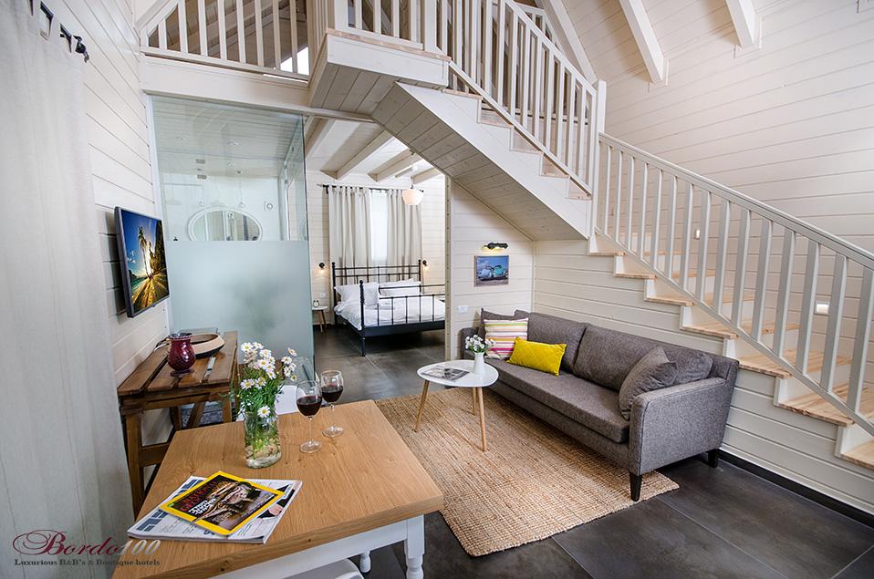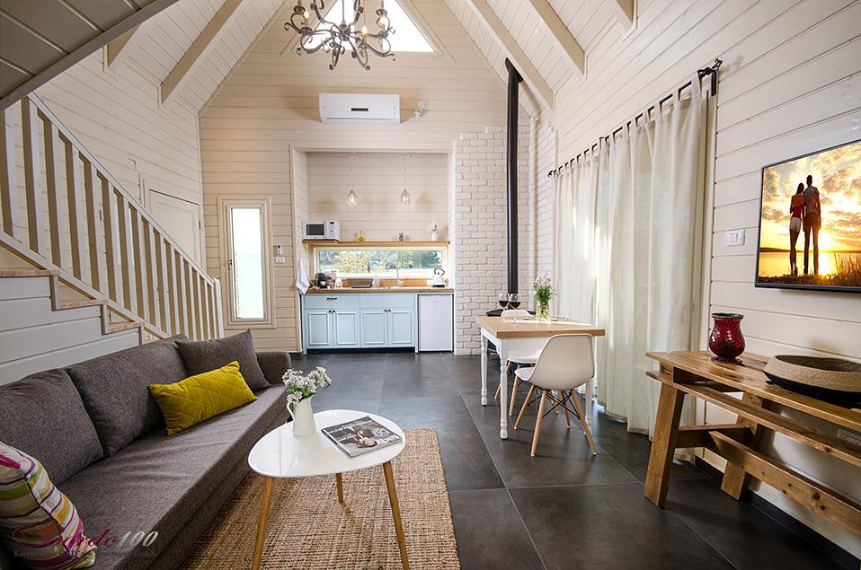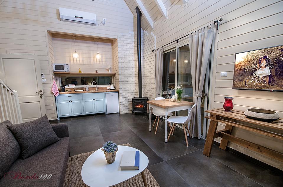 מתחם פרטי מוקף גינה עשירה, בקתת עץ מעוצבת ומדוגמת להפליאאורלי המקסימה מכניסה אותנו אל אחת הסוויטות היפות והנוצצות שפגשנו ונותנת לנו רגע להפנים. התמונות מדברות בעד עצמן - זוהי בקתת עץ כפרית מושלמת הכוללת קמין ונוף שדות פסטורלי הנשקף מהחלון ומסביב. קומת הכניסה מכילה את חדר השינה ובו מיטה איכותית ומזמינה, חדר רחצה מפואר כולל ג'קוזי זוגי מדליק, סלון ופינת אוכל, מטבחון מצוין לחופשה, מסך טלוויזיה - ובקיצור, כל מה שצריך בשביל חופשה מושלמת בצפון. בסוויטה יש קומת גלריה מגניבה במיוחד עבור ילדים - ובכלל, חצבני ביסוד המעלה הוא מסוג המקומות בהם ילדים (ומבוגרים) ירגישו בתוך אגדה.