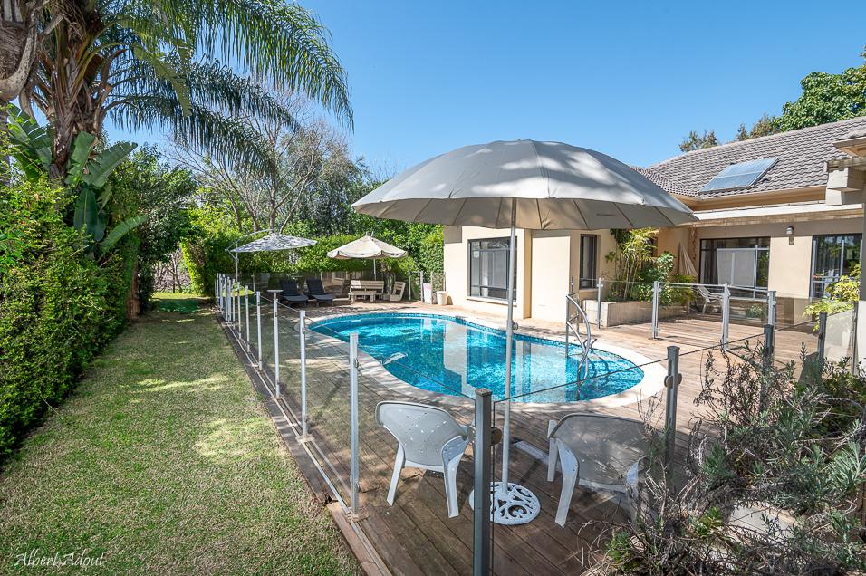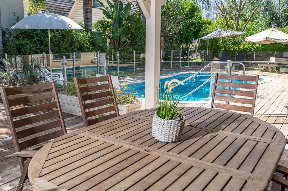 על דק העץ מול בריכת קיץ גדולה ויפה, בגן מלבלב המקיף את החצר הפרטית: בר בי קיו ביסוד*!