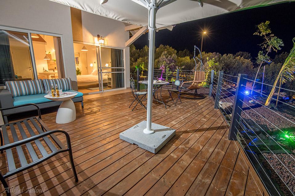 מתחם האירוח כולל 2 סויטות חדישות, מעוצבות להפליא ומאובזרות בג'קוזי פנימי זוגי ובריכת שחיה ממוקמת על שטח דק מרוצף ונמצא על נקודת תצפית מושלמת לנוף פנוראמי וקיעות מדהימות, המאפיינות את מצוק עורבים.