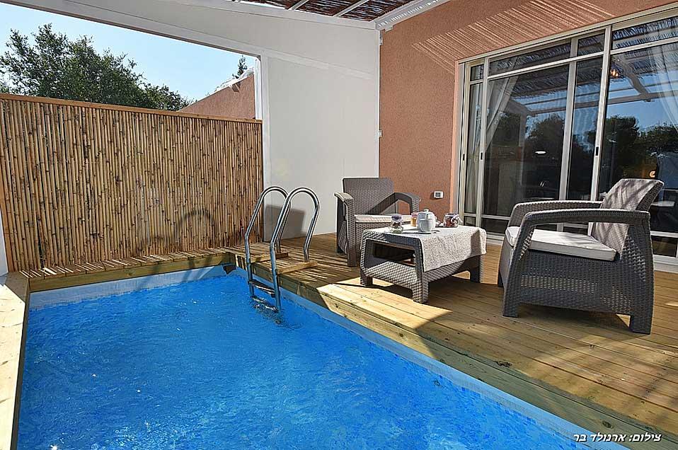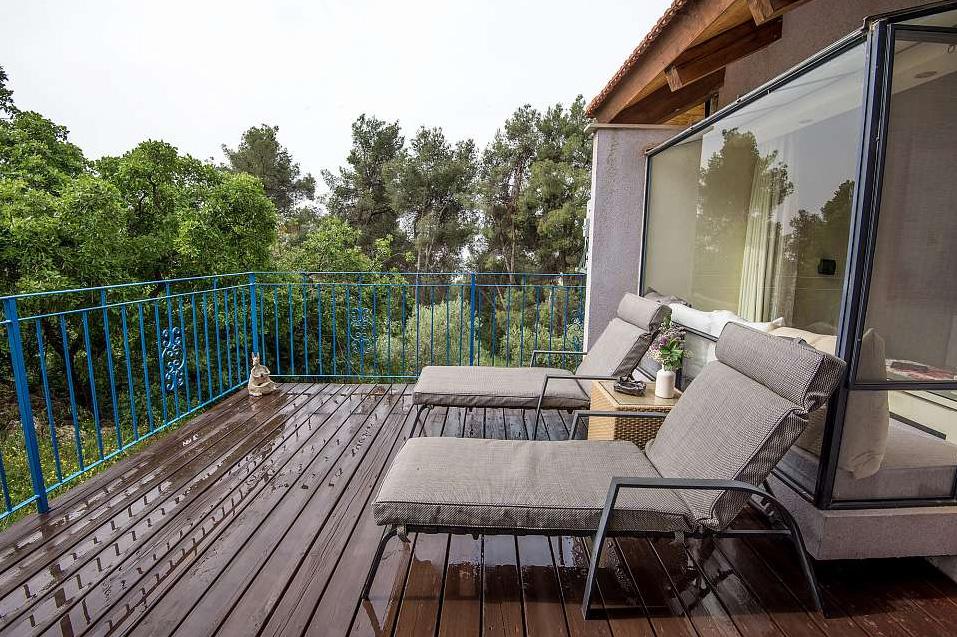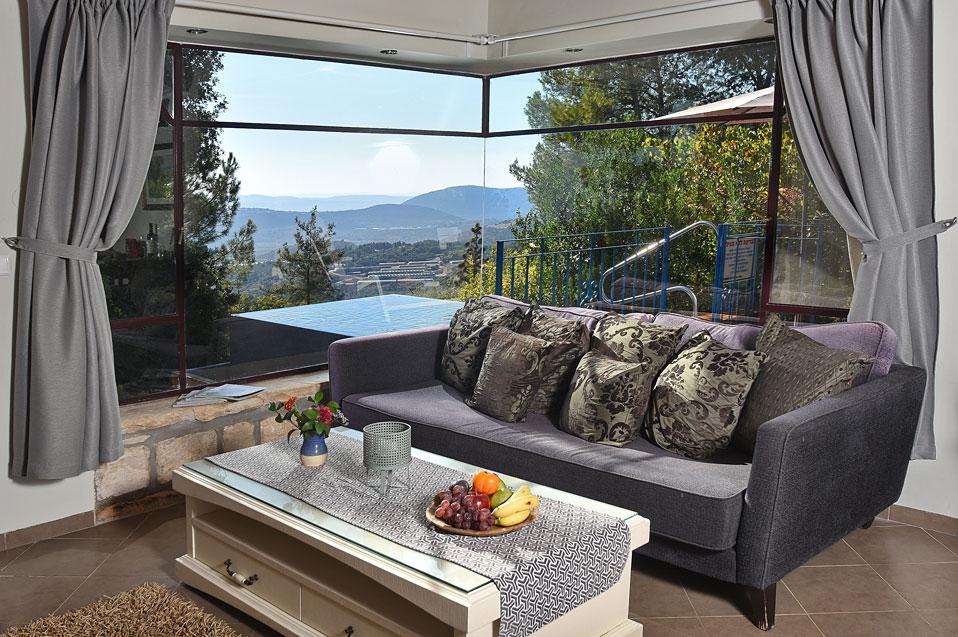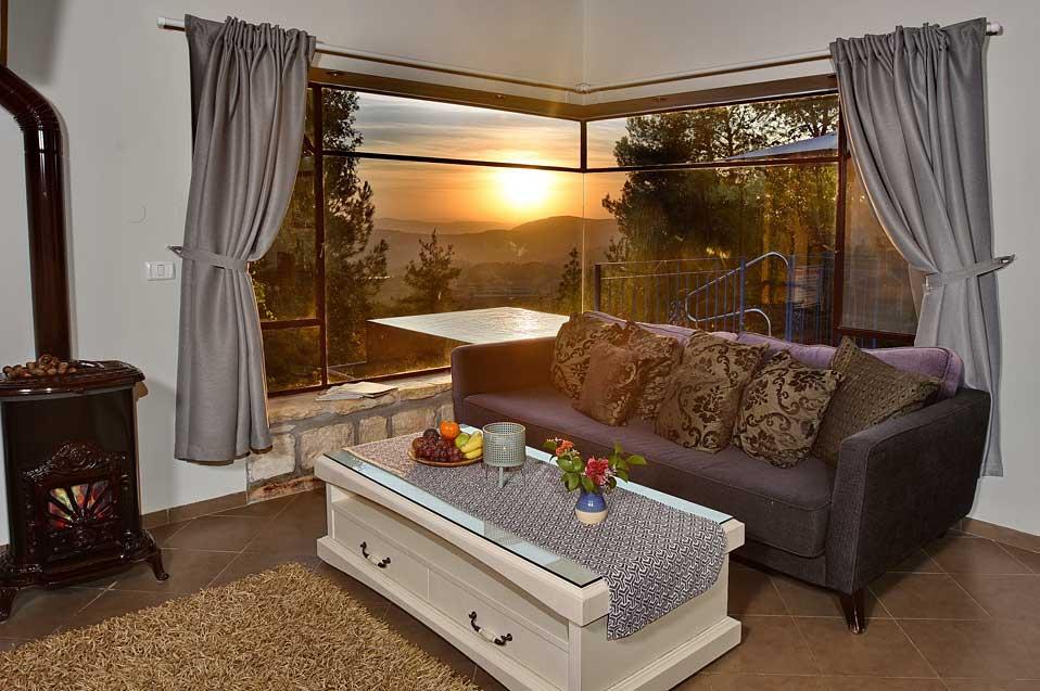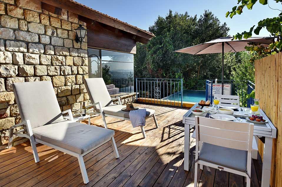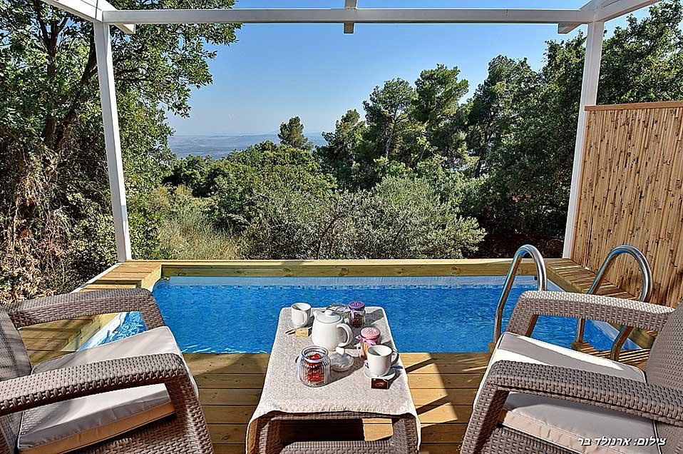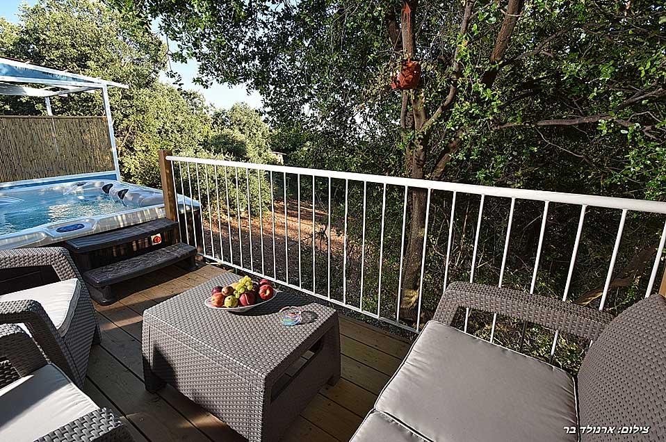 מתחם האירוח של נעימת החליל מוקף, כמו היישוב אמירים כולו, בשפע עצים וצמחייה ירוקה ועשירה. במתחם ארבע סוויטות נפרדות המעניקות פינוקים שונים - בריכות שחייה פרטיות השקועות בדק העץ שעל המרפסת וצופות לנוף פנורמי מרתק, סאונה פרטית, ג'קוזי או קמין עצים - המפרט משתנה אך החוויה נותרת מפעימה. הפרטיות מתחילה בחנייה ובשאר החופשה מלווה אותנו ציוץ הציפורים. אנחנו בגובה של כמעט 600 מטר, על הר בגליל העליון: בקיץ מזג האוויר נעים ואילו החורפים כאן מזמנים חופשות רומנטיות במיוחד, כשבחוץ סוער ובפנים מפצפץ האח.