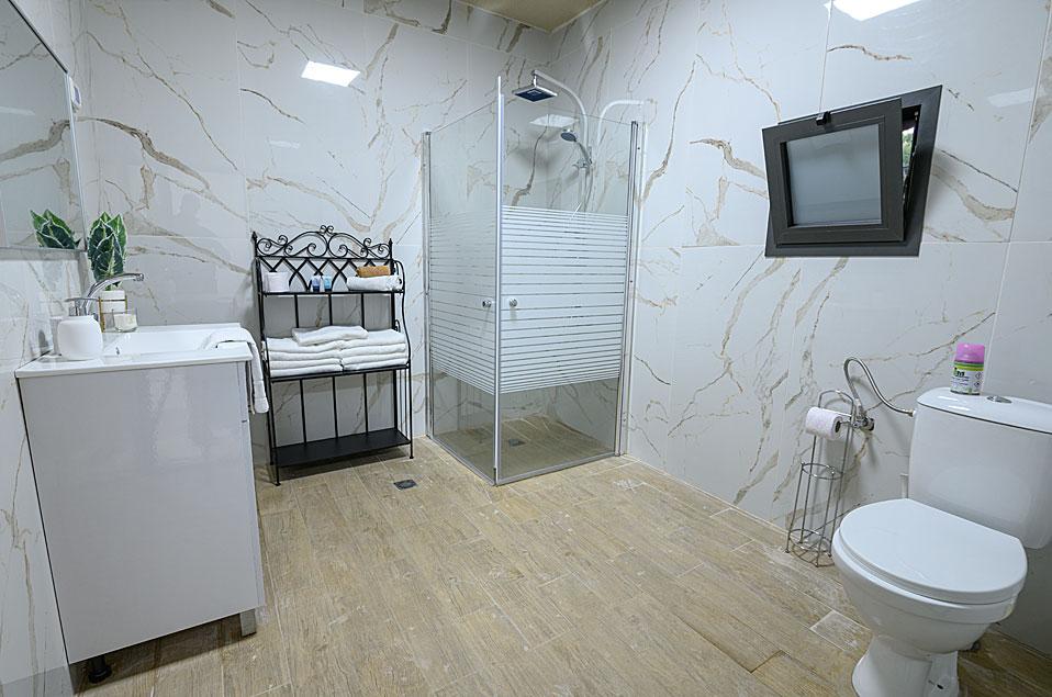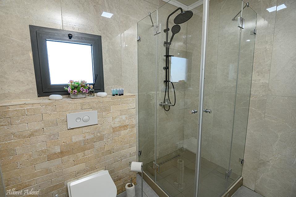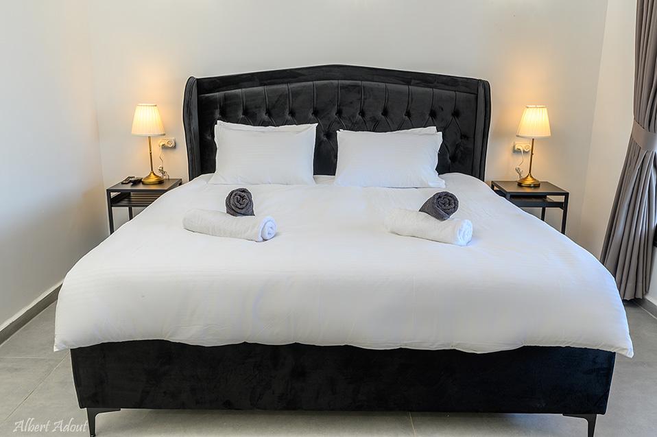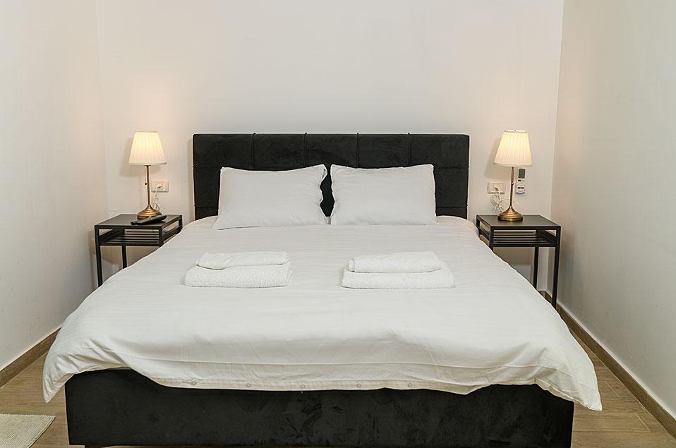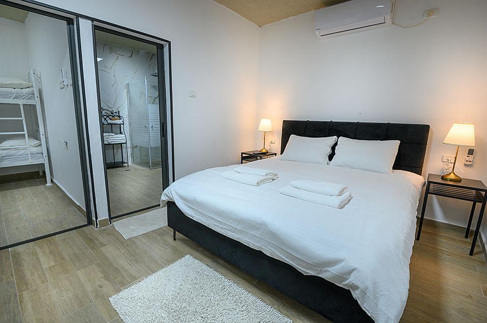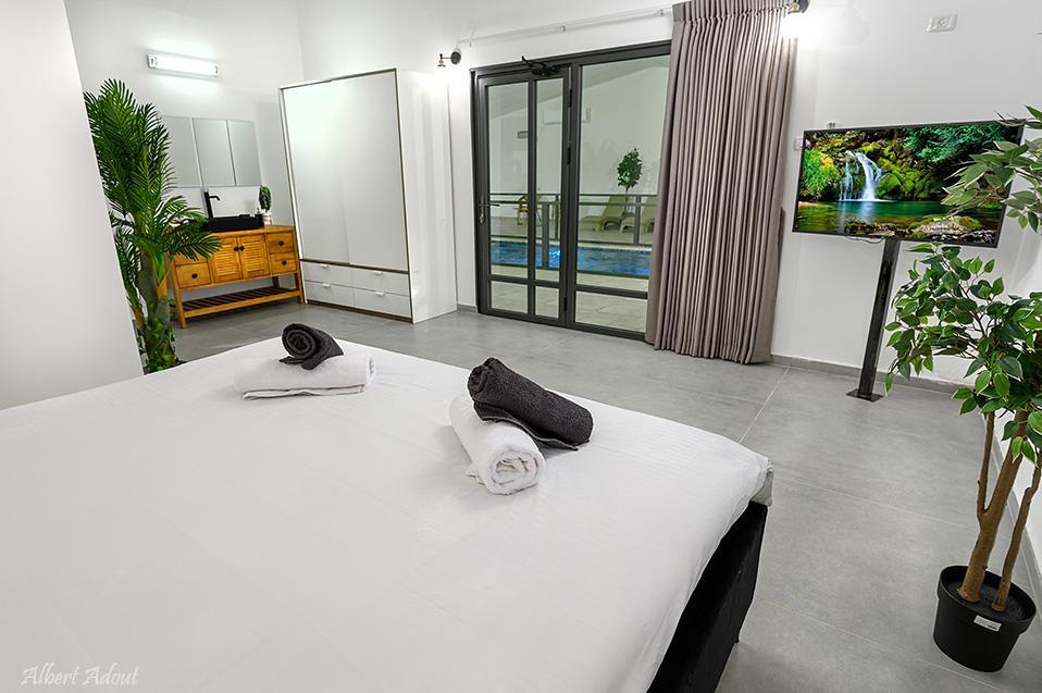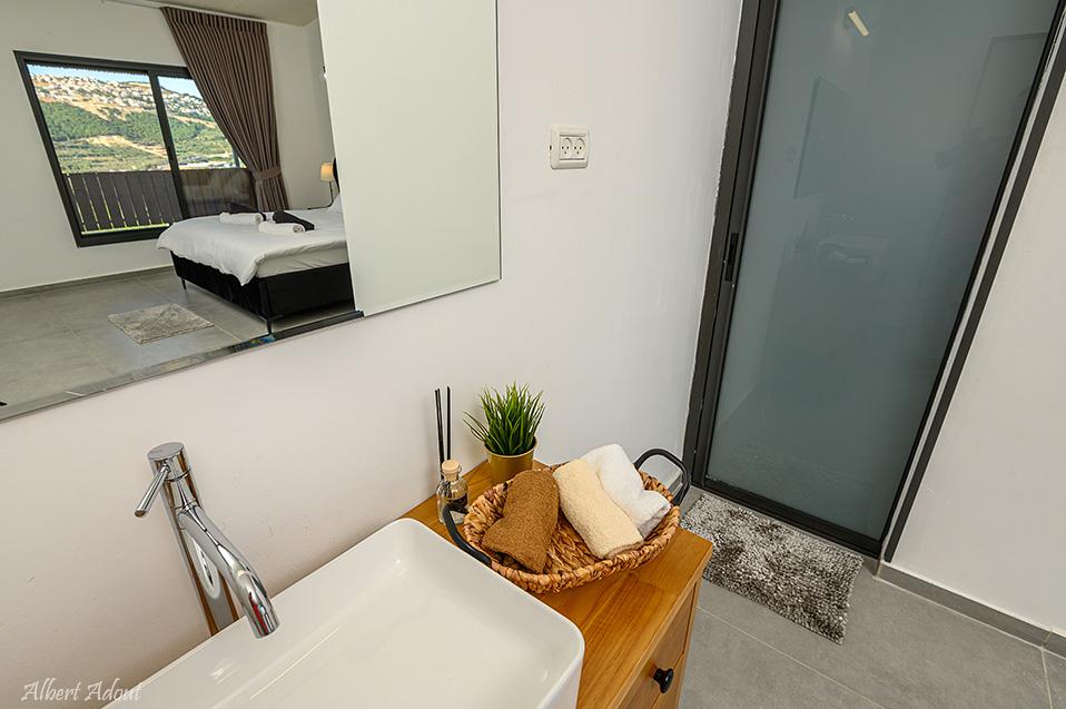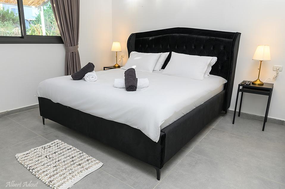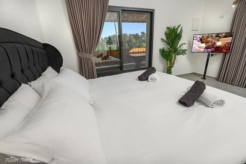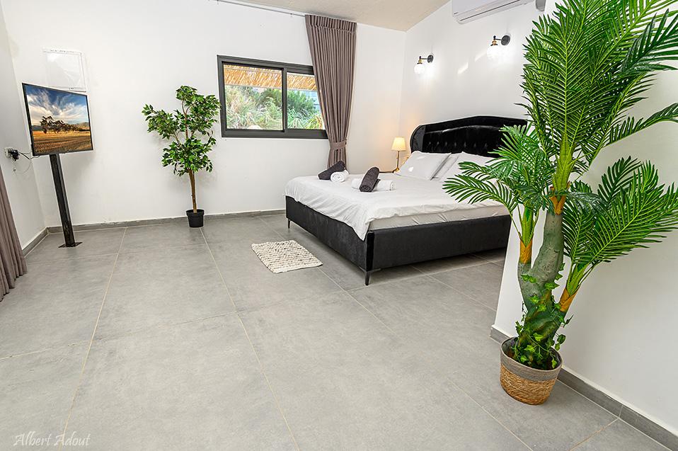 מיטה זוגית גדולה (KING SIZE) נוחה להפליא ולצידה חלון המשקיף אל הנוף הפתוח (אל דאגה- ניתן להצליל ע"י וילון) וממולה מסך LCD 42" עומד, מחובר למערכת חכמה (נטפליקס וכו...) ניצבים במרכז החדר. חדר הרחצה מאובזר ומעוצב גם הוא בטוב טעם, עם מקלחון ראש גשם גדול. כיור הרחצה, נמצא מחוץ למקלחת ועומד על שידת עץ מלא איכותית.