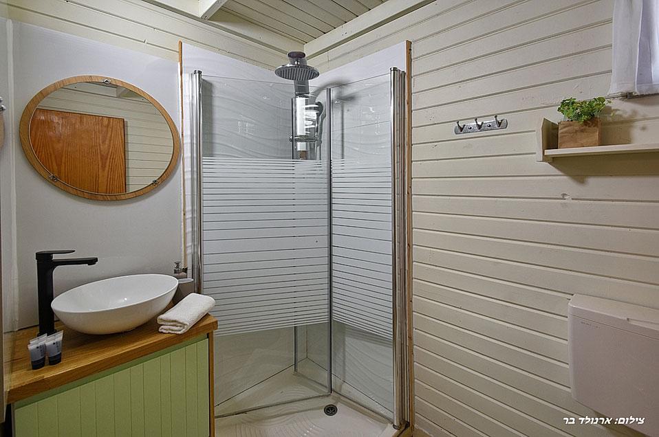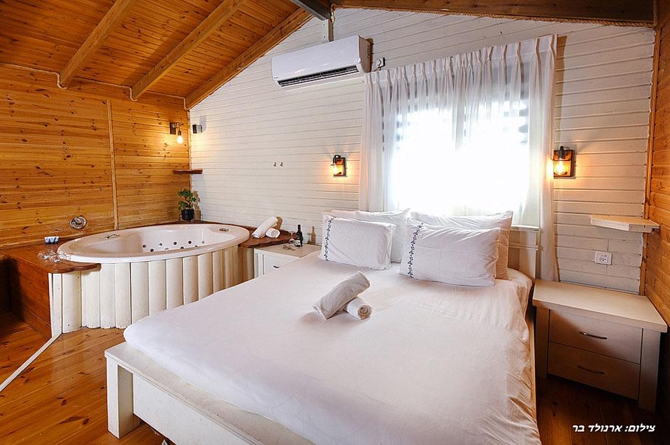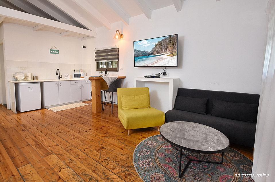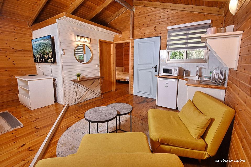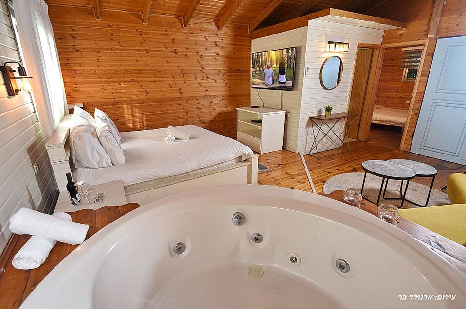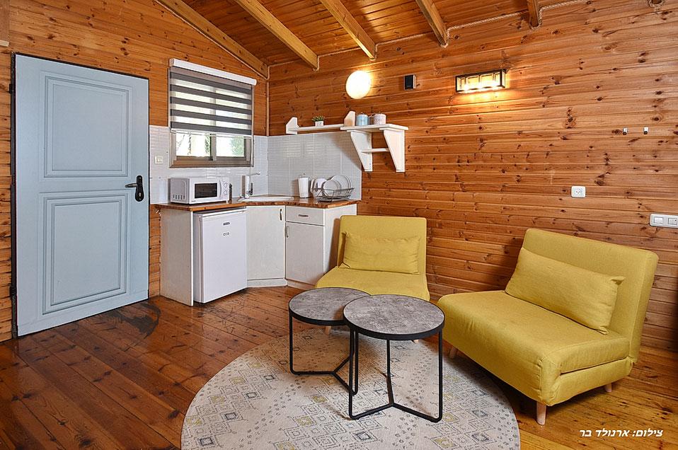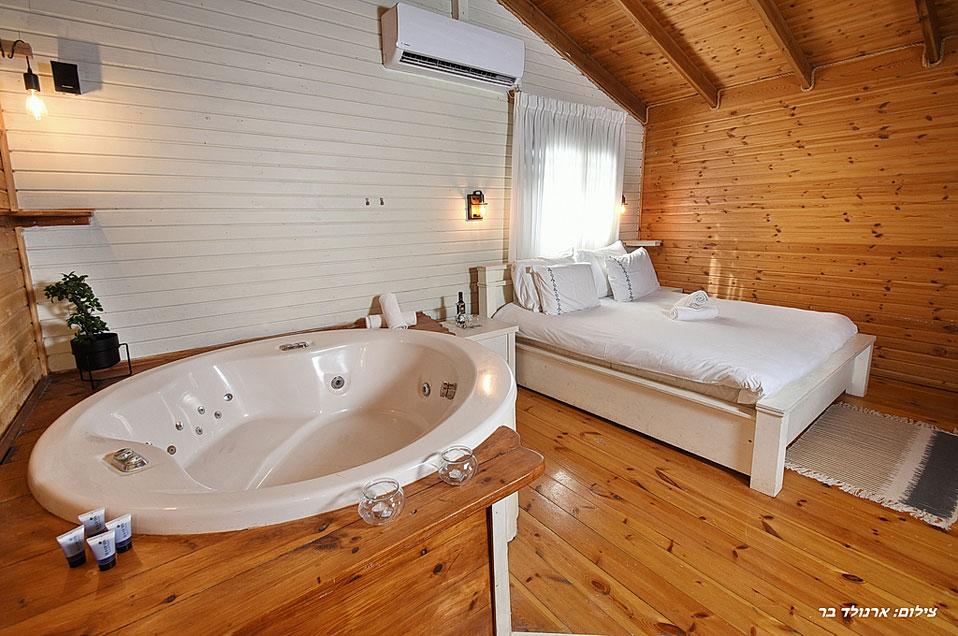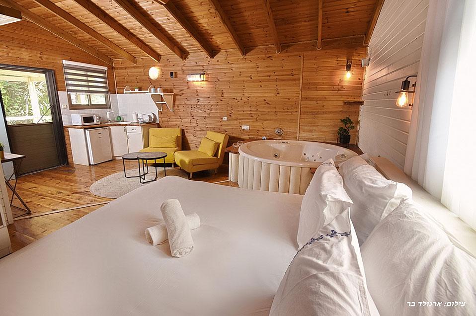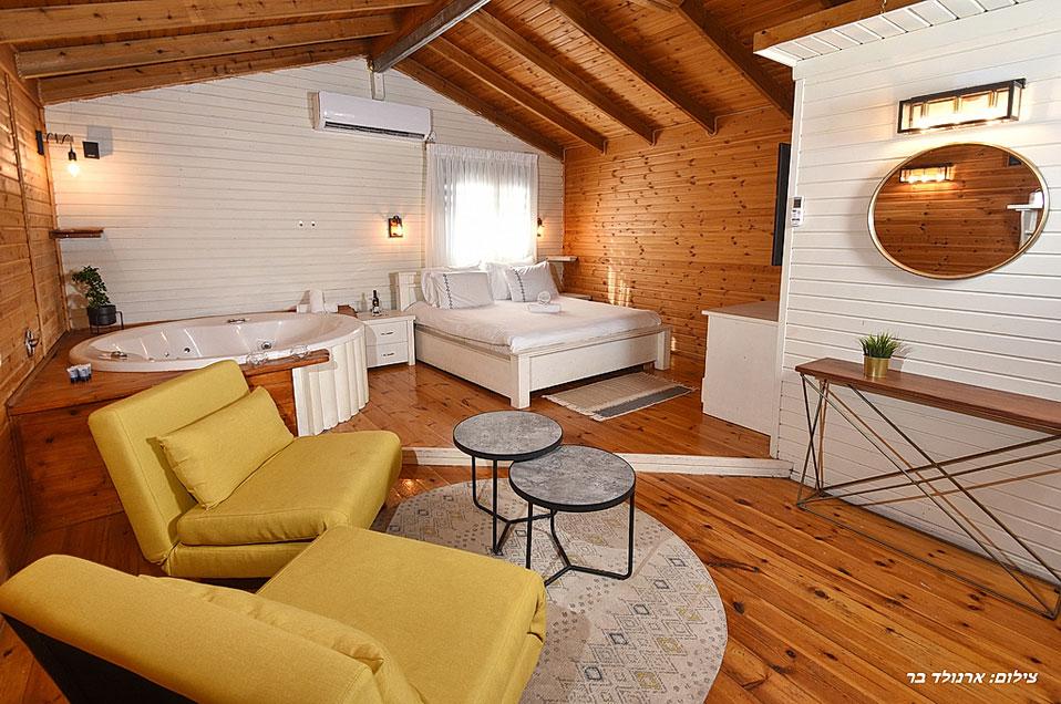 כל ארבע הסוויטות במתחם ממוקמות בבקתות עץ כפריות ומעוצבות בסגנון כפרי מודרני, בקו חמים ונינוח, המשתלב עם הנוף הירוק הזורם אל החלל דרך החלונות. יש כאן רצפת עץ נעימה, תקרות גבוהות, הריהוט מודרני, נוח ופונקציונלי, והאבזור חדש ומשוכלל. ההורים ישנים בחלל המרכזי, המעוצב במוטיב רומנטי ומאובזרים במיטת שינה אורתופדית ומסך טלוויזיה. הילדים ישנים בחדר הנוסף – על מיטה זוגית וניתן גם לישון בחלל המרכזי על הספה והכורסה הנפתחות. כל בקתה מצוידת בג'קוזי ספא, מסך טלוויזיה SMART 55 אינצ' עם ערוצי YES, פינת אוכל, חדר רחצה עם מקלחון זוגי ומטבח עם כיריים חשמליות, מיקרוגל, מיני מקרר, קומקום חשמלי וכלי אוכל.