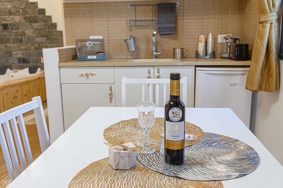 ארבע הסוויטות דומות באבזור, אך שונות בגודלן. בכל סוויטה ישנה מיטה זוגית/יהודית, ספה יוקרתית נפתחת לילדים , עם אפשרות ללול נוסף. ג'קוזי גדול ניצב ממרכז החדר ומעליו תאורת לד, המתחברת לרמקול בלוטות', מסך LCD עם ממיר "צופיה" , תוכן כשר לכל המשפחה- בכל סוויטה. במטבחון תמצאו- מיקרוגל, טוסטר צנימים ומכונת אספרסו מפנקת וכמובן, שולחן אוכל. בכל סוויטה, מרפסת עץ עם שולחן גינה, עציצי נוי ונוף פתוח.