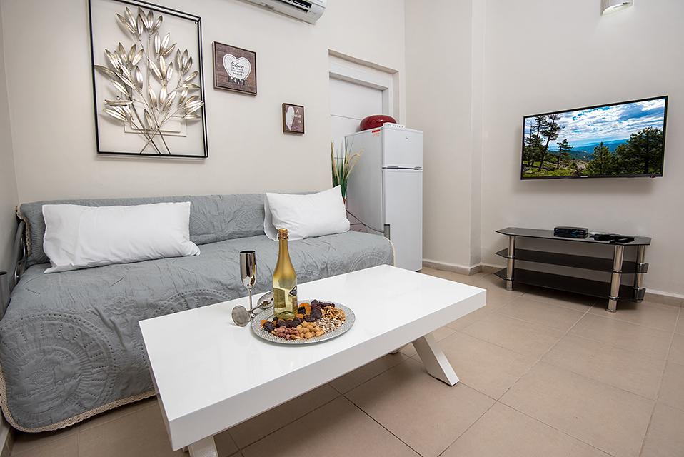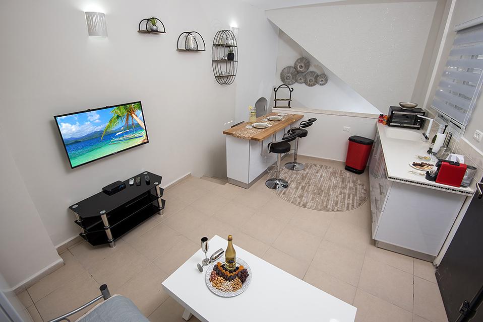 חלל מרכזי בסוויטה הזוגית - מטבחון מאובזר, פינת ישיבה וג'קוזי ספא גדול