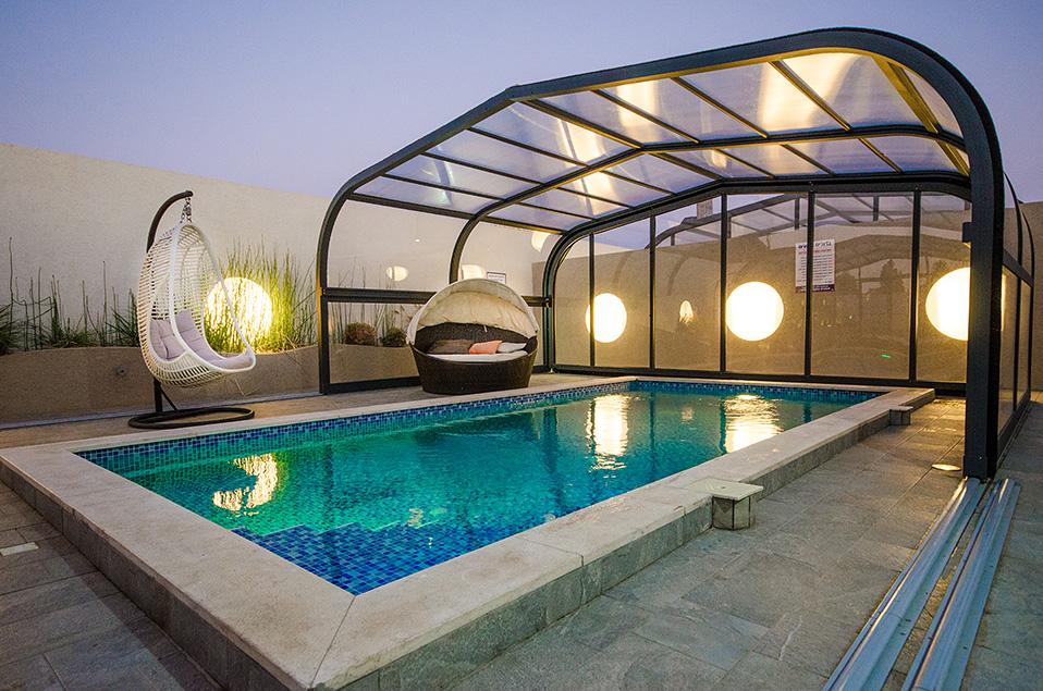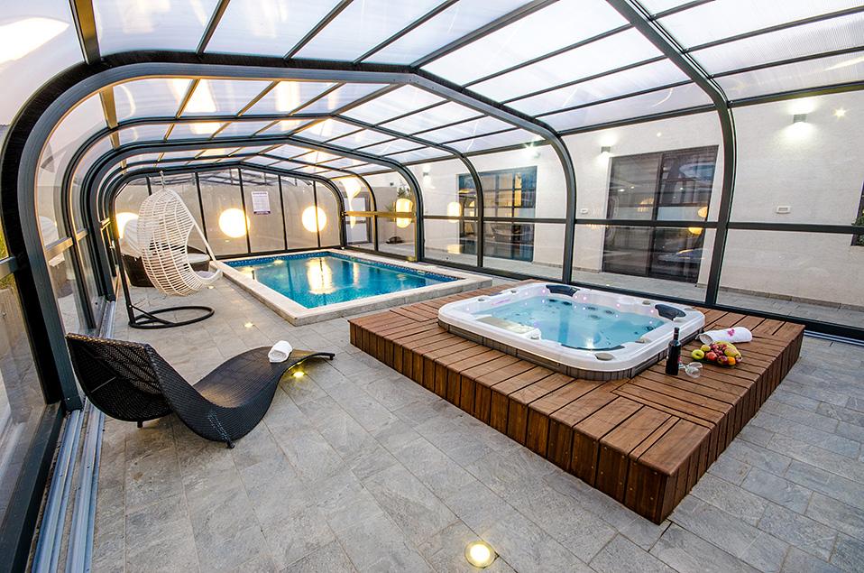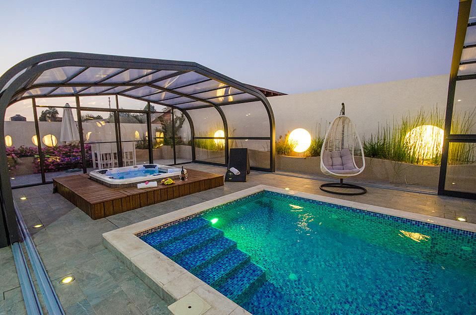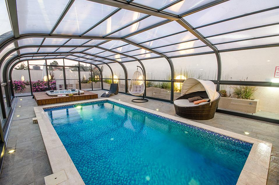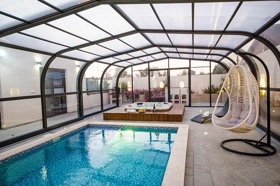 מתחם בריכת השחיה המחוממת וגקוזי ספא תחת קירוי לעונת החורף לכל סוויטה