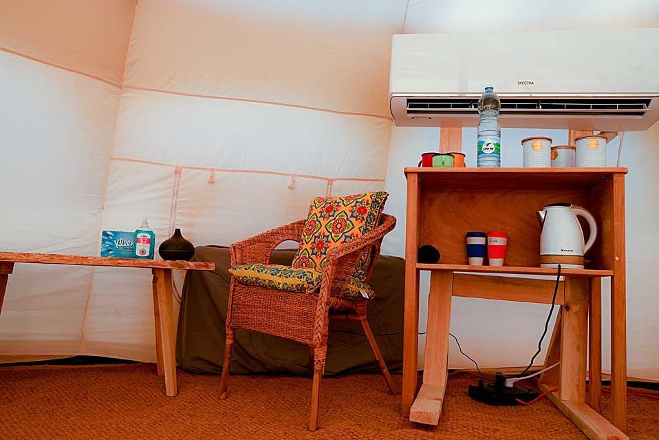 בתוך כל סוויטה - מיטה זוגיות עם מזרן אורתופדי,מיטה נוספת, פינת שתייה עם קומקום חשמלי, פינות ישיבה ופינת אוכל. האוהלים ממוזגים ונעימים לשהייה.