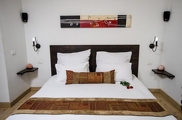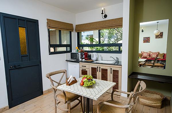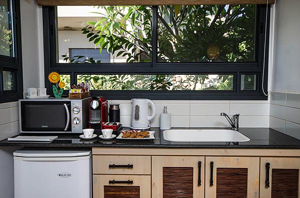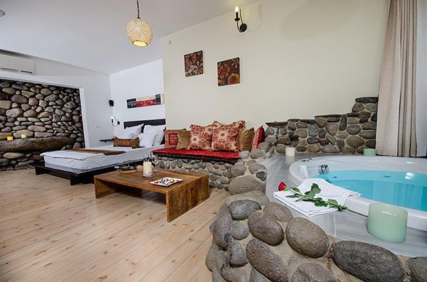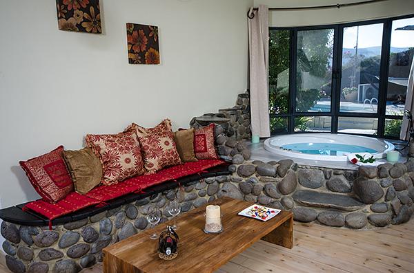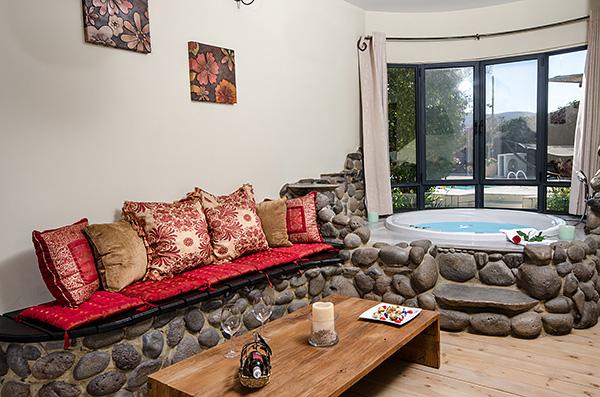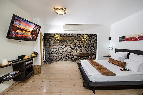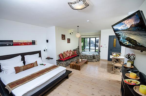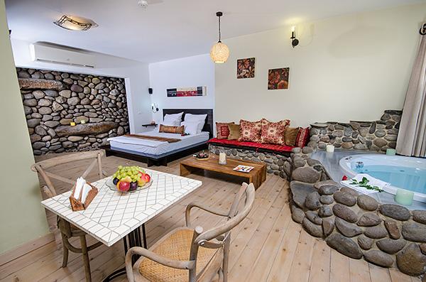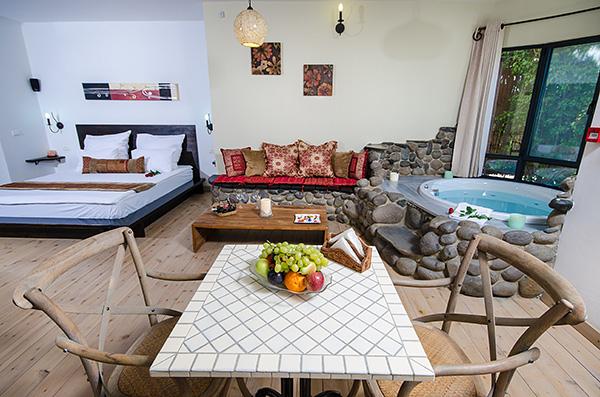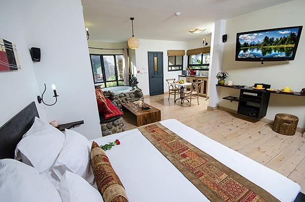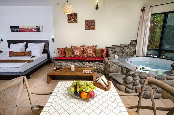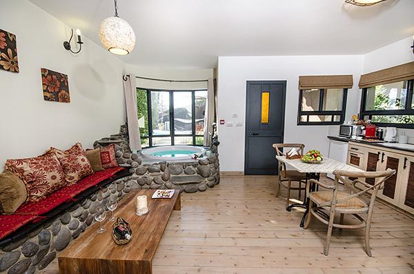 בתוך כל סוויטה - מערכת ישיבה על בסיס אבן בזלת ושולחן מעץ מלא מול מסך טלוויזיה מתכוונן, המצויד מערכת קולנוע וחיבור USB, נישה פרטית עם מיטת שינה גדולה ורומנטית, פינת אוכל נוחה בסמוך למטבחון וג'קוזי זוגי עגול, גדול במיוחד, המוקף בחלונות הפונים לגינה.