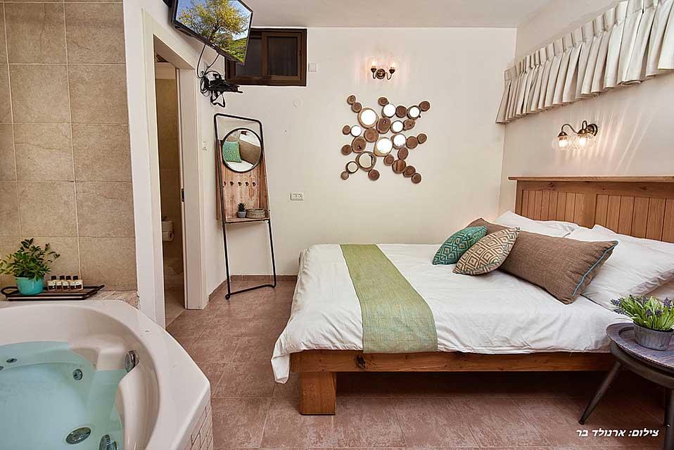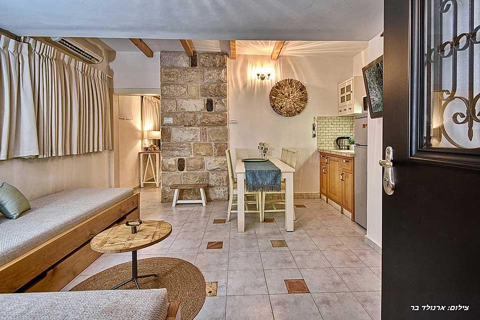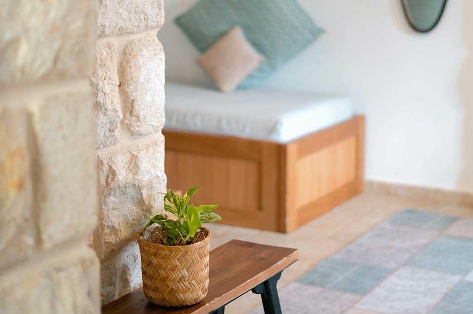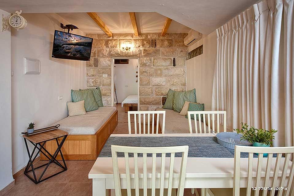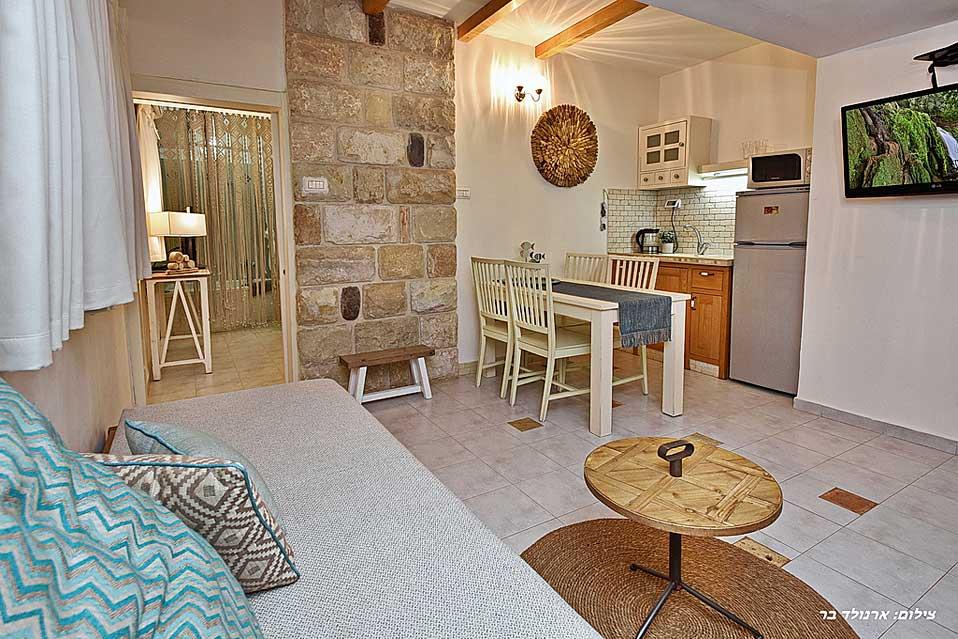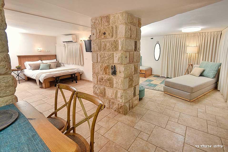 The estate offers six spacious and comfortable Jerusalem stone suites, designed in a luxurious country style and divided into two interconnected spaces - a living room and a bedroom. Each unit has a spacious private balcony that continues into a green courtyard with a well-tended garden. The suites are equally suitable for hosting couples, families or large groups at the request of the entire complex