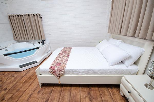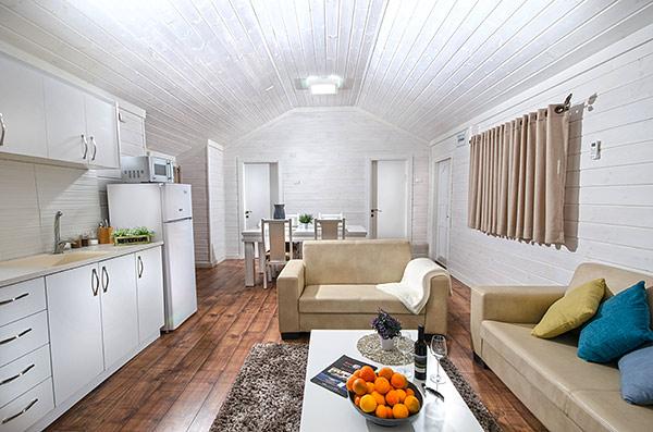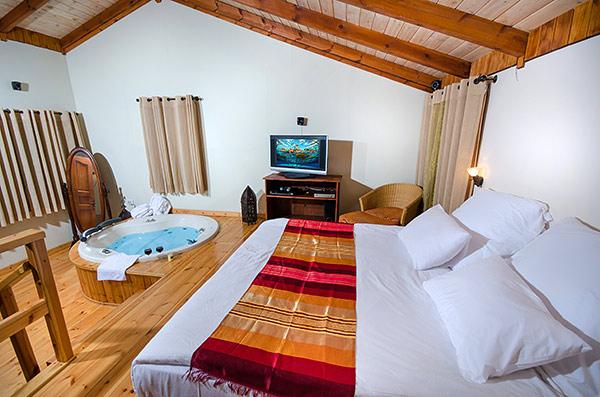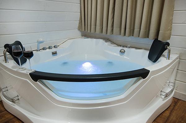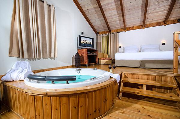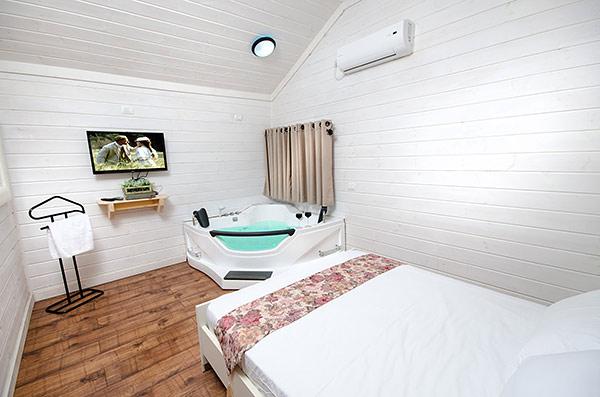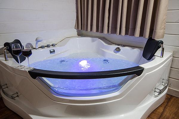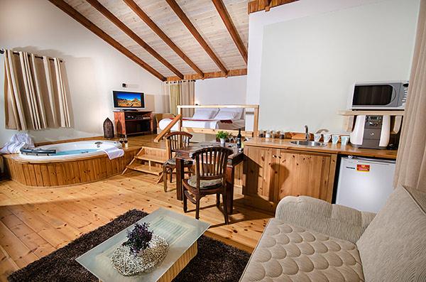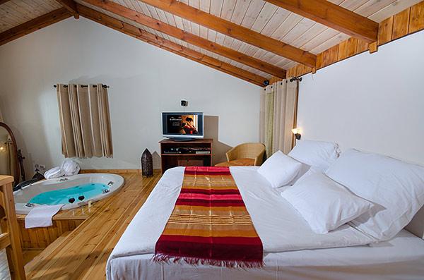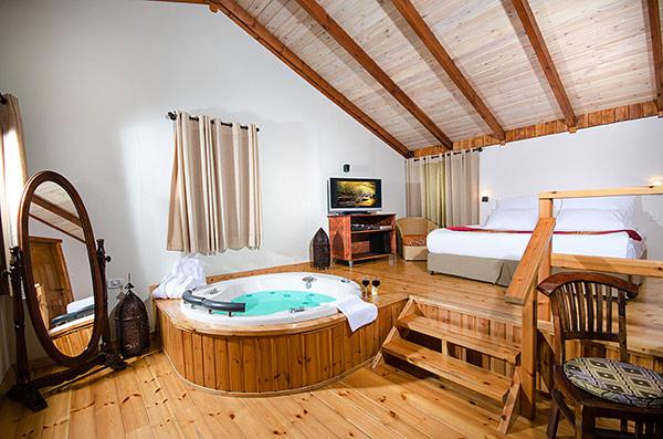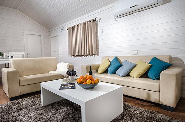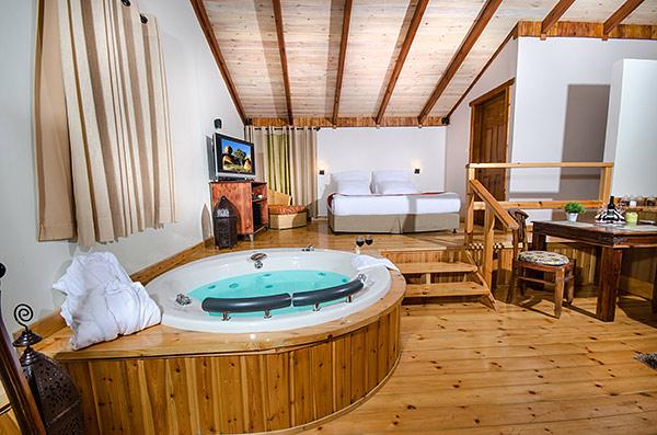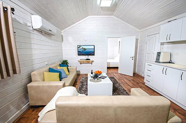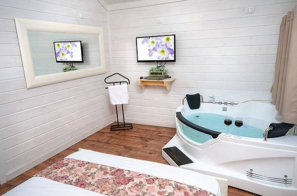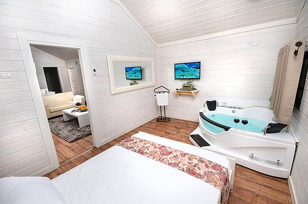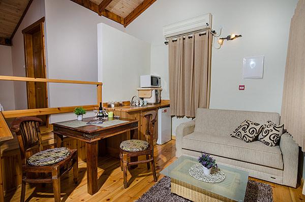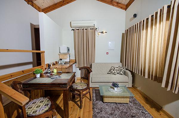 A luxurious and well-kept accommodation complex. The complex with 3 rustic wooden cabins, with private thin balconies immersed in greenery. In the complex - two romantic suites in warm and intimate design that contain a common outdoor area with spa Jacuzzi, dining table, seating areas and tanned beds around the swimming pool.
