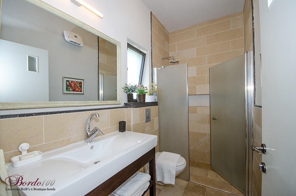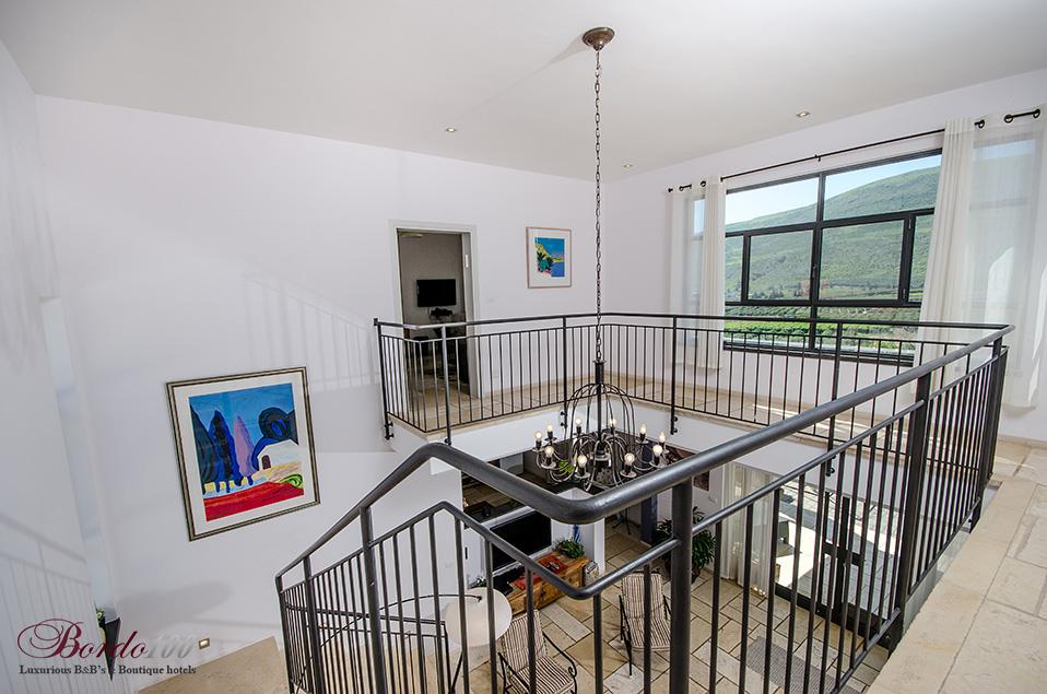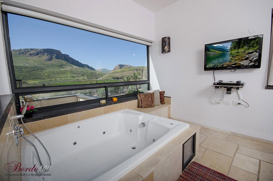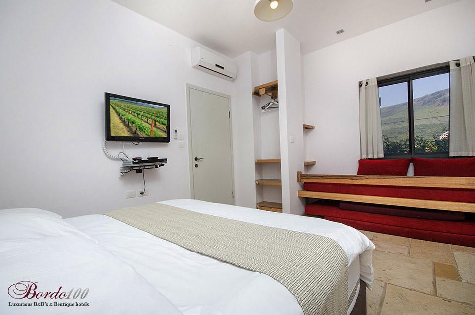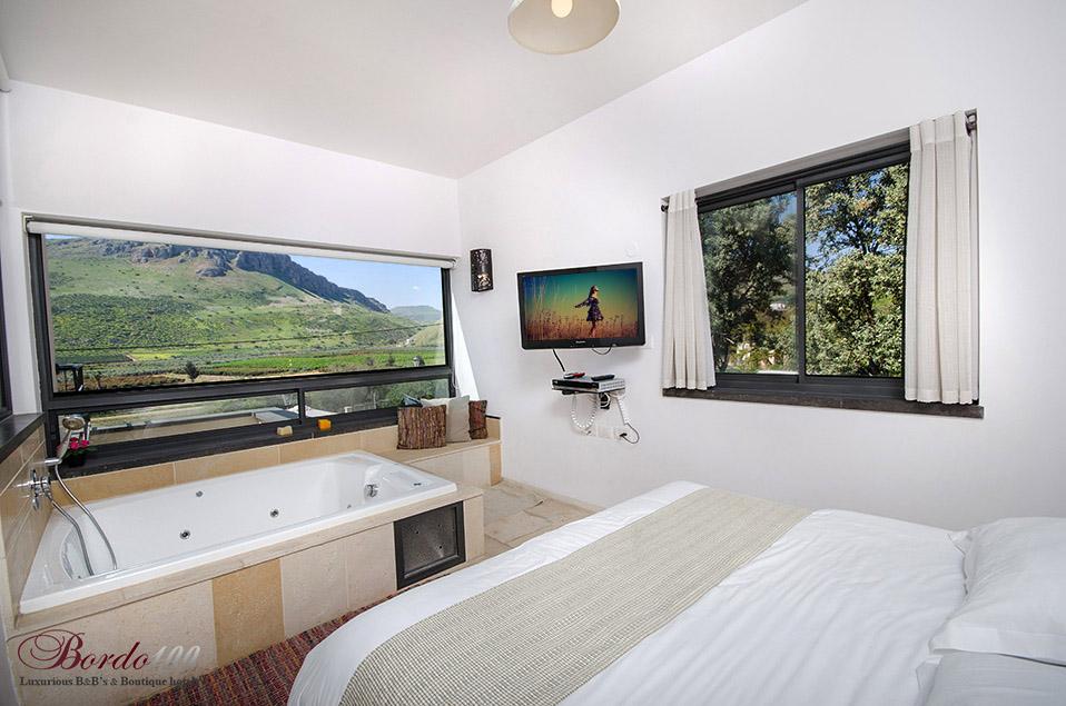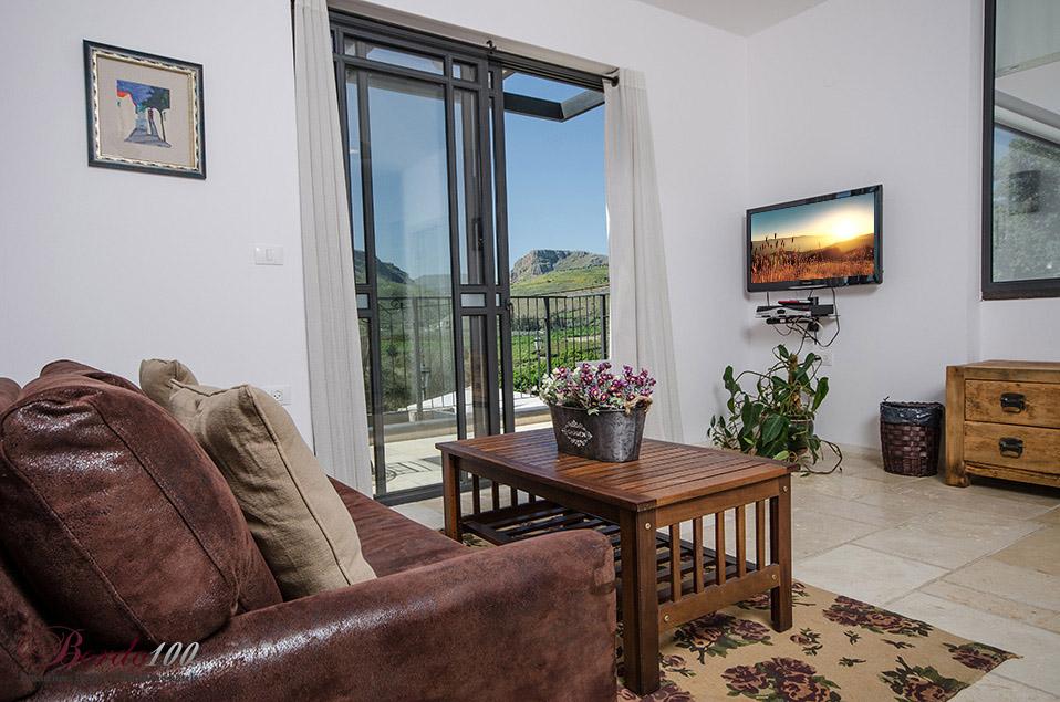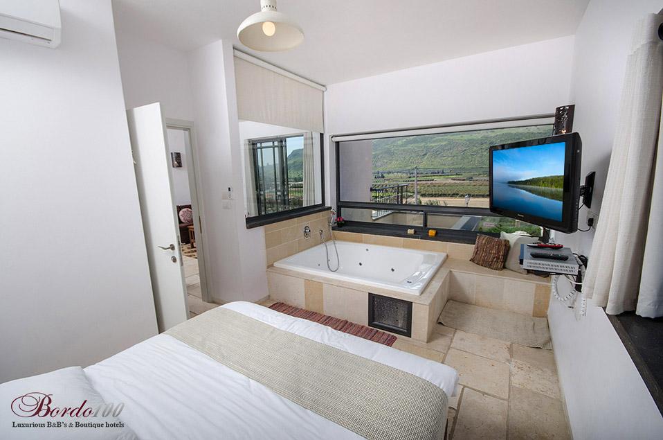 On the second floor: 2 large suites, identical and separate, including a bedroom with a private Jacuzzi, a separate family room with Amina's sofa opening, a bathroom and a balcony with a view. All bedrooms are equipped with the highest quality beds and mattresses, 32 inch TVs with hot cable connections and high quality linen and towels.
