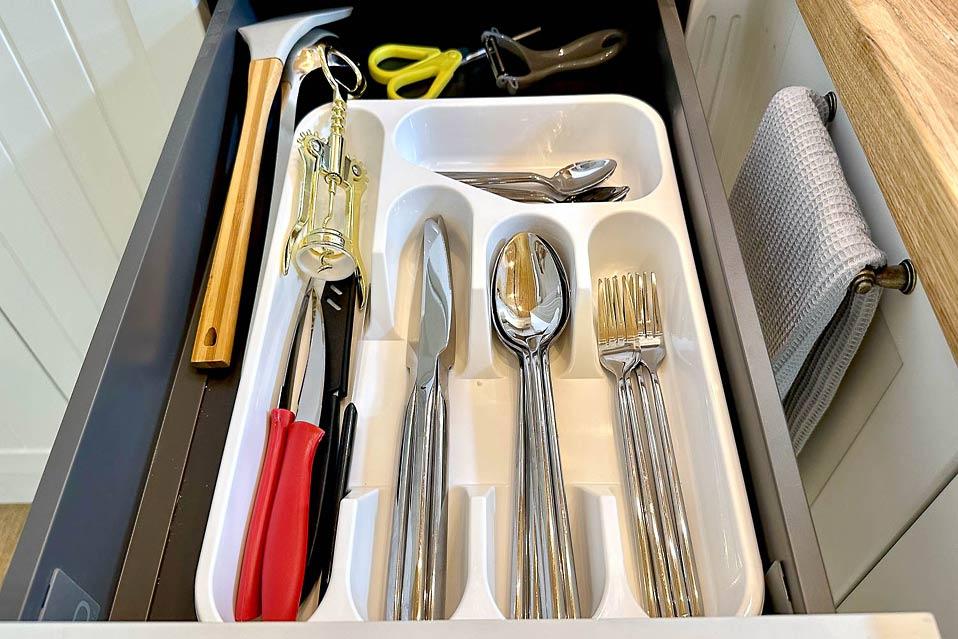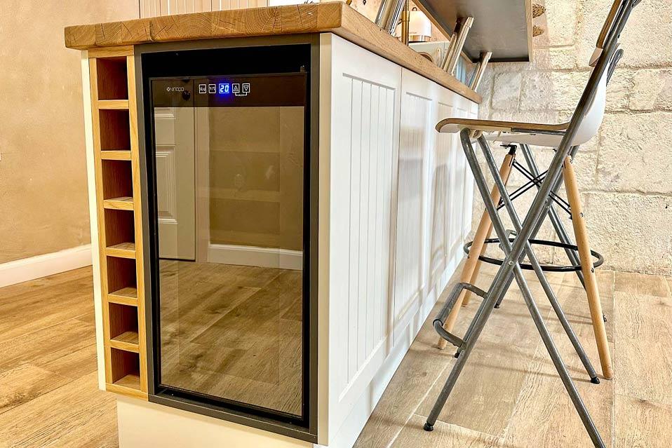 A spacious and indulgent suite featuring a private Jacuzzi, a large comfortable living area, a high-end designed kitchen with a wide island, an electric fireplace, a wine refrigerator, and a large screen. A suite designed for truly staying in – hosting, cooking, relaxing – all in the heart of the city.
