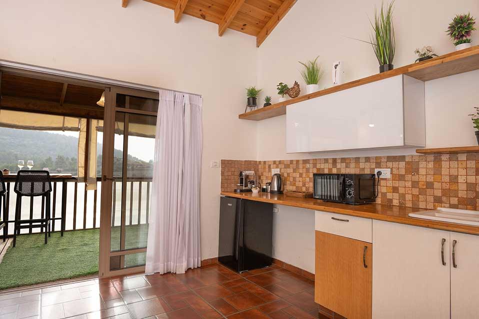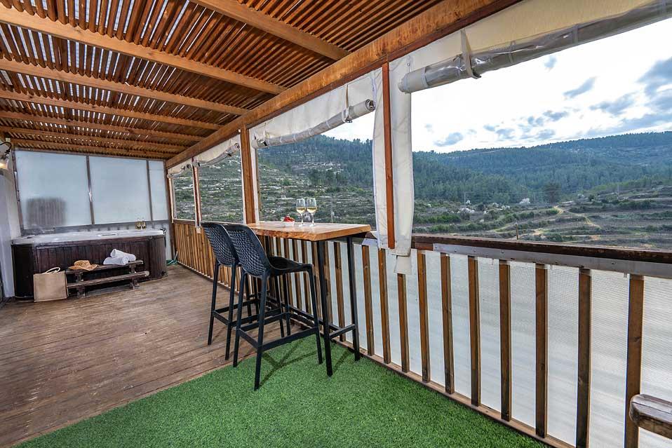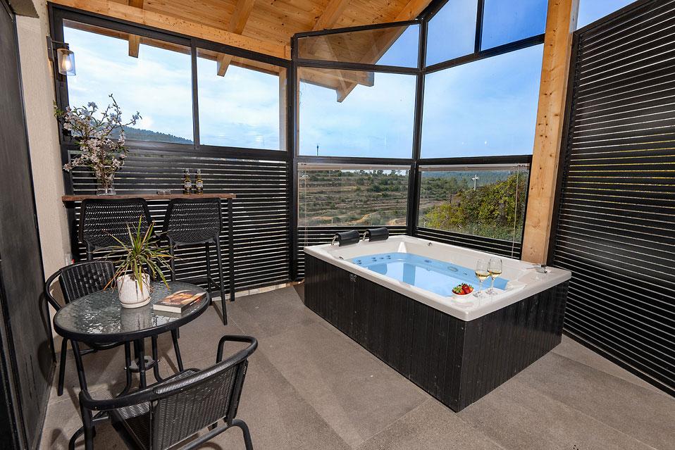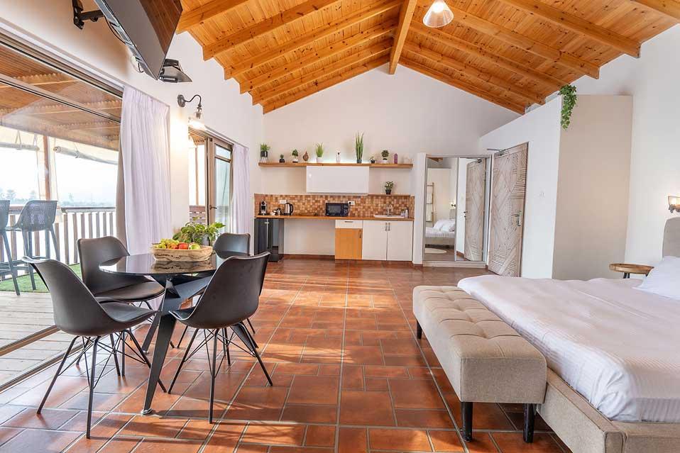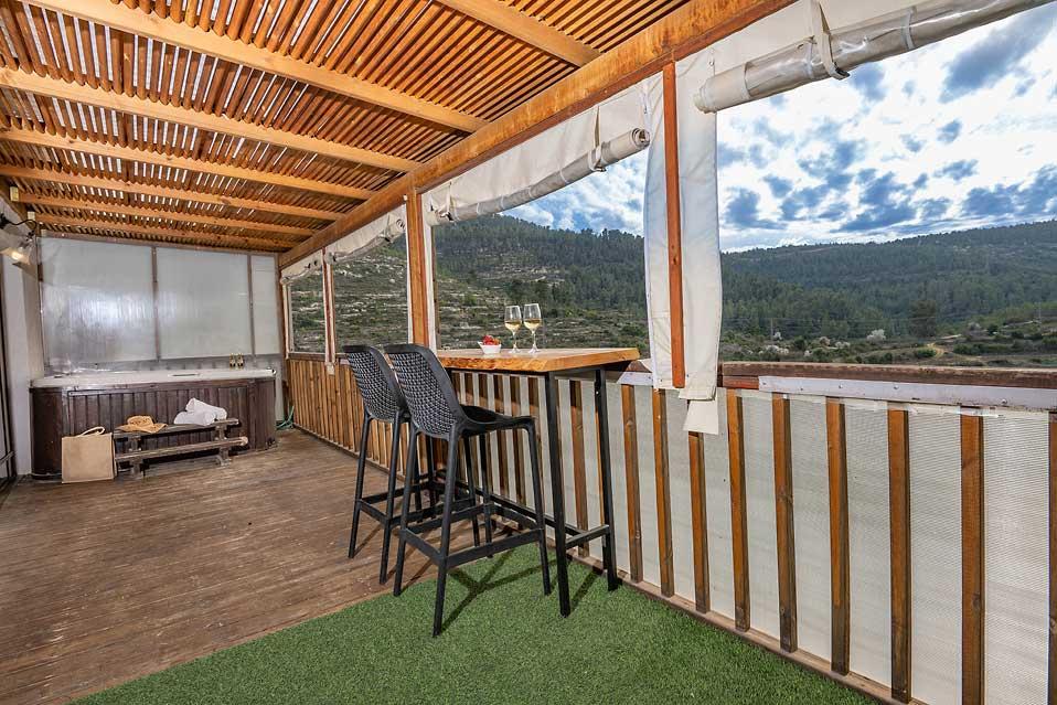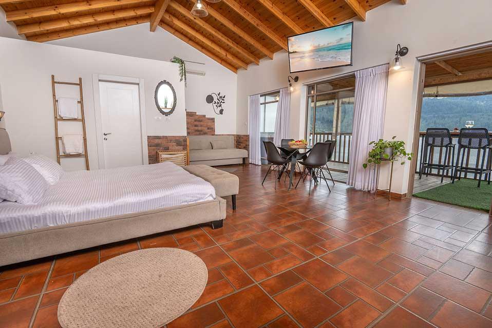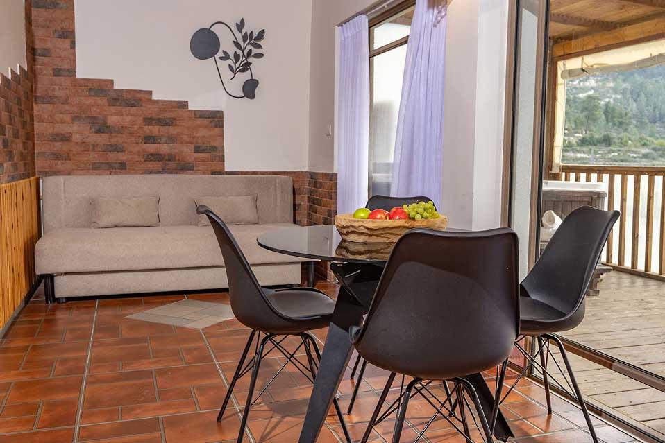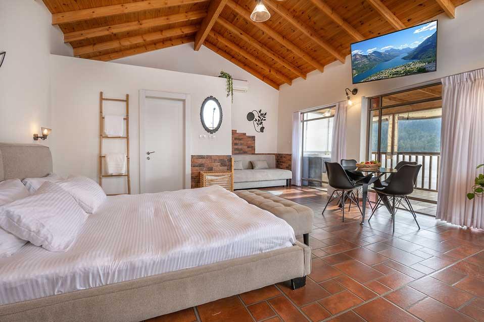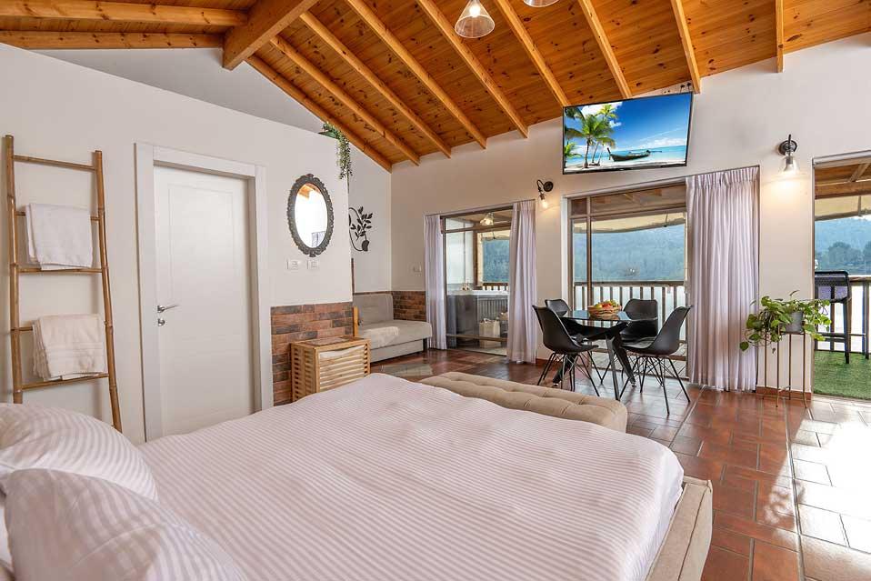 Large family suite. The entrance to the suite is through an access road and a private yard with a sitting area and a built-in barbecue facility. The suite is spacious with huge windows overlooking the view. The suite space is equipped with a double bed, a large TV screen, a pull-out couch for children, a kitchenette, a bathroom and a wooden balcony along the length of the suite with a huge spa jacuzzi, a bar table, coffee and a pampering hammock.