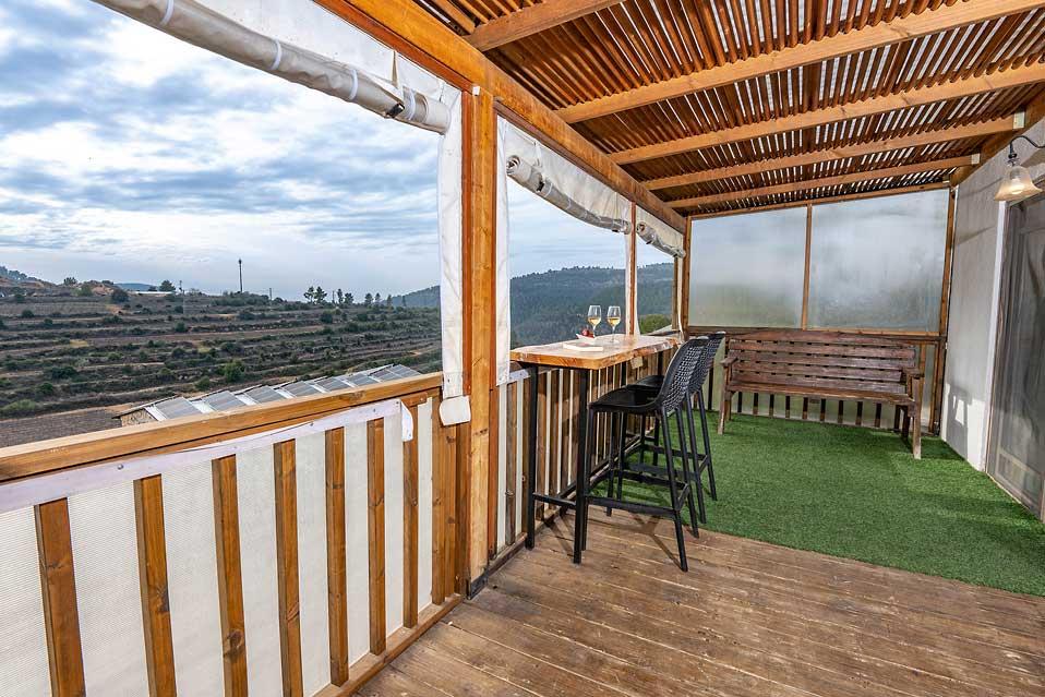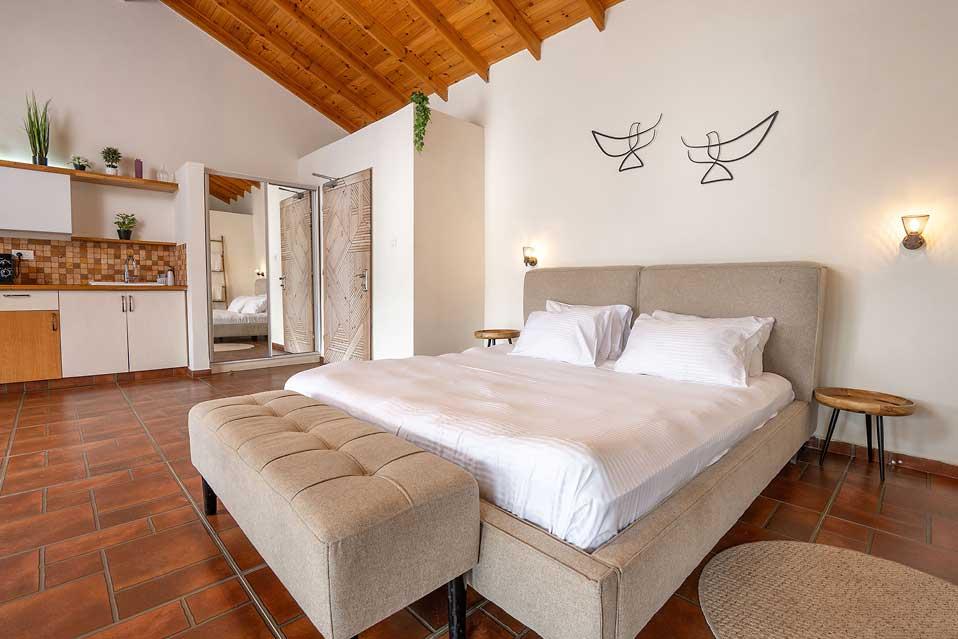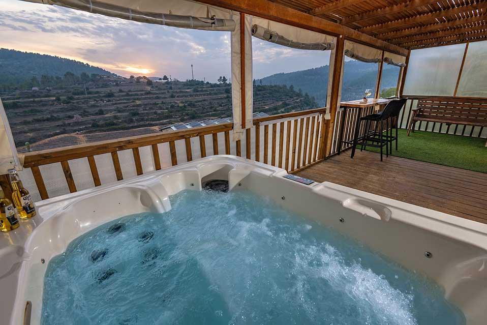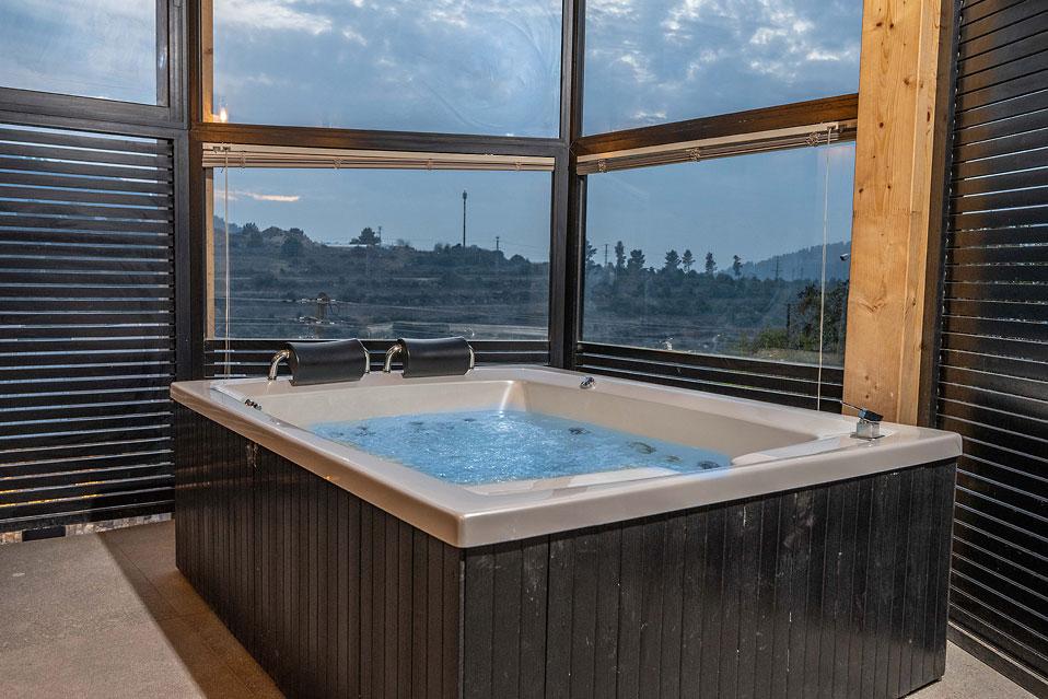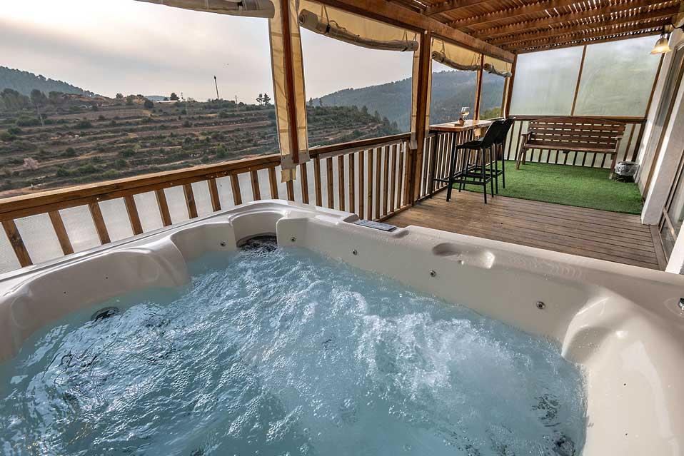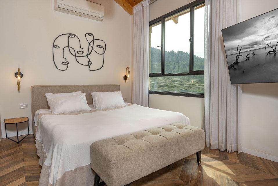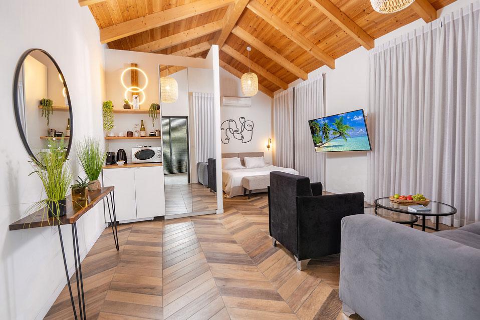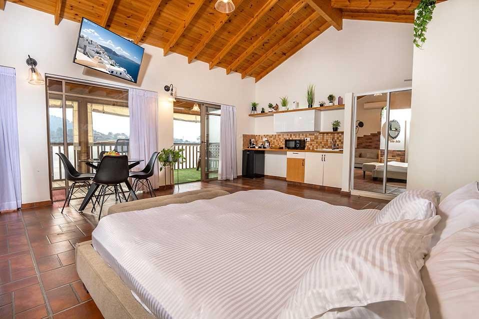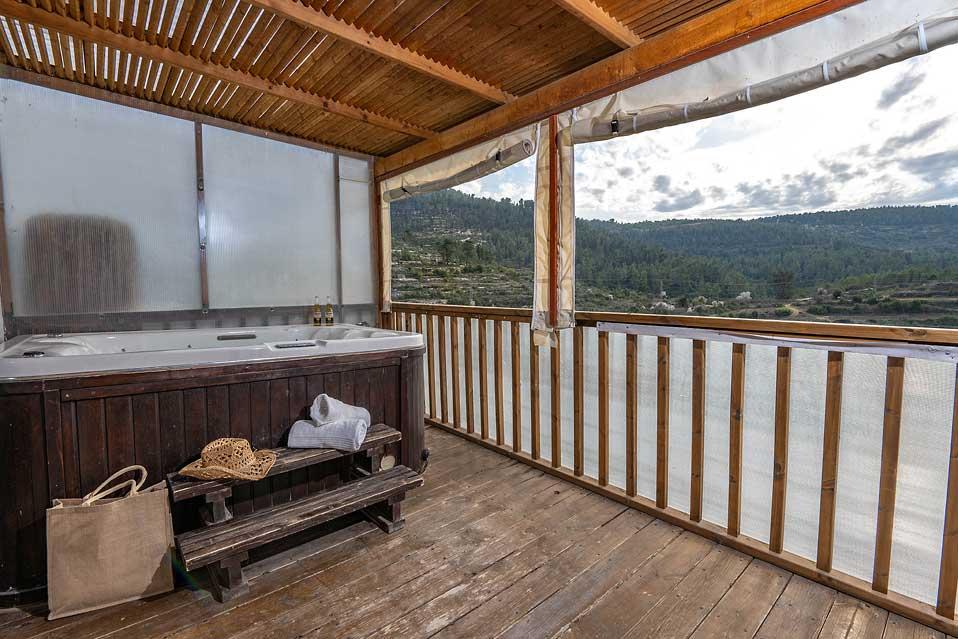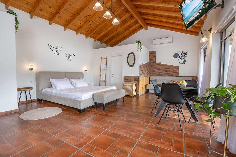 Large family suite. The entrance to the suite is through an access road and a private yard with a sitting area and a built-in barbecue facility. The suite is spacious with huge windows overlooking the view. The suite space is equipped with a double bed, a large TV screen, a pull-out couch for children, a kitchenette, a bathroom and a wooden balcony along the length of the suite with a huge spa jacuzzi, a bar table, coffee and a pampering hammock.