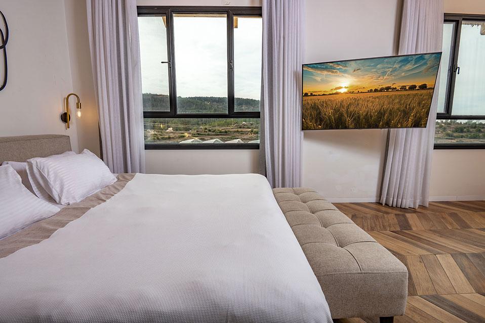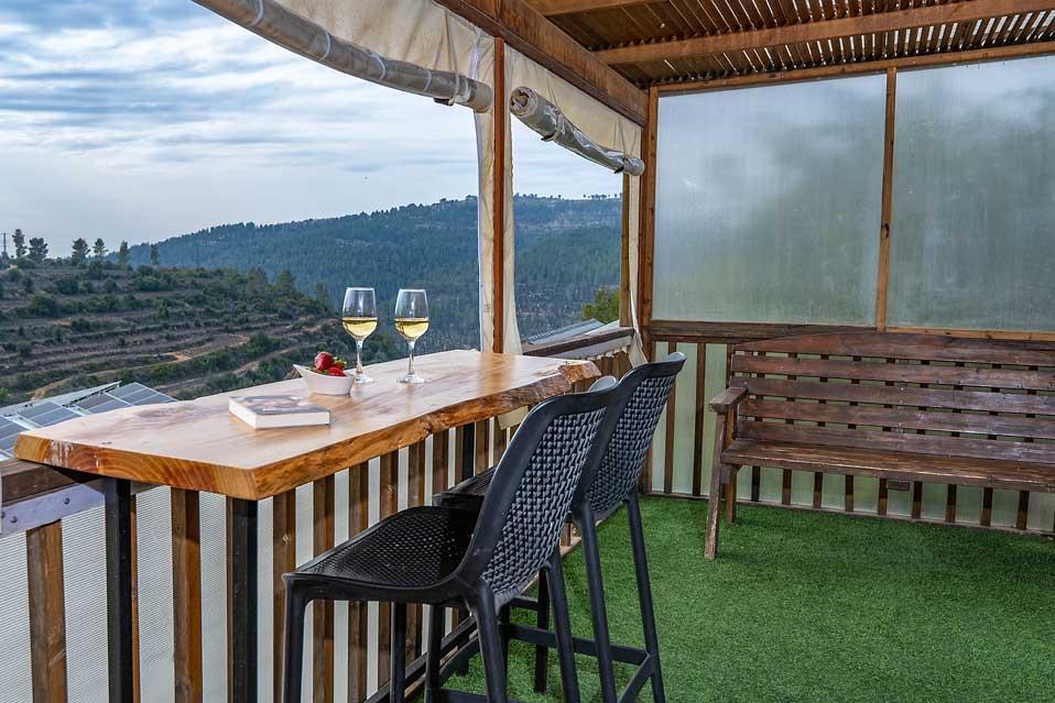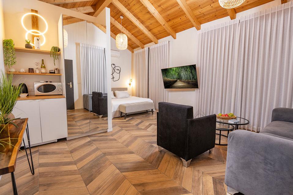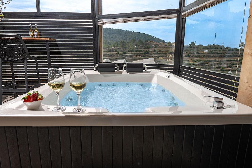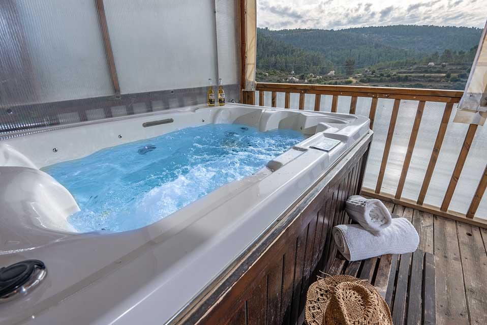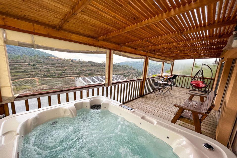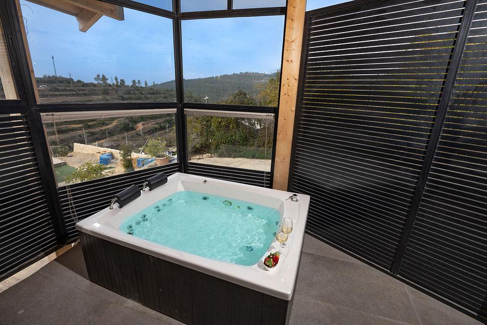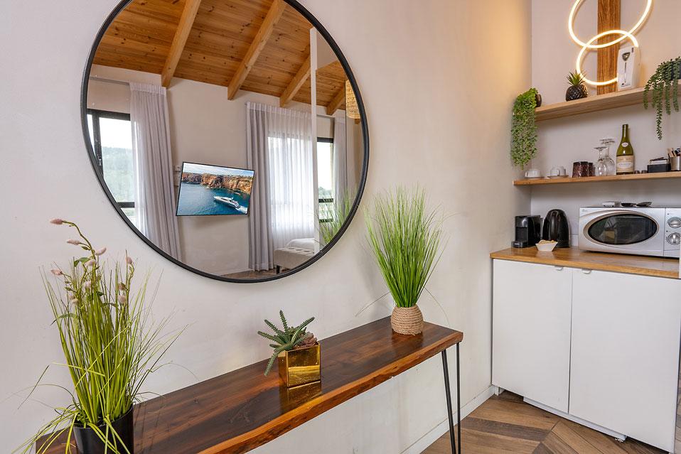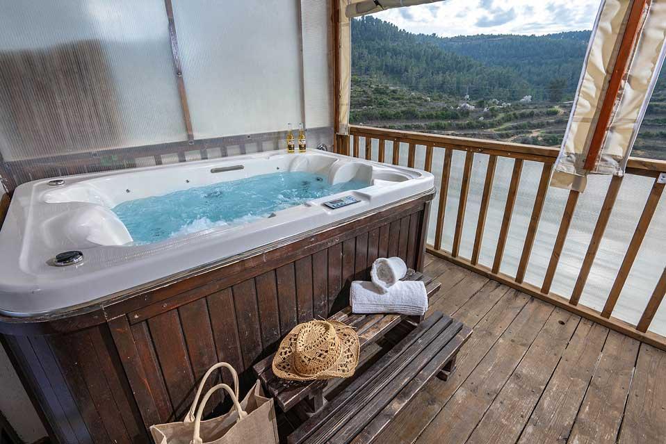 Large family suite. The entrance to the suite is through an access road and a private yard with a sitting area and a built-in barbecue facility. The suite is spacious with huge windows overlooking the view. The suite space is equipped with a double bed, a large TV screen, a pull-out couch for children, a kitchenette, a bathroom and a wooden balcony along the length of the suite with a huge spa jacuzzi, a bar table, coffee and a pampering hammock.