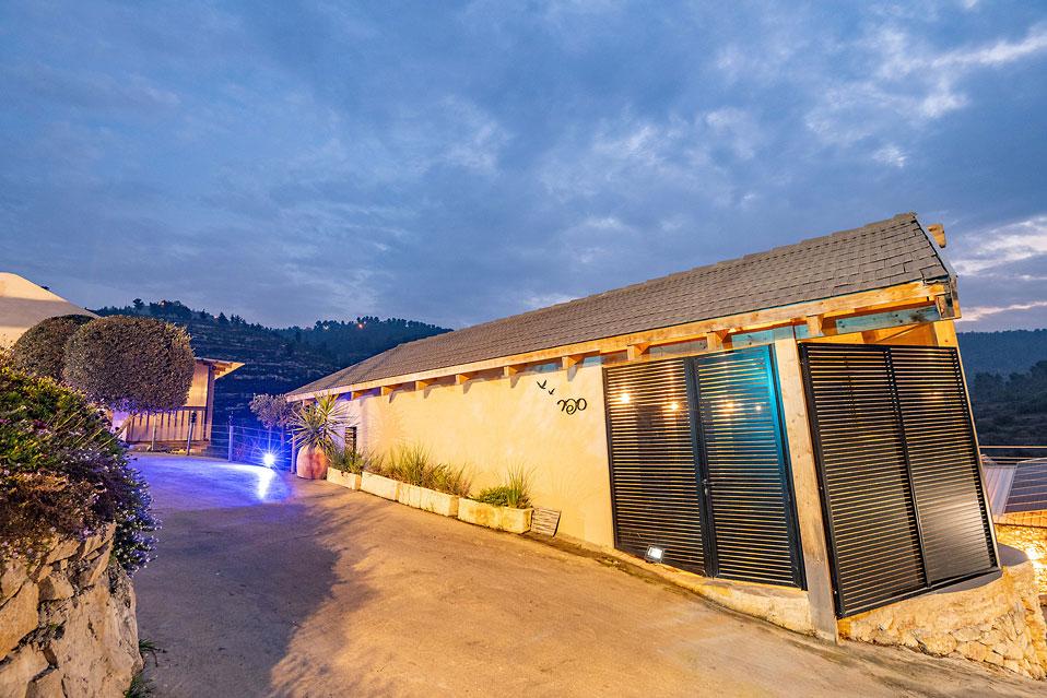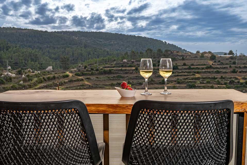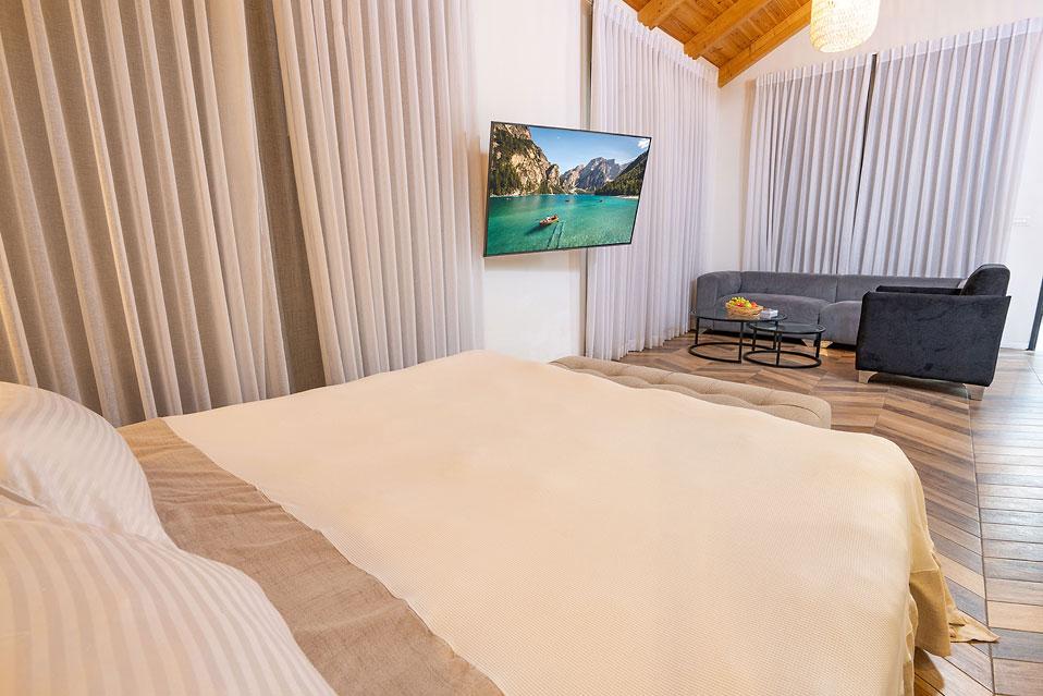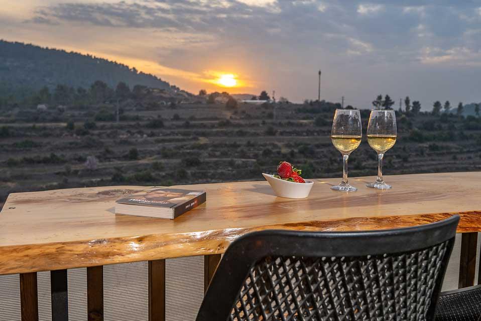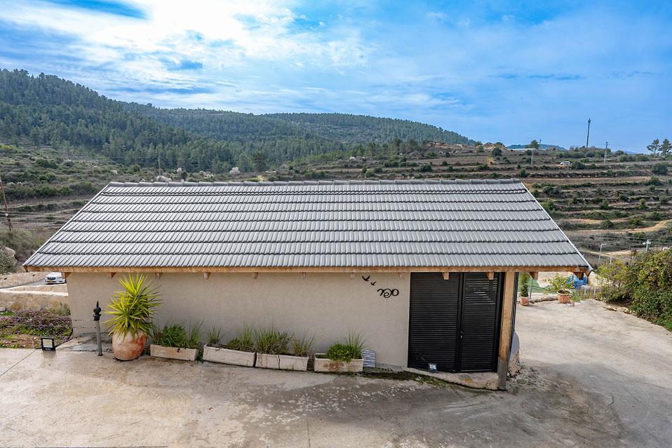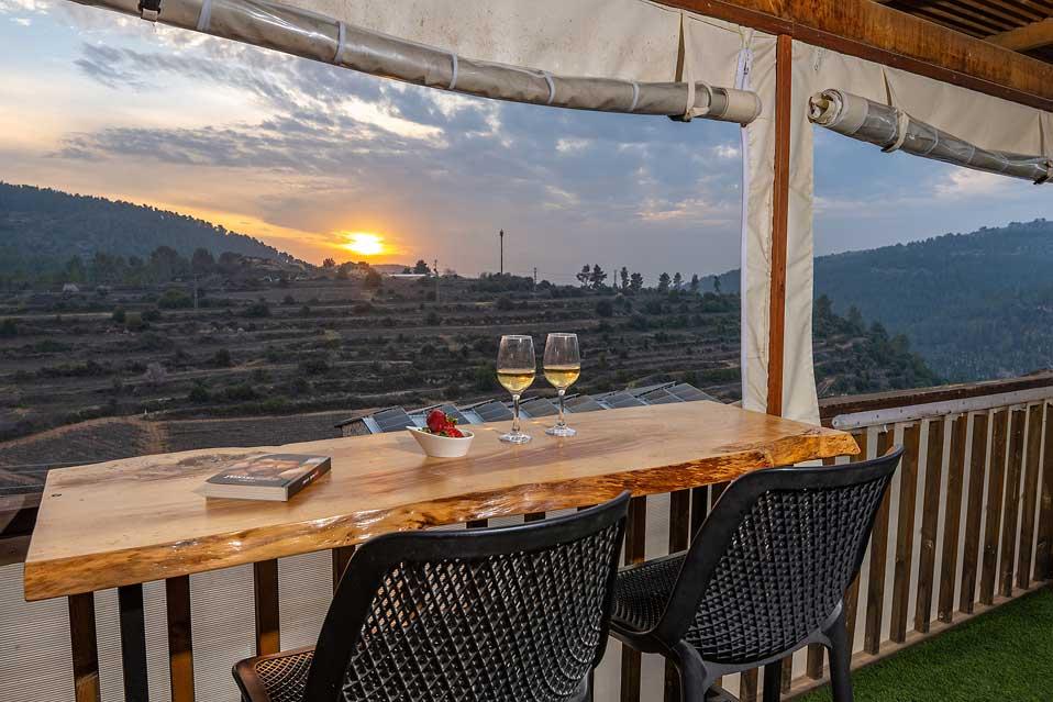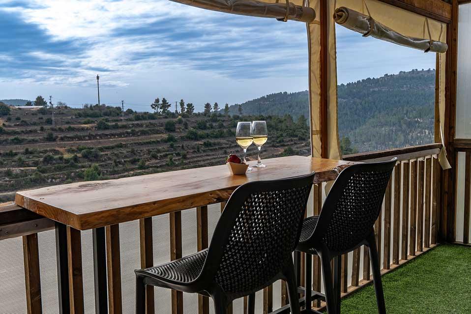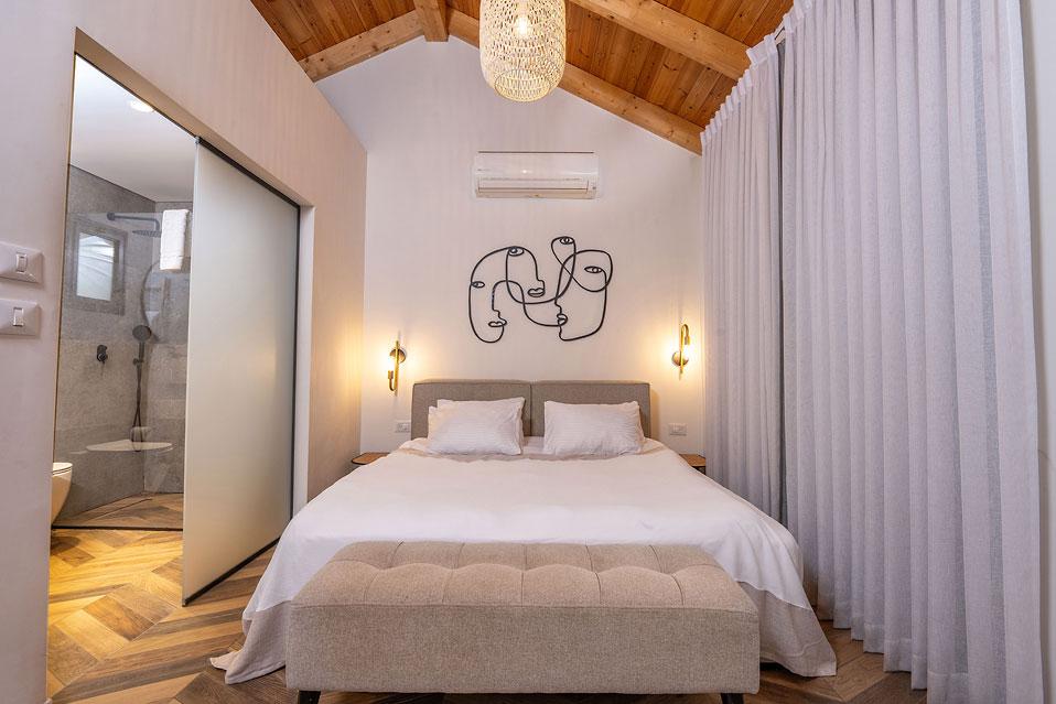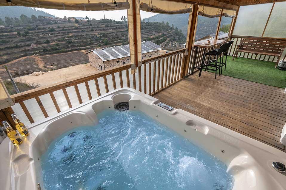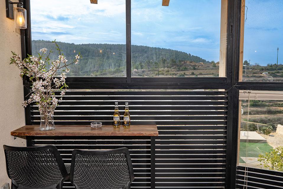 Large family suite. The entrance to the suite is through an access road and a private yard with a sitting area and a built-in barbecue facility. The suite is spacious with huge windows overlooking the view. The suite space is equipped with a double bed, a large TV screen, a pull-out couch for children, a kitchenette, a bathroom and a wooden balcony along the length of the suite with a huge spa jacuzzi, a bar table, coffee and a pampering hammock.
