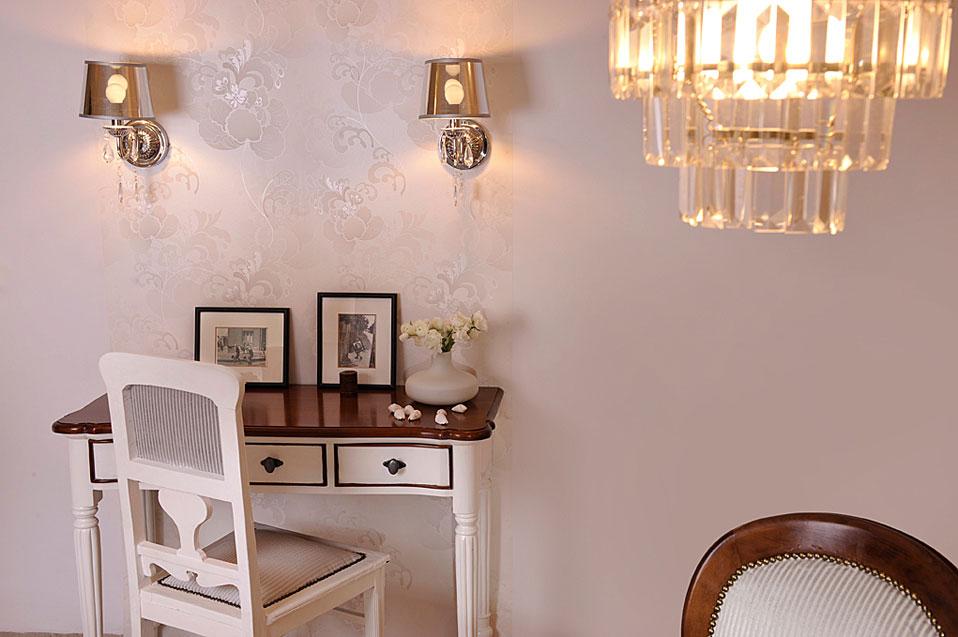 furniture, most of it painted white, delicate wallpaper that decorates the