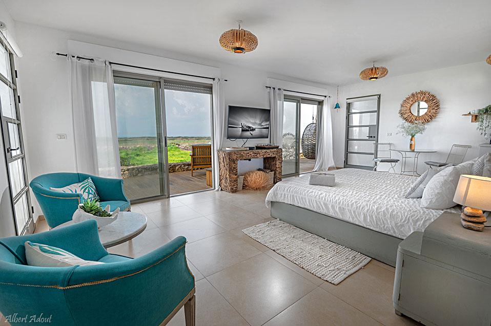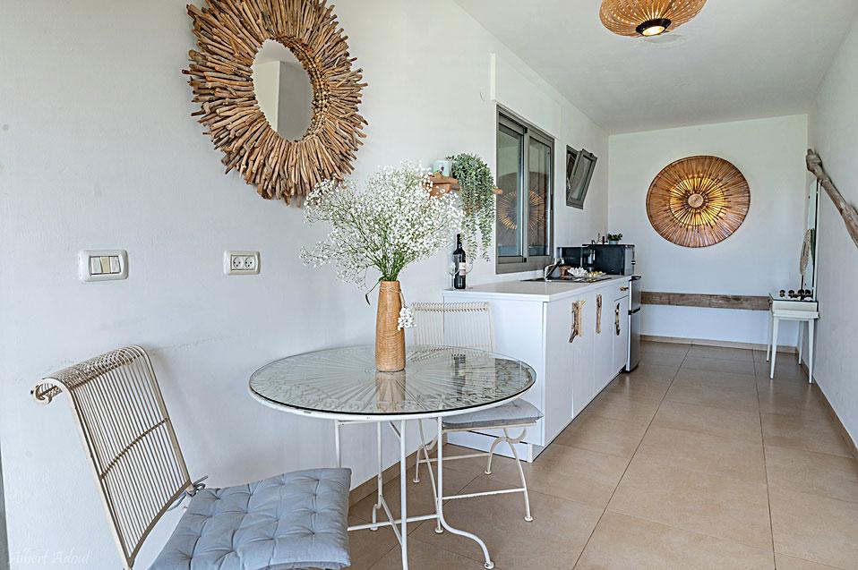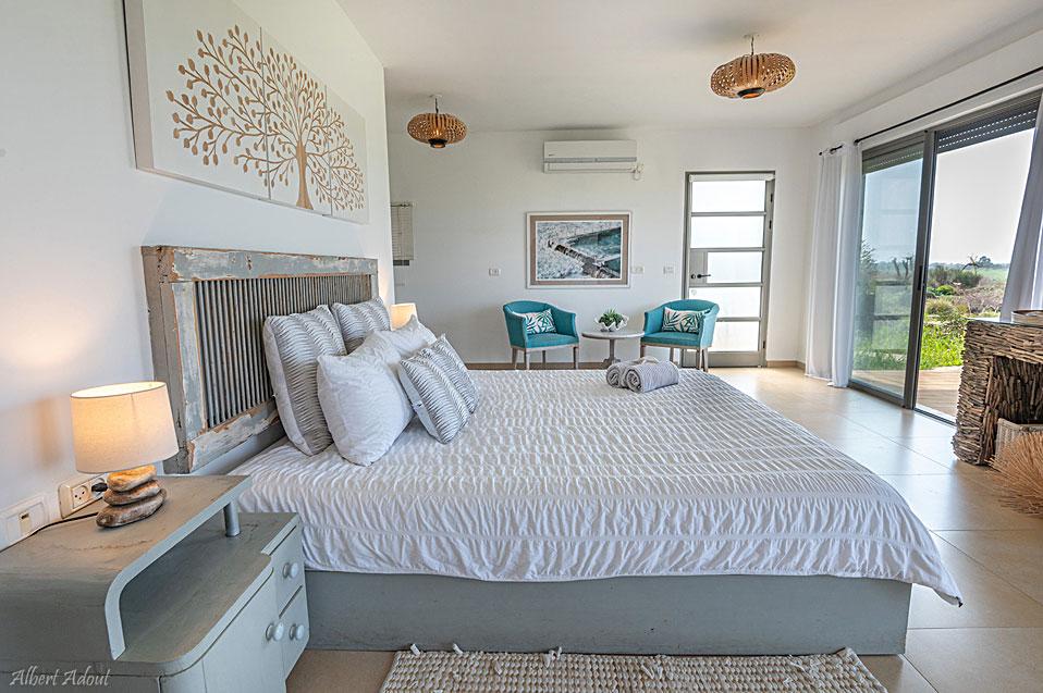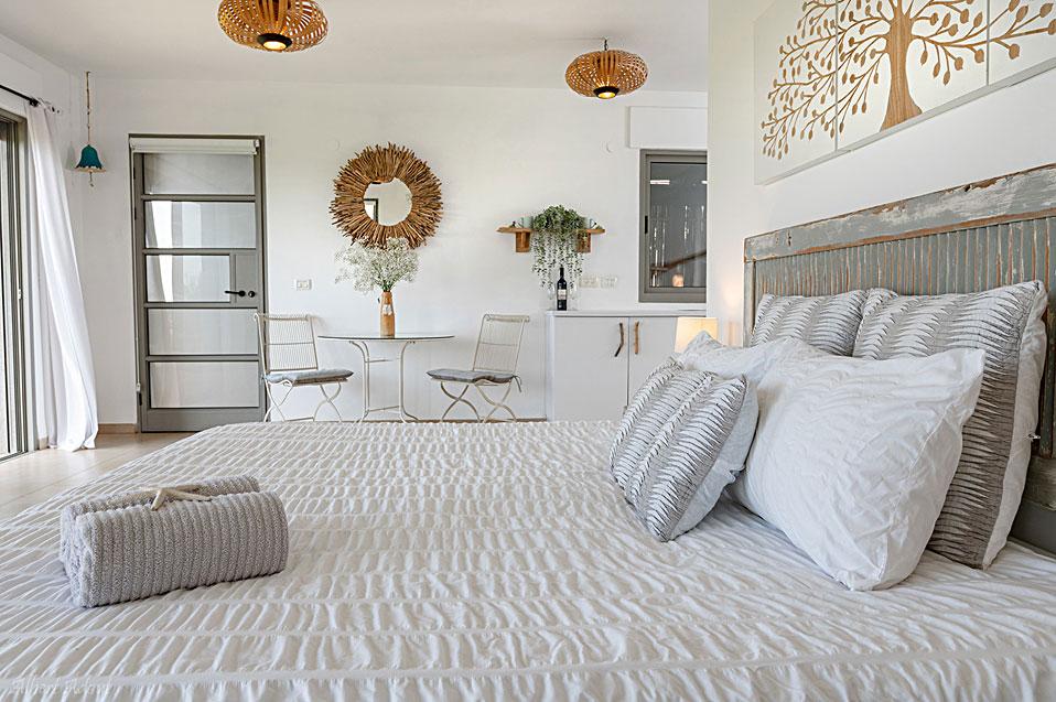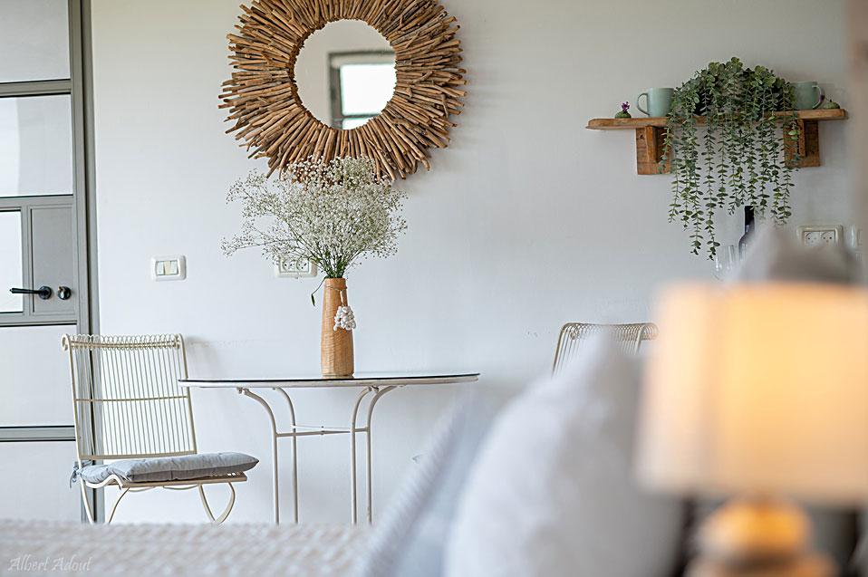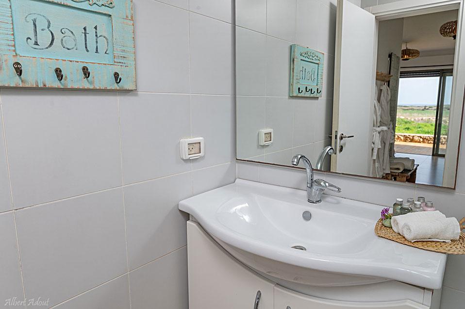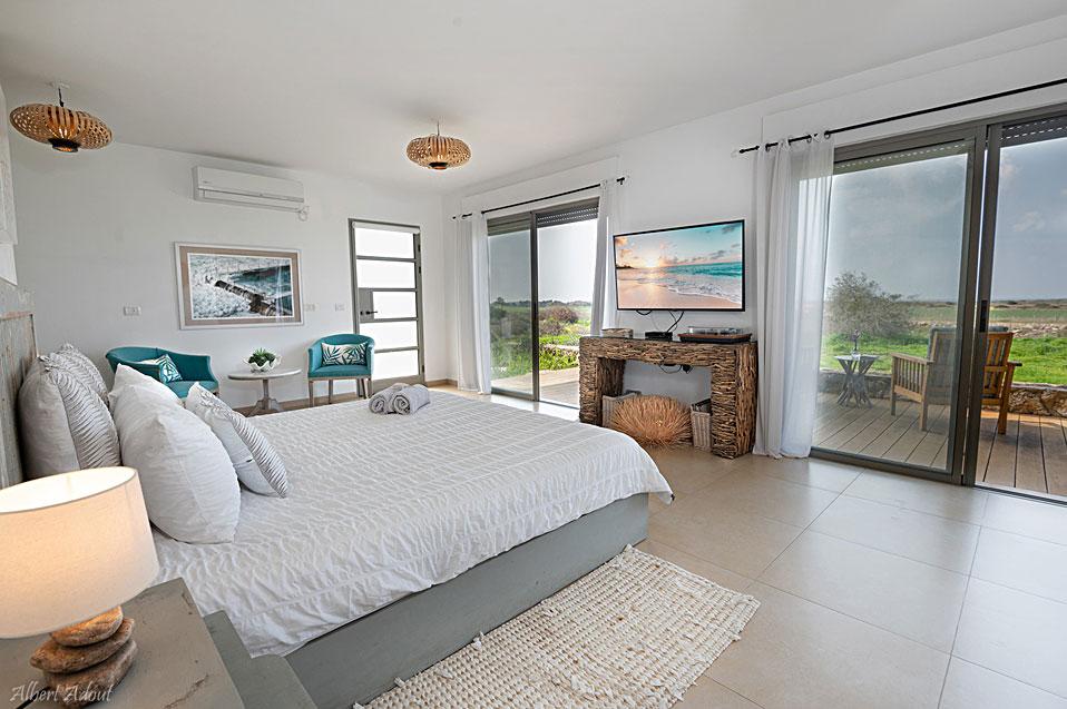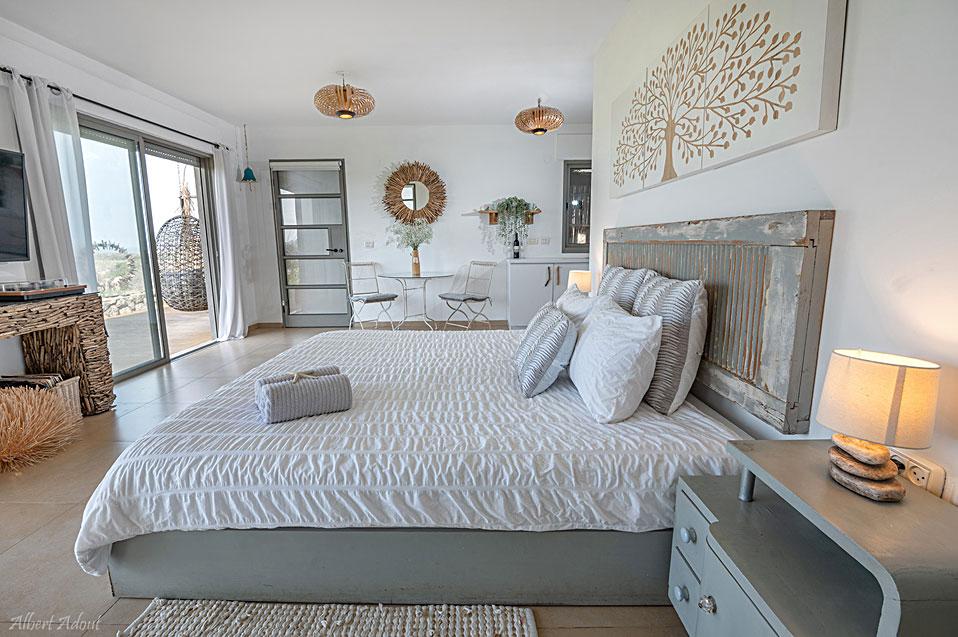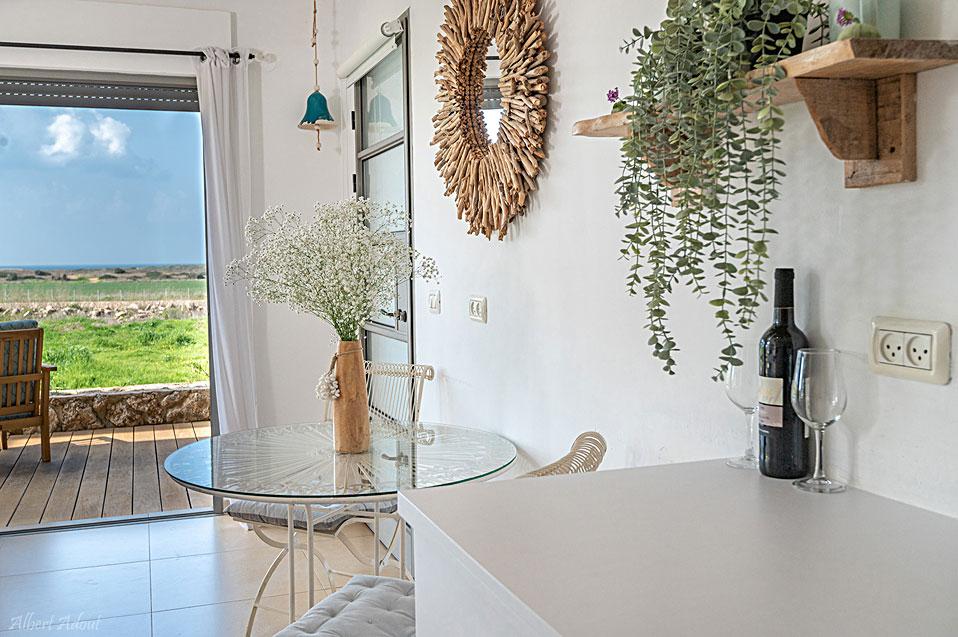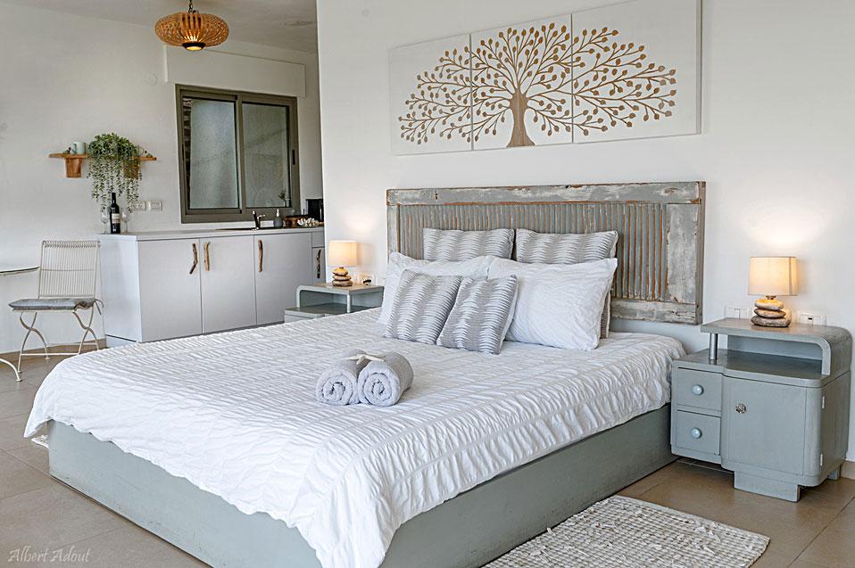 The wild fields and the beach are just a touch away from the suite. The suite is situated on its own in a natural, calm and tranquil area, with the blue-green expanses surrounding the complex, the sea breeze and the waves, creating a sense of freedom, liberation, inspiration and flight. The interior design of the suite complements the atmosphere outside, combining high aesthetics, wild nature and ananic taste, giving the place a delicate harmony flowing between exterior and interior. The inner space is made of pastel palette, made of blue tones with touches of natural wood heat. The details of the furniture and the design are characterized by a fashionable "retro" atmosphere, natural elements and a clean and precise classic line. A window door along the wall opens onto an intimate thin balcony overlooking the sea. Next to the suite is a covered area with a spa Jacuzzi surrounded by blooming vegetation. In the distant landscape, occasional trains pass through, adding to the pastoral picture a unique touch. The rare location of B & B, which is located a short drive from the center of the country, offers a variety of cultural entertainment, art and culinary experiences in the Ein Hod Artists Village and the tourist town of Zichron Yaacov, a few minutes, drive away.