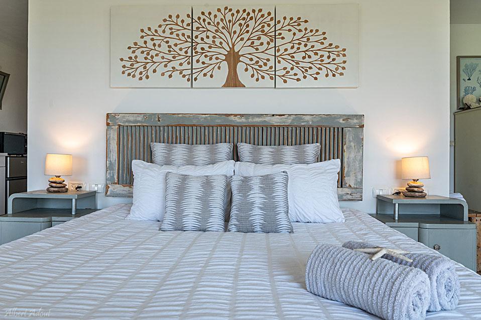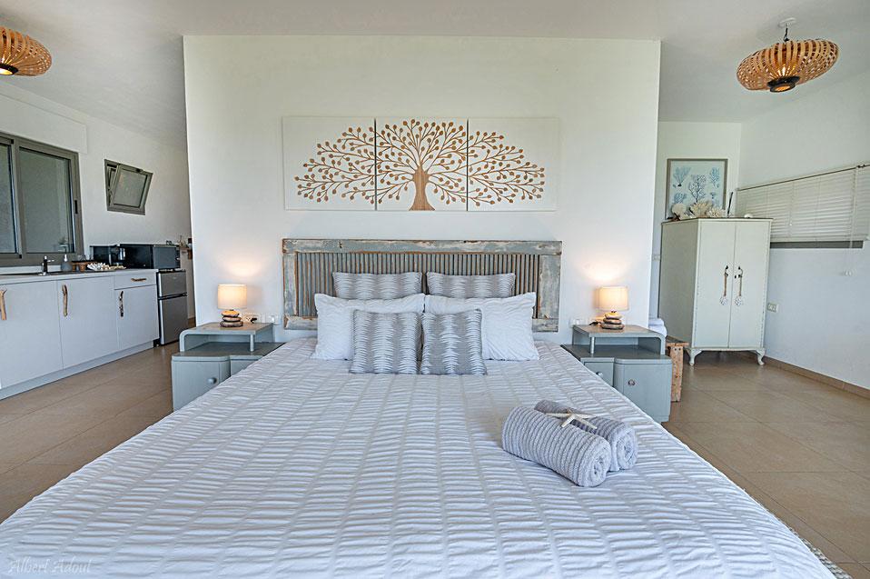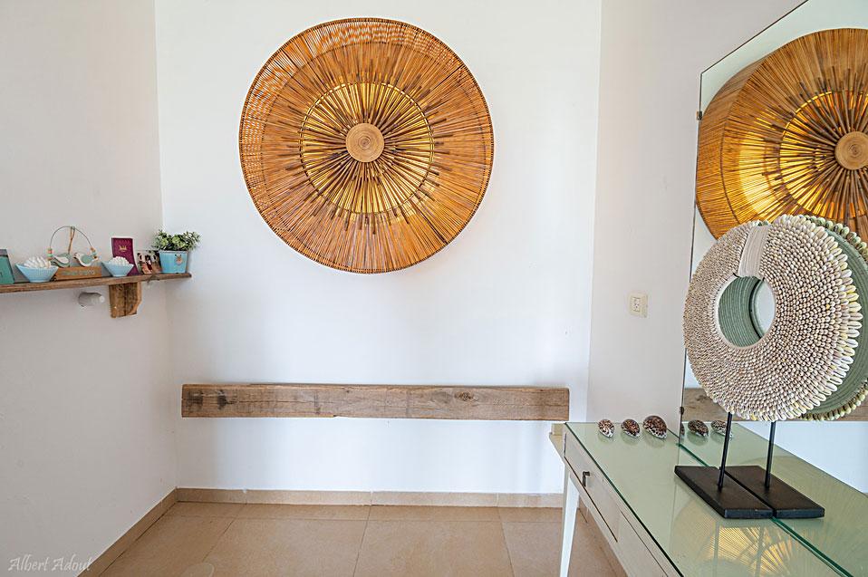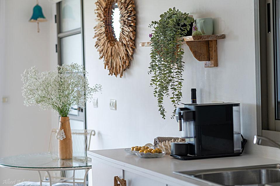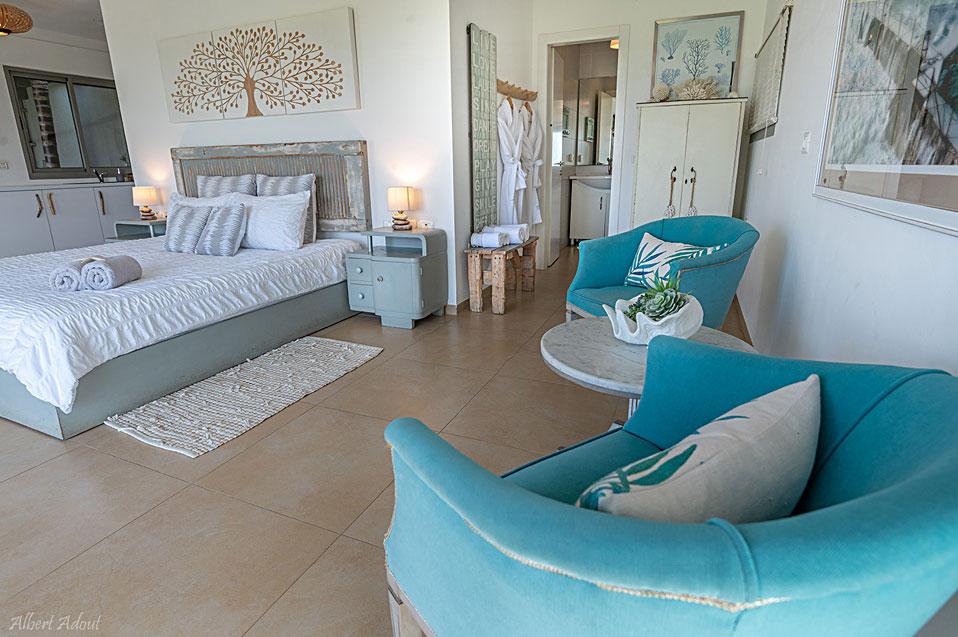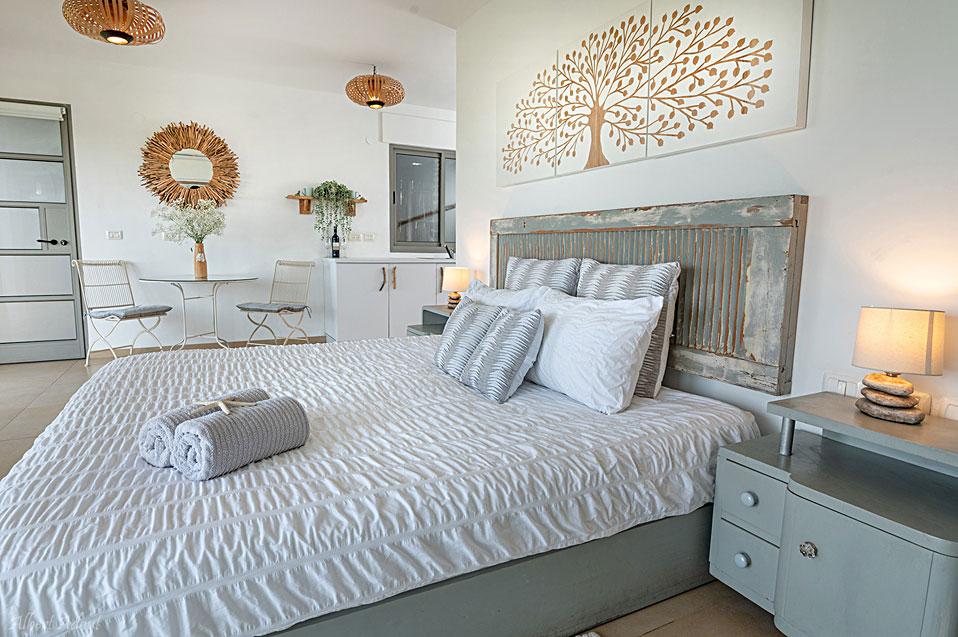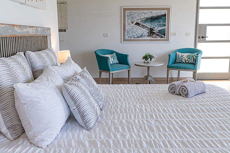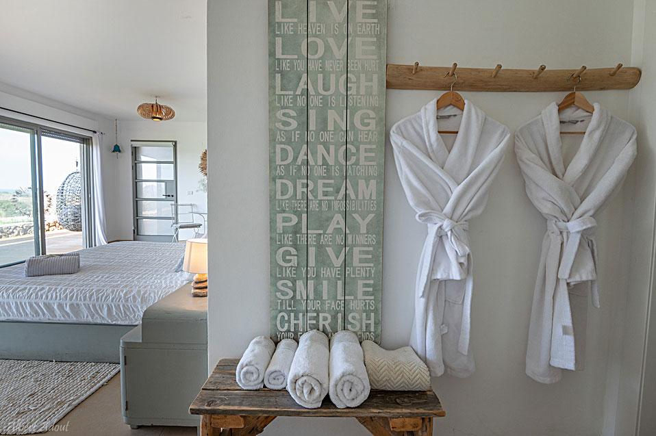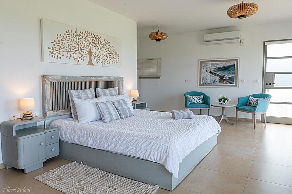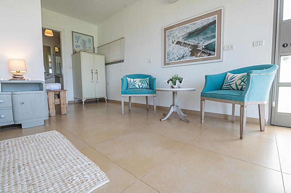 The wild fields and the beach are just a touch away from the suite. The suite is situated on its own in a natural, calm and tranquil area, with the blue-green expanses surrounding the complex, the sea breeze and the waves, creating a sense of freedom, liberation, inspiration and flight. The interior design of the suite complements the atmosphere outside, combining high aesthetics, wild nature and ananic taste, giving the place a delicate harmony flowing between exterior and interior. The inner space is made of pastel palette, made of blue tones with touches of natural wood heat. The details of the furniture and the design are characterized by a fashionable "retro" atmosphere, natural elements and a clean and precise classic line. A window door along the wall opens onto an intimate thin balcony overlooking the sea. Next to the suite is a covered area with a spa Jacuzzi surrounded by blooming vegetation. In the distant landscape, occasional trains pass through, adding to the pastoral picture a unique touch. The rare location of B & B, which is located a short drive from the center of the country, offers a variety of cultural entertainment, art and culinary experiences in the Ein Hod Artists Village and the tourist town of Zichron Yaacov, a few minutes, drive away.