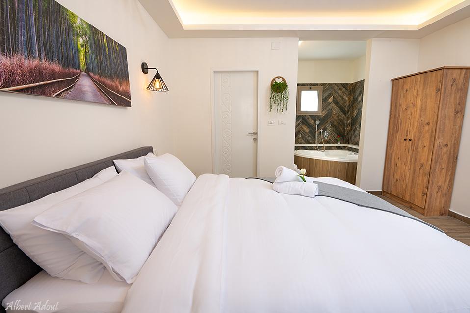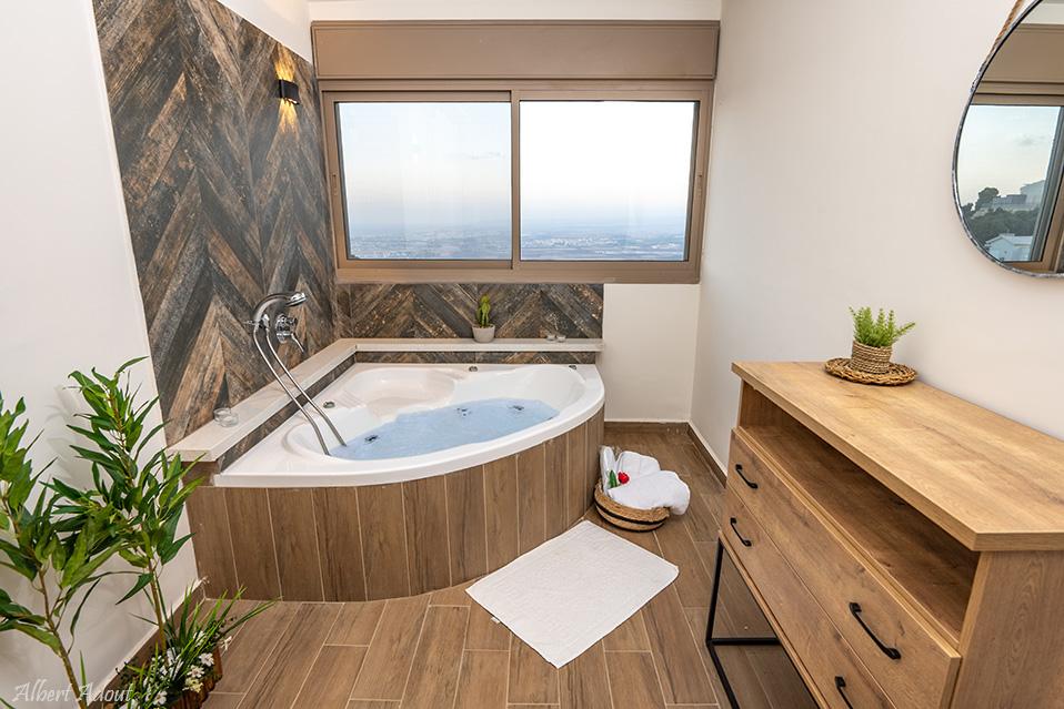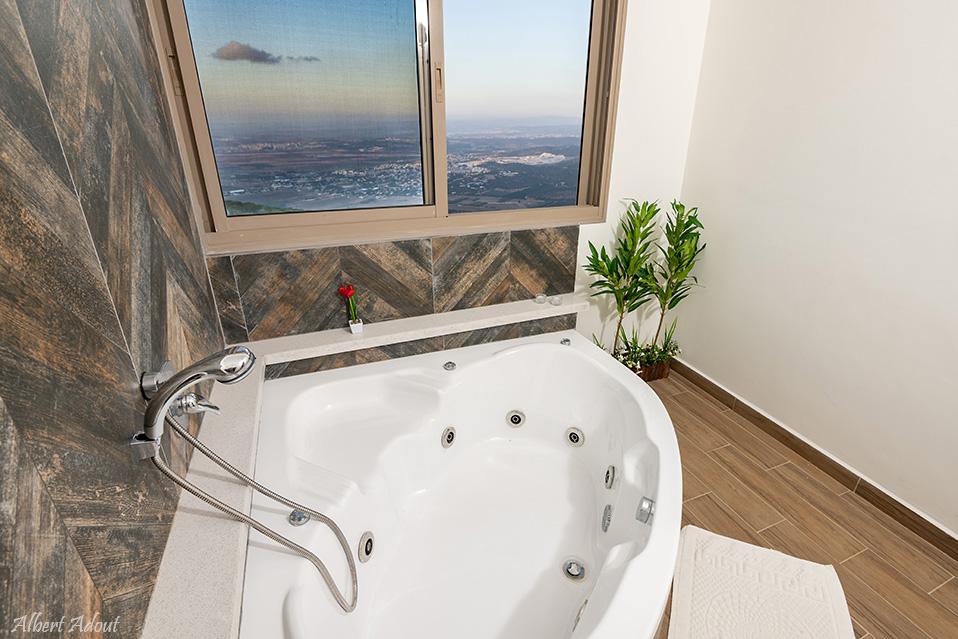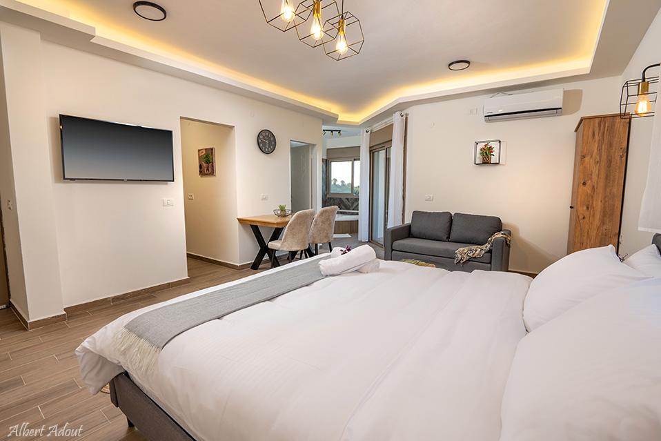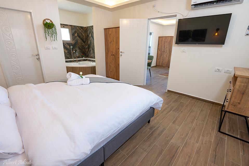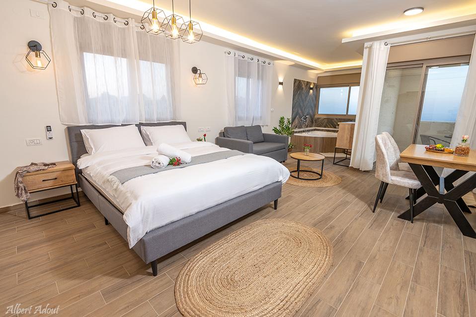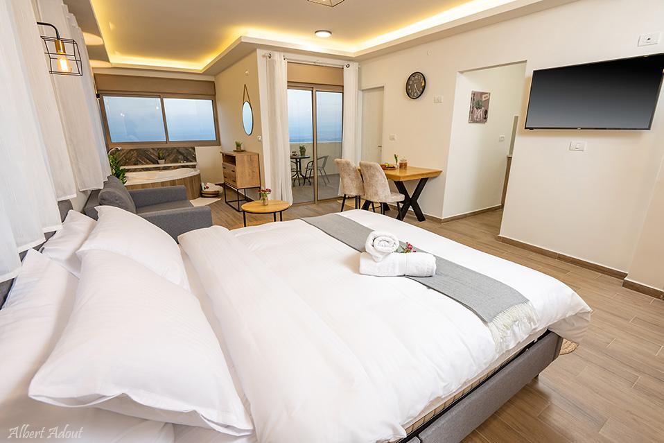 סוויטת אירוח בקומה העליונה הכוללת מרפסת נוף פרטית, חדר ג'קוזי, חלל פתוח גדול עם ספה נפתחת ל-2 ילדים, מיטת הורים אורטופדית, מסך LCD, מטבח וג'קוזי פרטי.