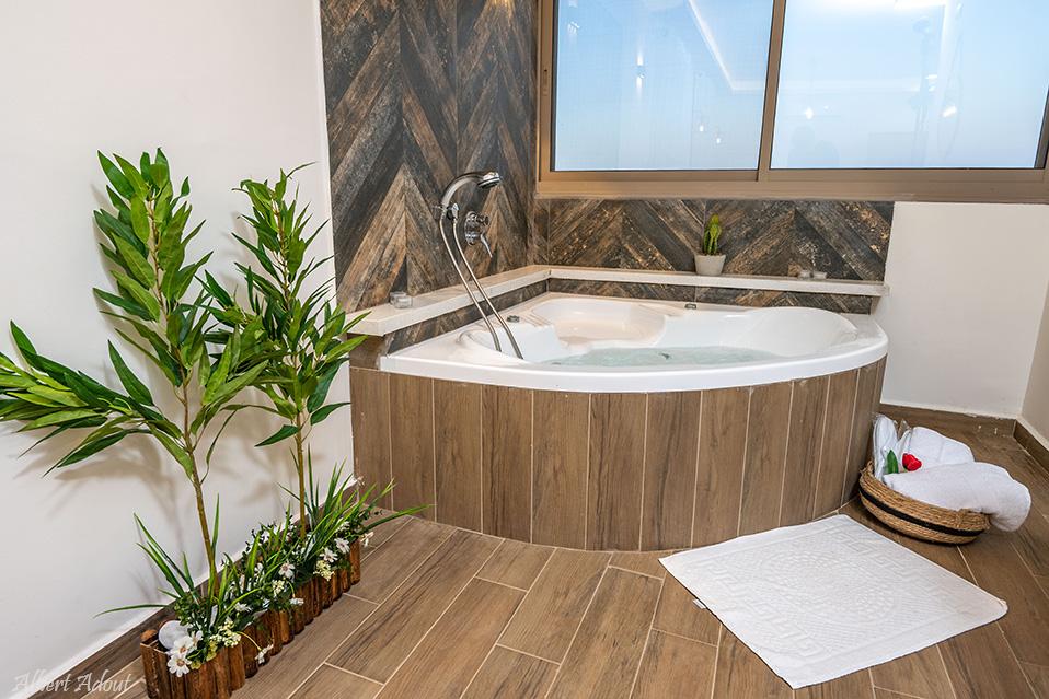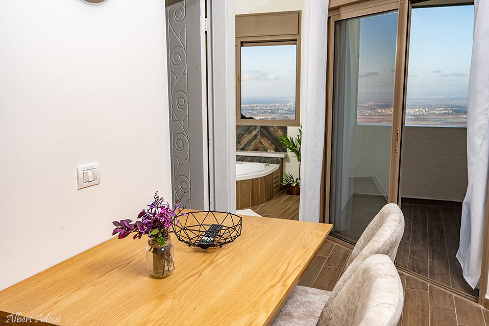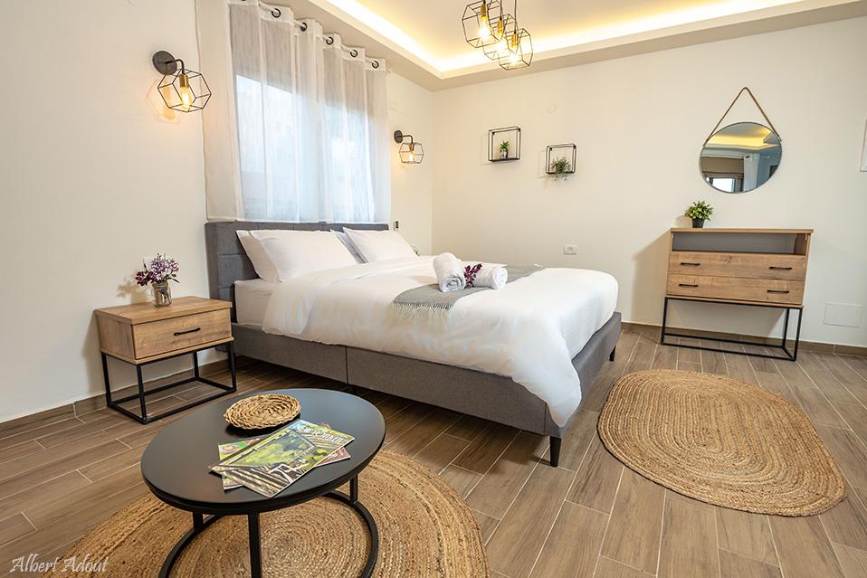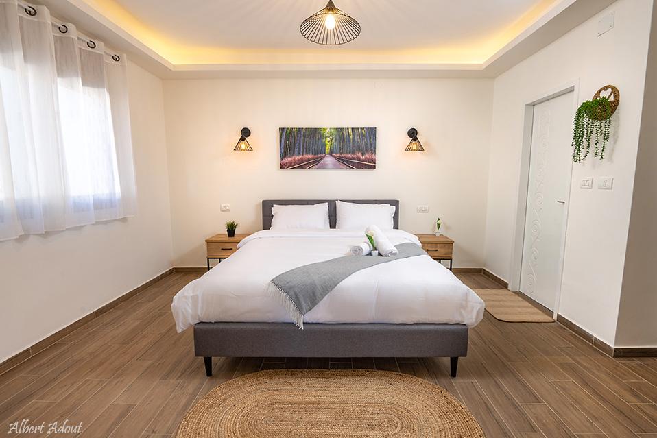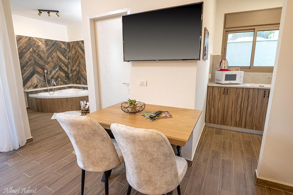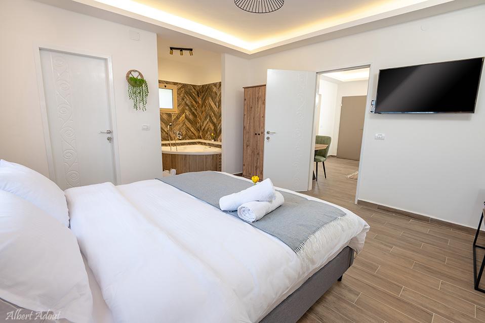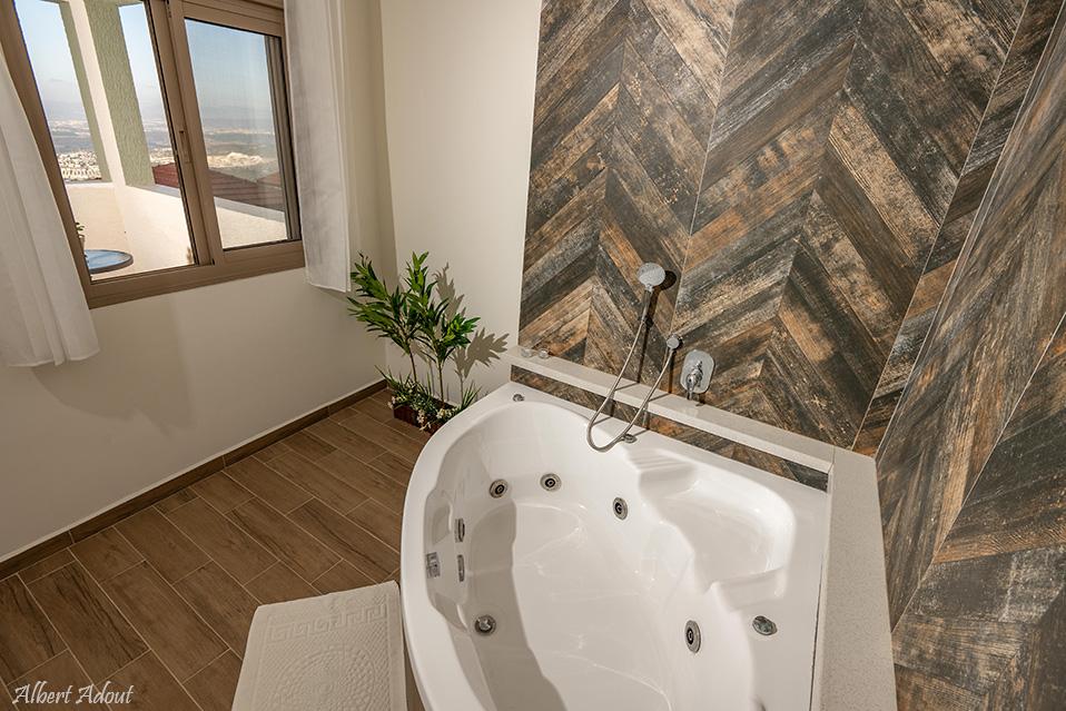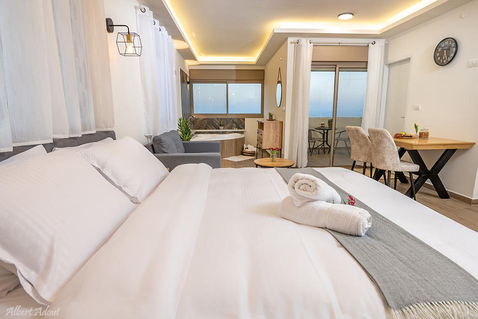 סוויטת אירוח בקומה העליונה הכוללת מרפסת נוף פרטית, חדר ג'קוזי, חלל פתוח גדול עם ספה נפתחת ל-2 ילדים, מיטת הורים אורטופדית, מסך LCD, מטבח וג'קוזי פרטי.