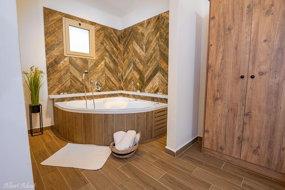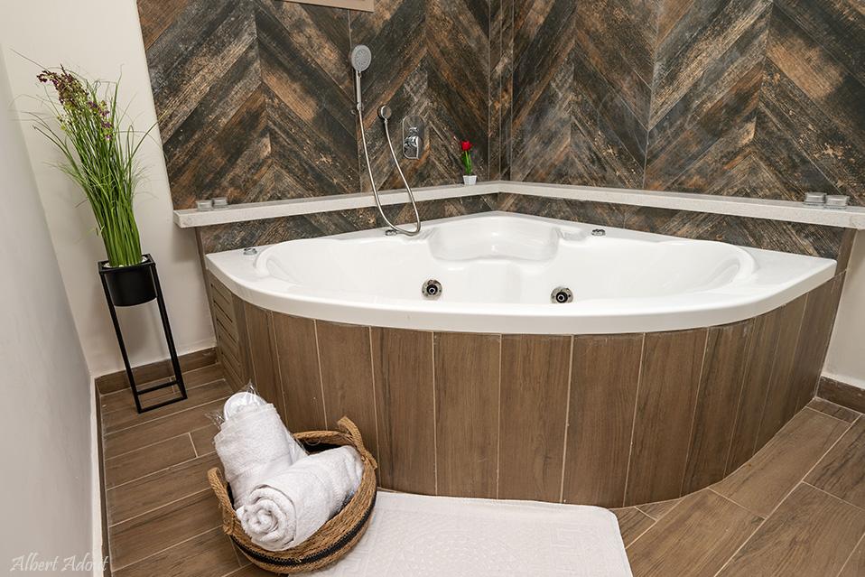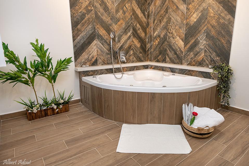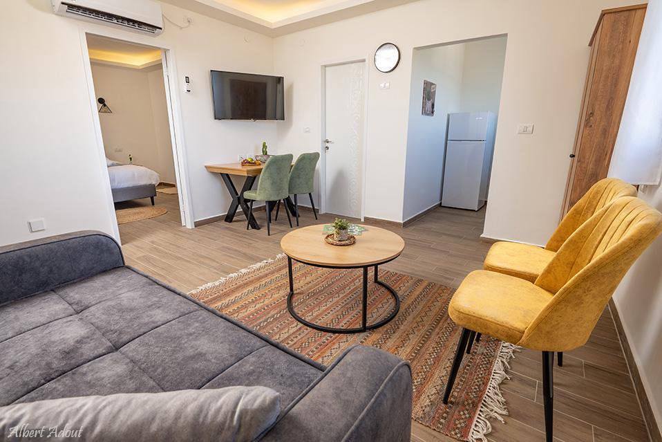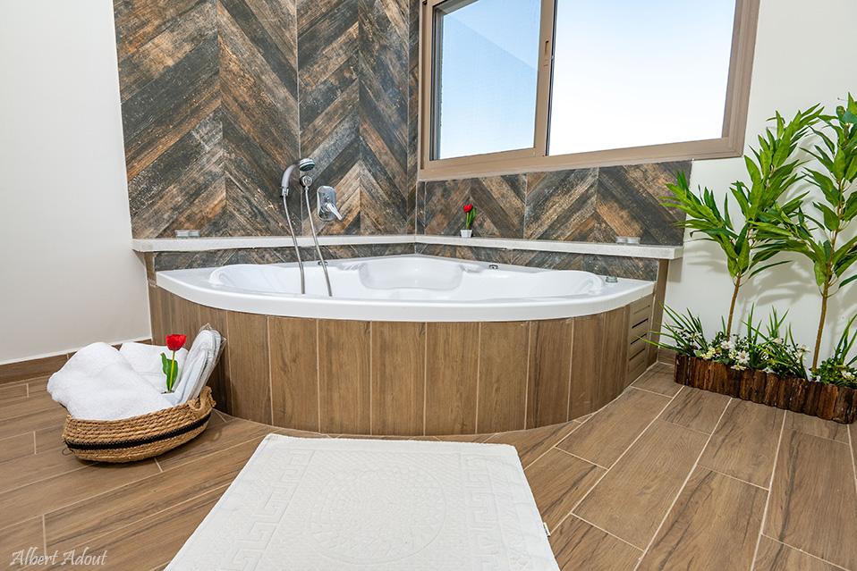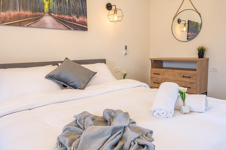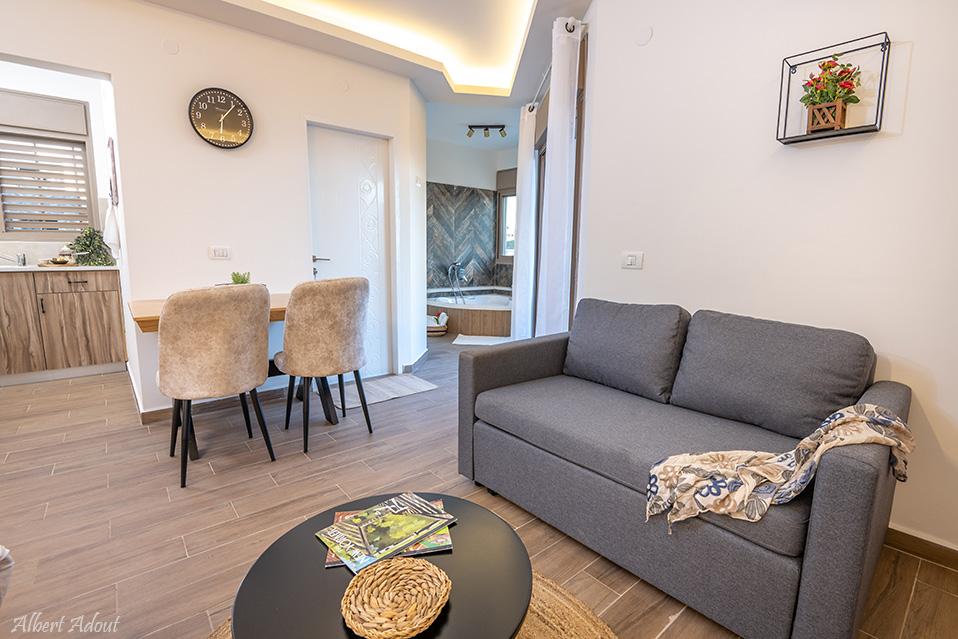 סוויטת אירוח בקומה העליונה הכוללת מרפסת נוף פרטית, חדר ג'קוזי, חלל פתוח גדול עם ספה נפתחת ל-2 ילדים, מיטת הורים אורטופדית, מסך LCD, מטבח וג'קוזי פרטי.