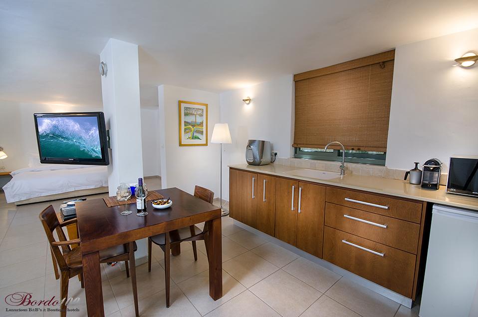 Сад окружен уютными уголками для отдыха и перголой с очаровательным видом, откуда открывается панорамный вид на море и горы Кармель. В люксах гости найдут очень большое двухместное джакузи, большие двуспальные кровати с ортопедическим матрасом Hollandia, гостиную с широким диваном и уютную обеденную зону рядом с мини-кухней. В каждом люксе есть просторный крытый балкон.