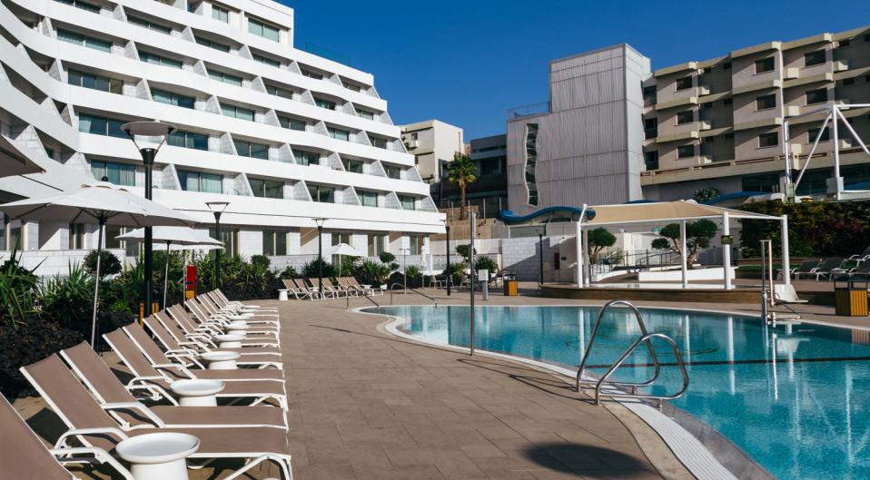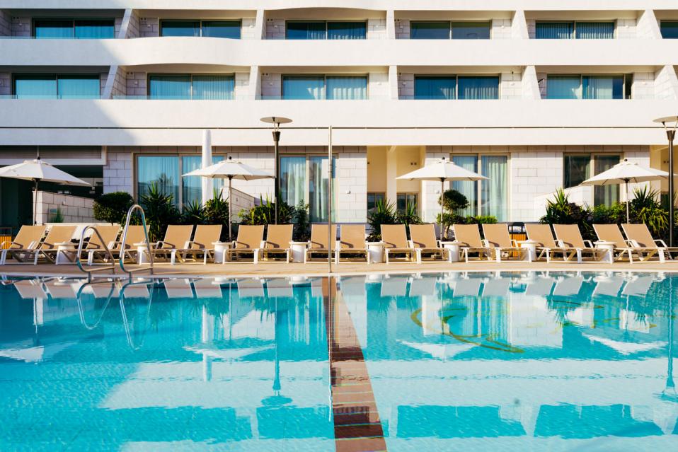 Открытый сезонный бассейн с шезлонгами и зонтиками.