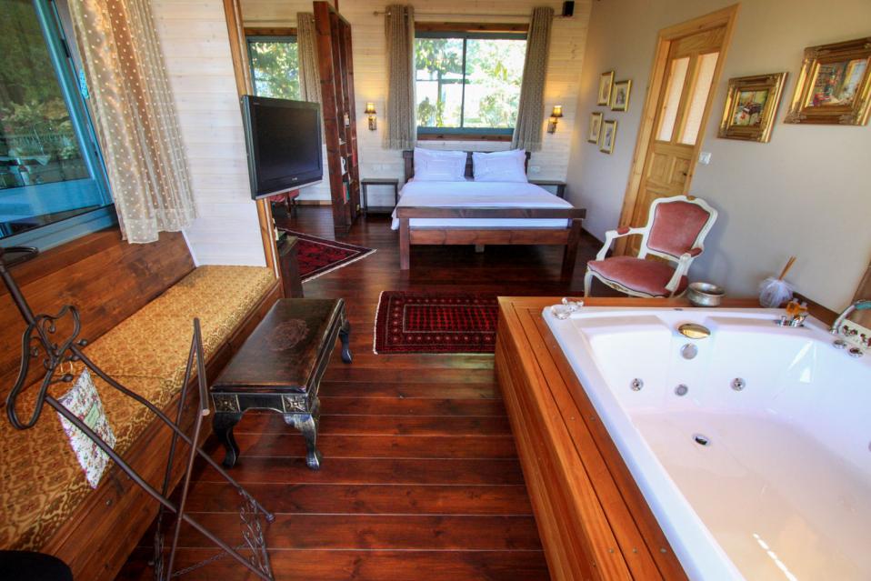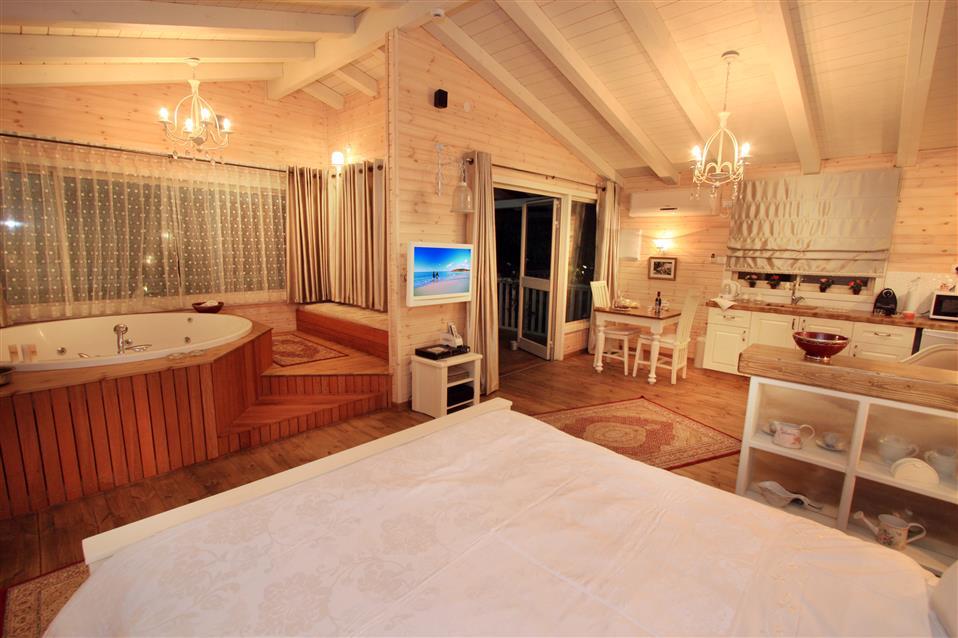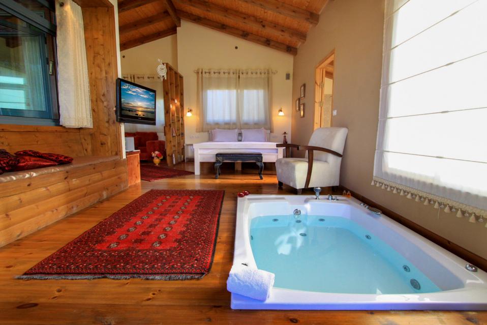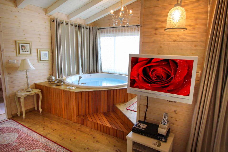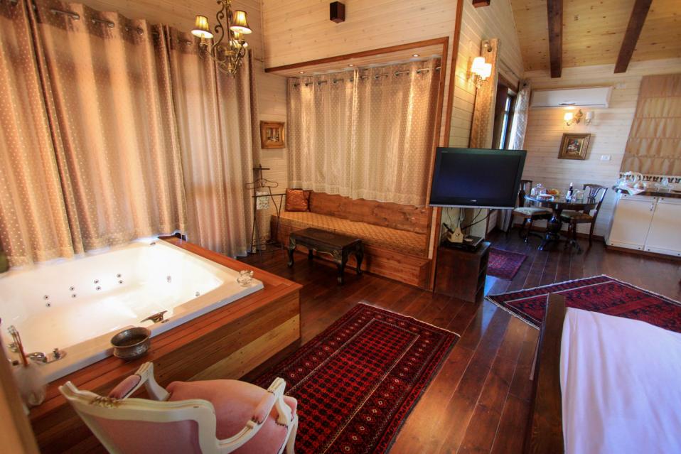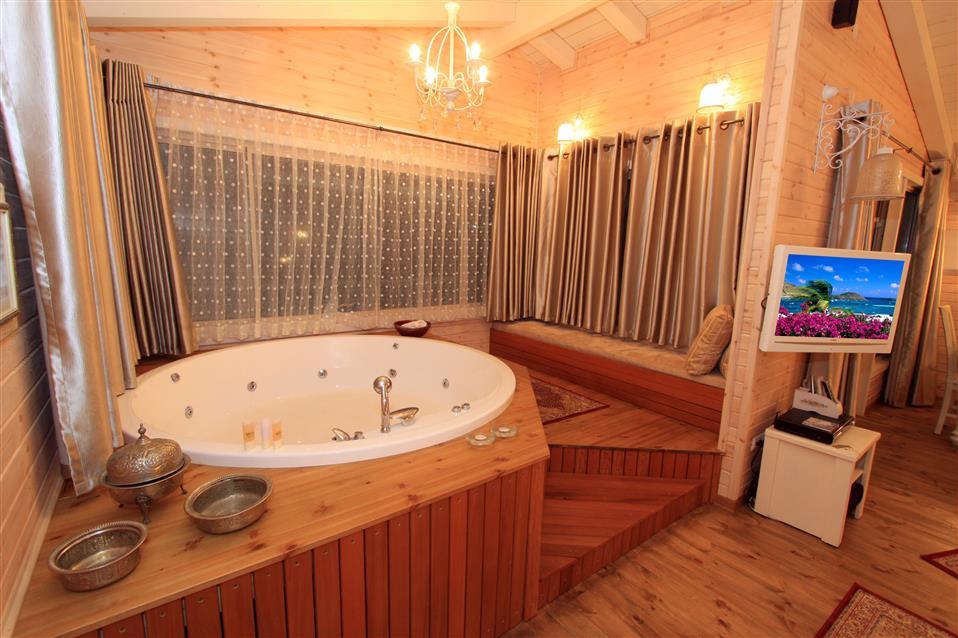 В каждом из люксов вы найдете большой джакузи, спальную кровать с ортопедическим матрасом, телевизор с кинотеатром, подключенным к каналам YES, обеденную зону и журнальный столик. В мини-кухне есть микроволновая печь, холодильник, чайник и кофеварка эспрессо, а в просторной ванной комнате - скамейка рядом с тропическим душем.